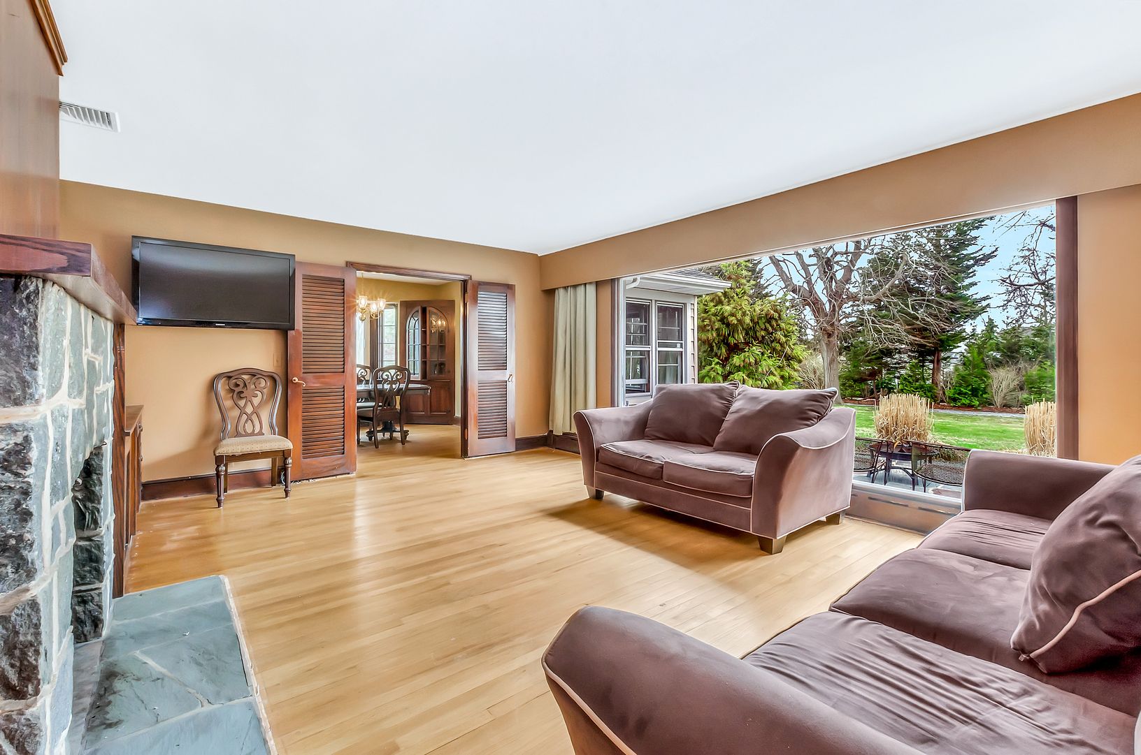 Nestled on a beautiful street this unique waterfront ranch exudes simple charm. Offering two bedrooms, one and a half bathrooms, a large eat-in kitchen, a living room with built-ins, a fireplace, and amazing views. This home also features a two-car garage, a full finished basement with a full bar, fireplace, bunk-room, canning pantry and a workshop. The grounds are expansive and secluded, with room for a pool and tennis on a little more than a