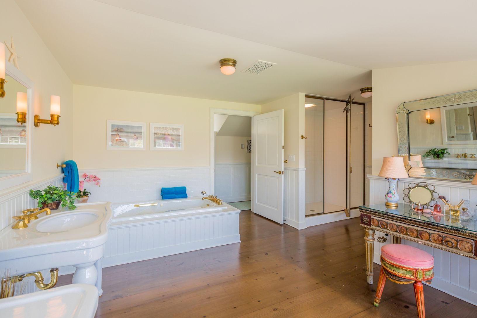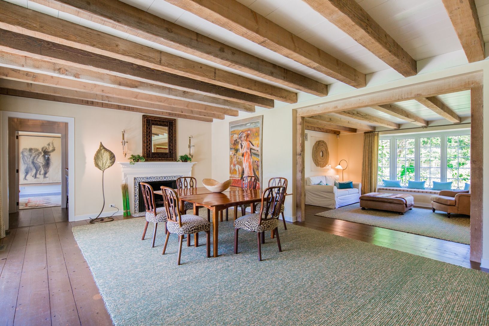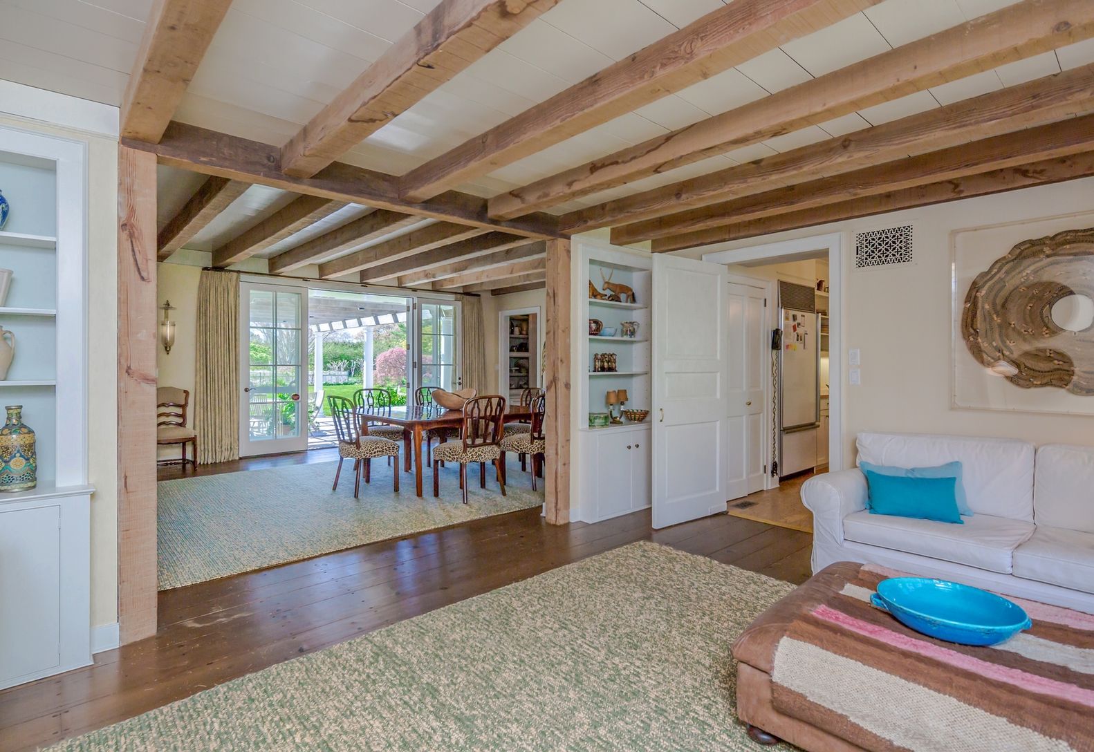 Hear the waves from this 2.3 acre secluded oasis located one residence away from the ocean beach. Discover this pastoral setting at the end of a long meandering driveway to serene privacy. The classic 1909 Traditional retains authentic charm with original wood beams that frame soaring angular ceilings, a massive living room hearth and wide plank pine flooring. The interior has excellent separation of space with private wings that hold 7 bedroo