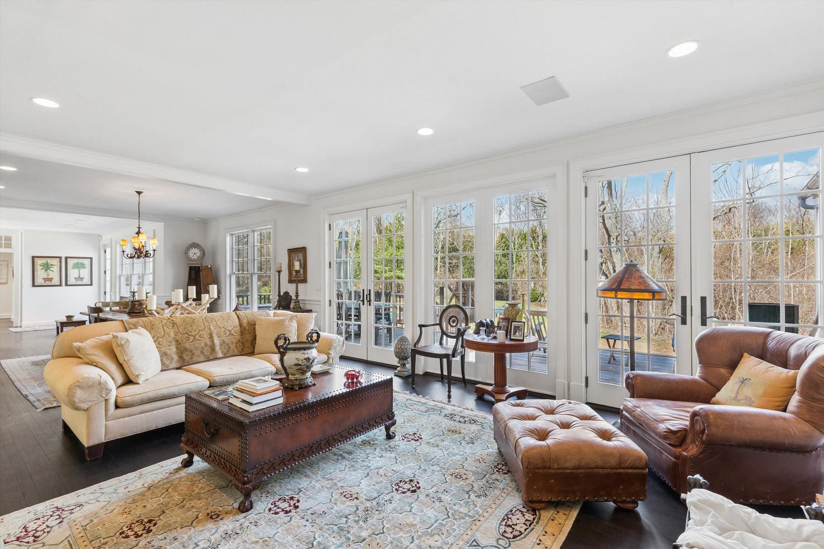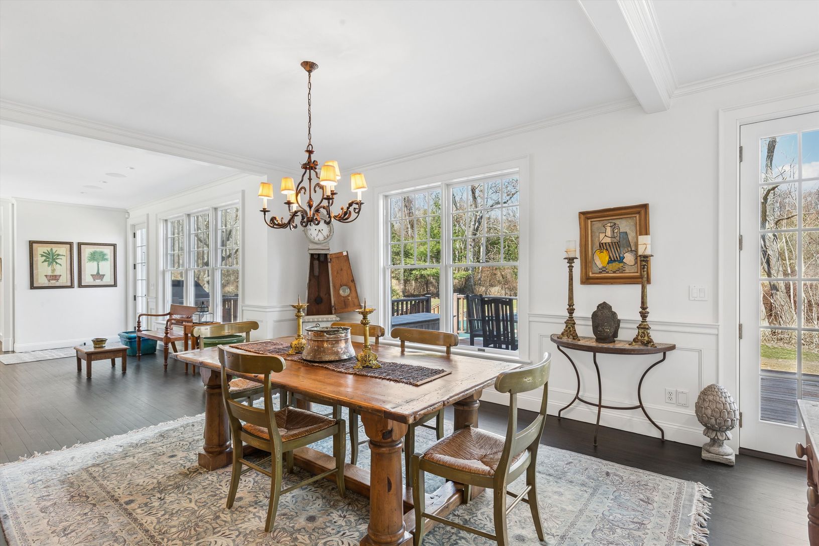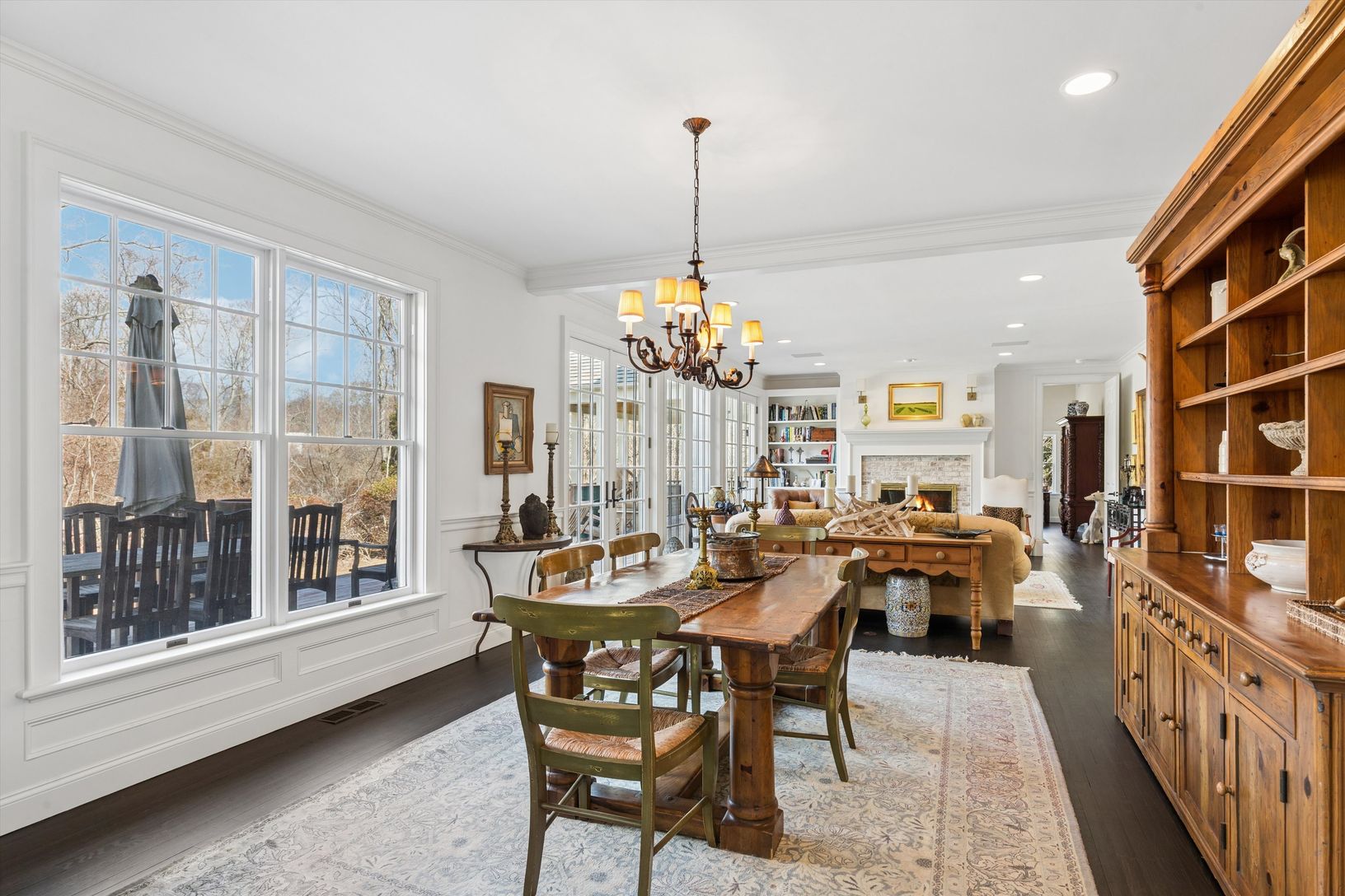 Beautifully situated within 2 +/- acres, this fantastic property features complete privacy and peacefulness. A formal entry foyer leads to several spectacular entertaining spaces throughout the first floor. The home has a casual living room with wood burning fireplace, dining room, family/TV room and stunning newly renovated Chefs kitchen complimented by a center Island, all leading to an expansive deck with vaulted ceiling outdoor lounge and