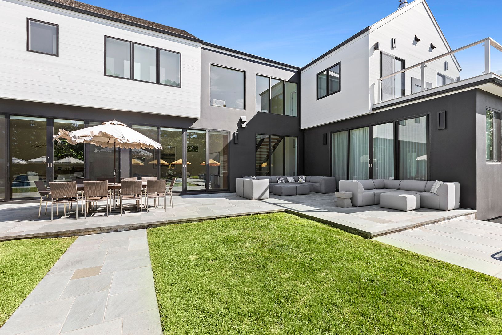 New Rental Exclusive, available off season. This modern, 10,000 sq. ft, 7-bedroom estate with Tennis was designed to have every amenity. The home boasts a 50' heated pool, hot tub, covered outdoor space, sunken all-weather tennis and even basketball. The sleek home sits atop a private 6-acre property, surrounded by lush landscape and open lawn. Drive past open fields on Lopers Path, with vistas to the ocean, onto Old Sag Harbor Road, a private