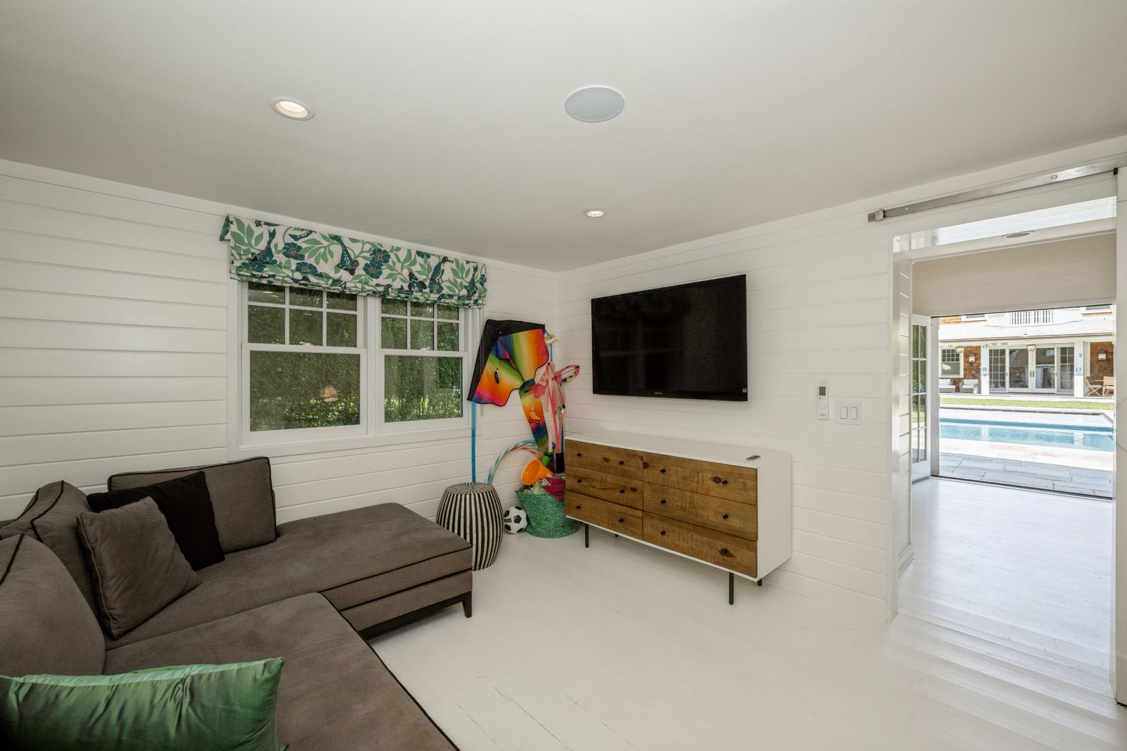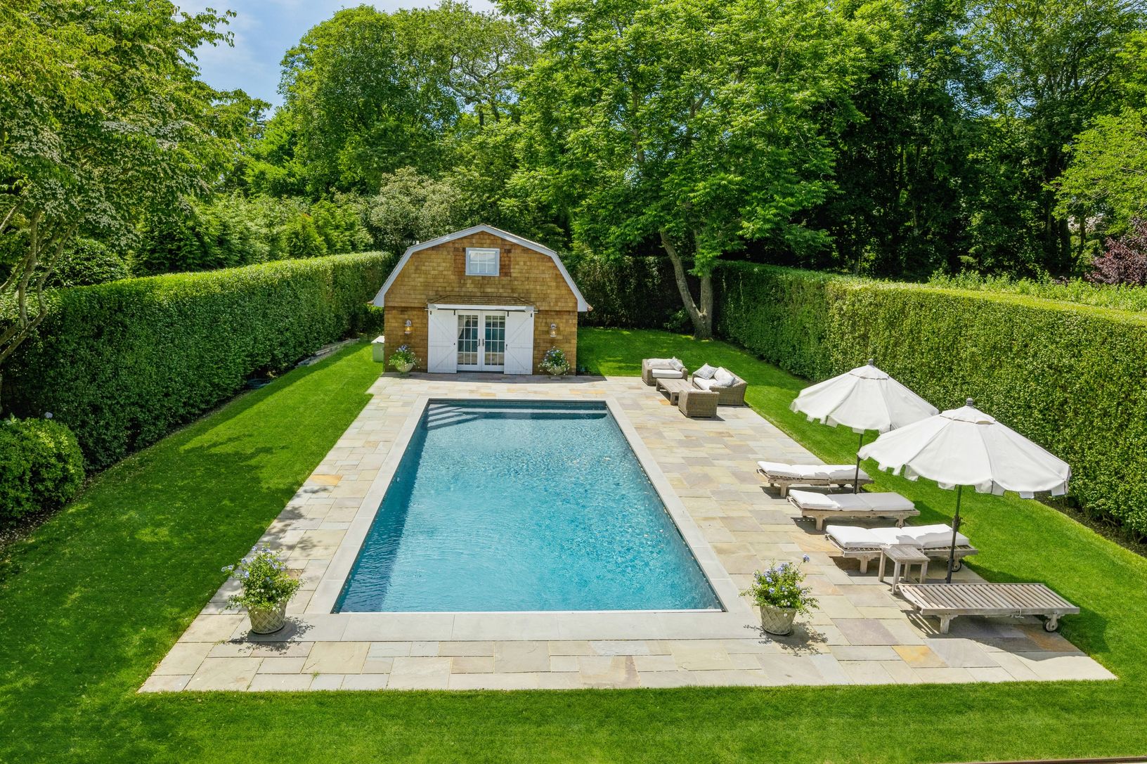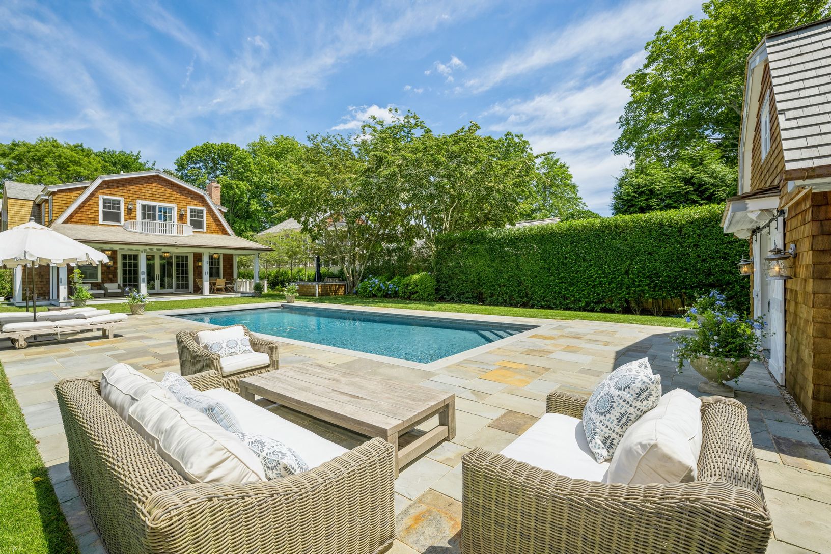 Only a few moments to Main Street or a few blocks to the beach, this beautifully designed Traditional style estate is ready for immediate August occupation. Boasting 6 bedrooms, 5 full baths and 2 half baths in the main house and a large pool house with a full bath, living room with kitchenette and bonus hang out spaces, there is room for everyone. Enjoy the saltwater pool with electric cover, the lovely gardens, relax on the covered porch wit