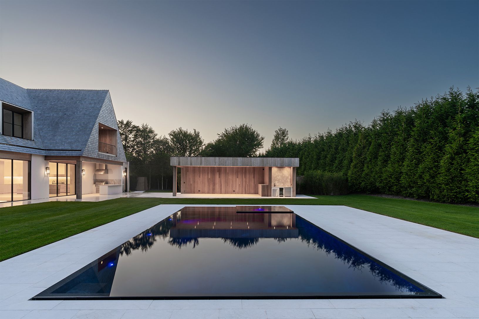 Located south of the highway in Water Mill, 91 Swans Neck Lane is a 10,400 SF+/- new construction estate. Set on nearly 1 acre, the property features a total of 8 bedrooms, 9 full and 3 half bathrooms inclusive of a finished lower level with a full staff apartment. Additional features include a detached 3-car garage, a pool cabana, and a heated gunite pool and spa. Indulge in the ultimate luxury lifestyle at 91 Swans Neck Lane, where leisure a