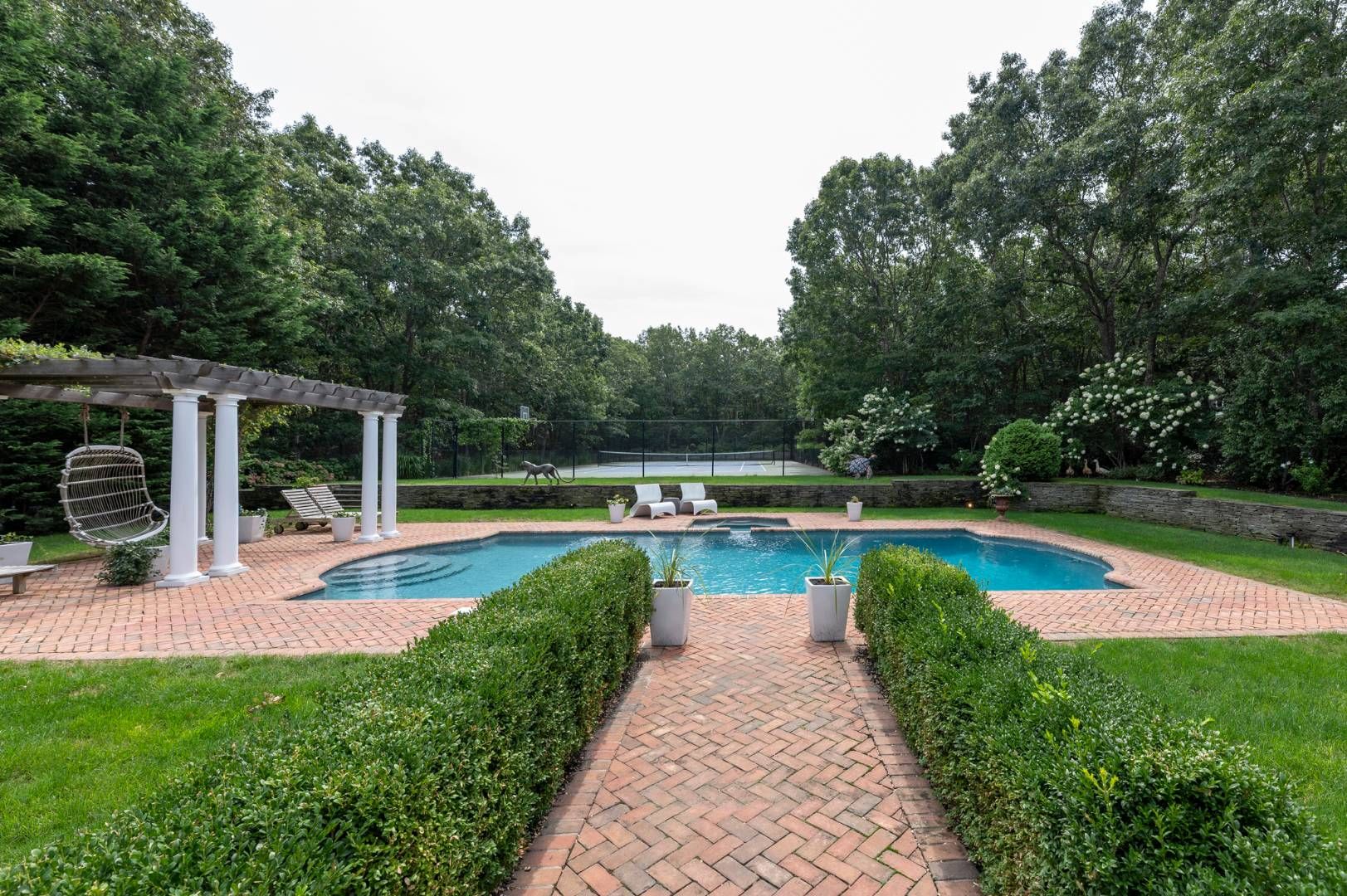 On a quiet street in Sag Harbor this beautifully maintained shingled traditional truly has it all...1.7 acres with a heated gunite pool, spa, Har-Tru tennis, home office and area for a gym. The first floor living areas include a living room with fireplace, coffered ceiling and French doors to leading to family room, eat-in kitchen with island seating, high end stainless steel appliances and tiled backsplash, and formal dining room served by a
