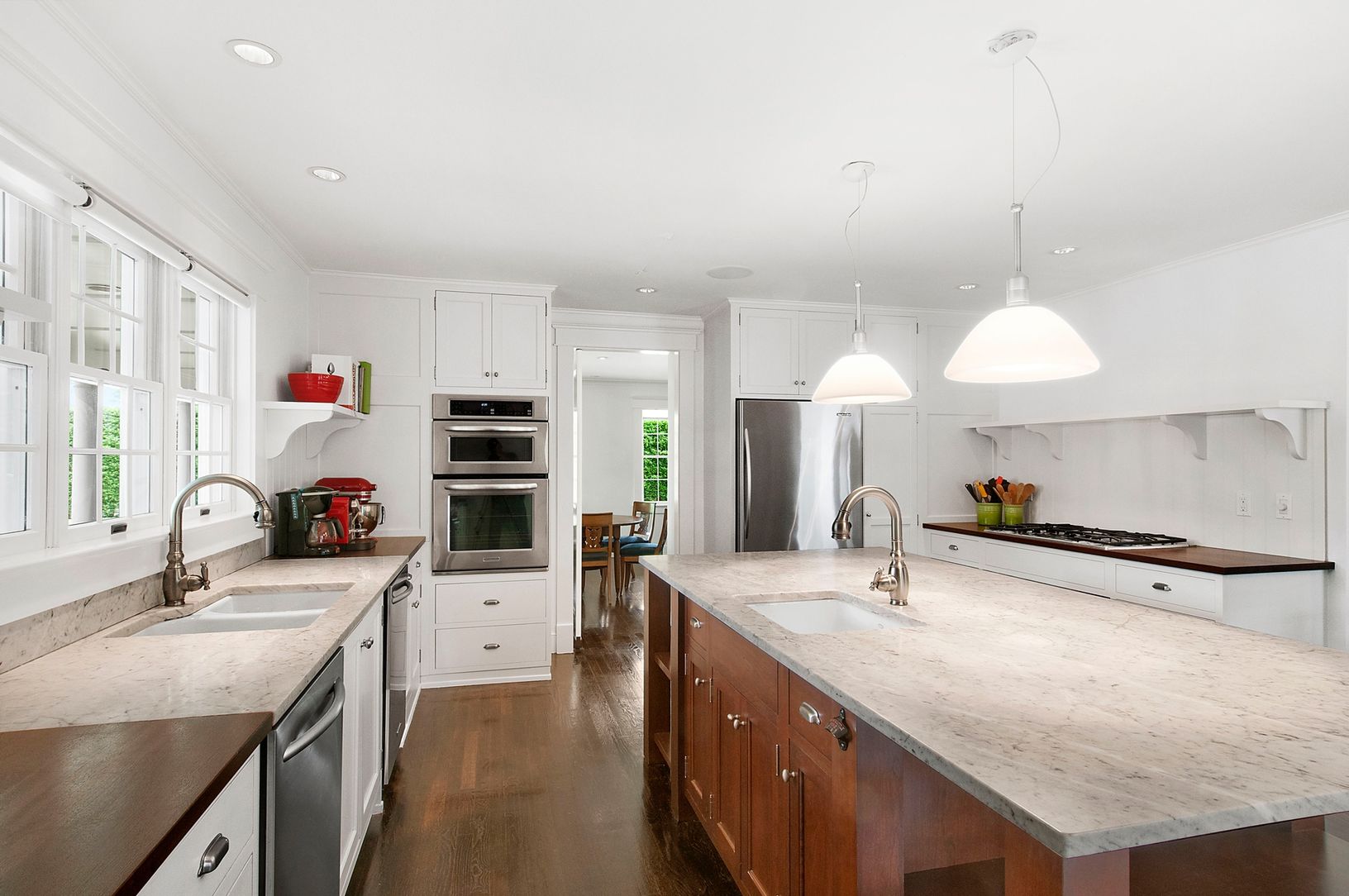 Picture perfect 5 bedroom Traditional in a quiet South of the Highway location in Water Mill. Colonnaded wrap-around porch recalls charming Hamptons farmhouses, while inside the layout is easy and open. Ground floor features living and formal dining rooms each with fireplaces, and open chef's kitchen with adjacent sitting area and fireplace. Flanked by a wall of french doors leading to a screened in porch spanning the entire back of the home,