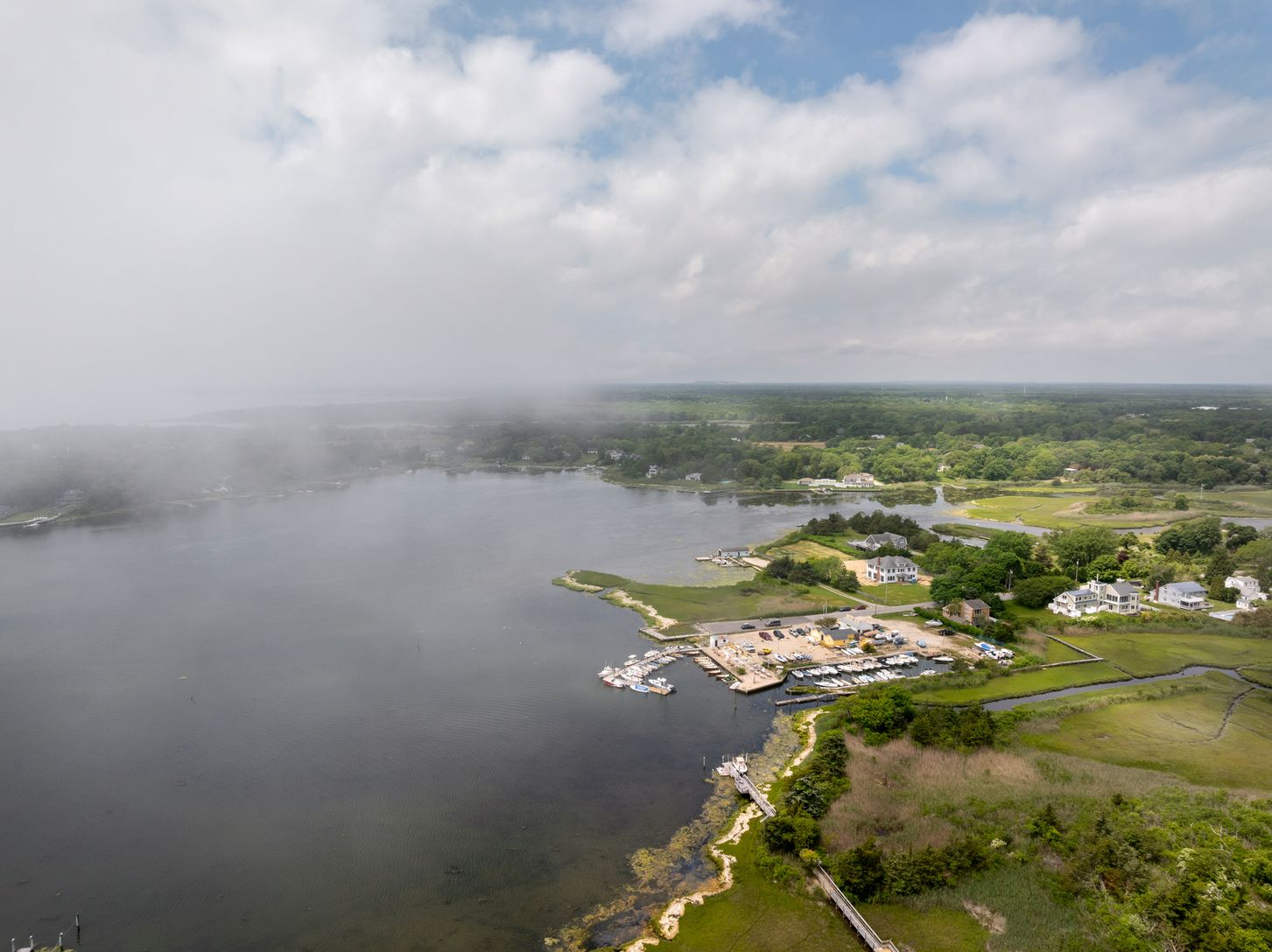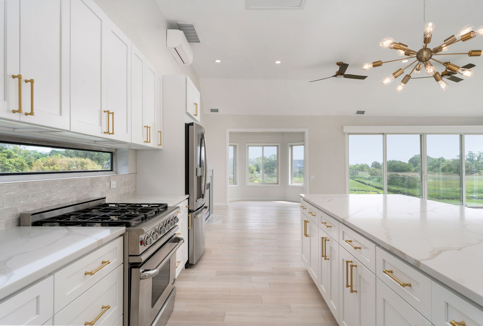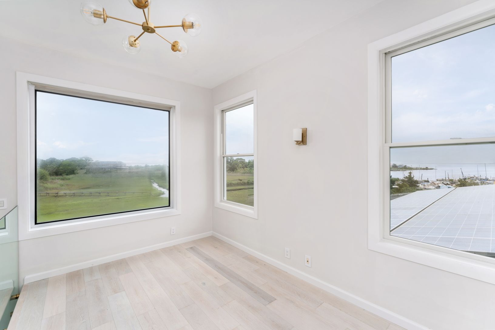 Impeccably renovated from top to bottom, this stylish four-bedroom contemporary is located on the water in East Moriches with a private dock.
