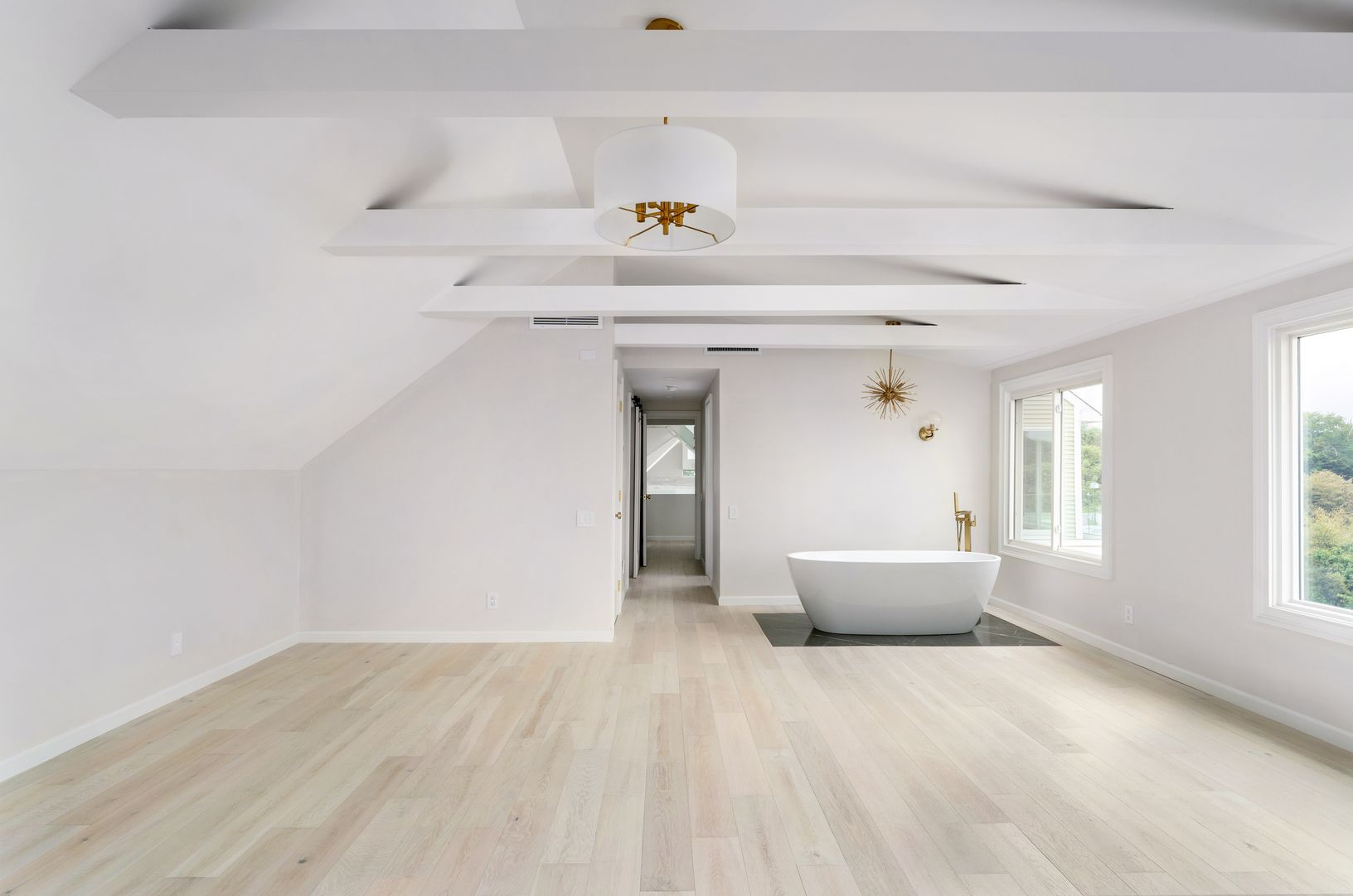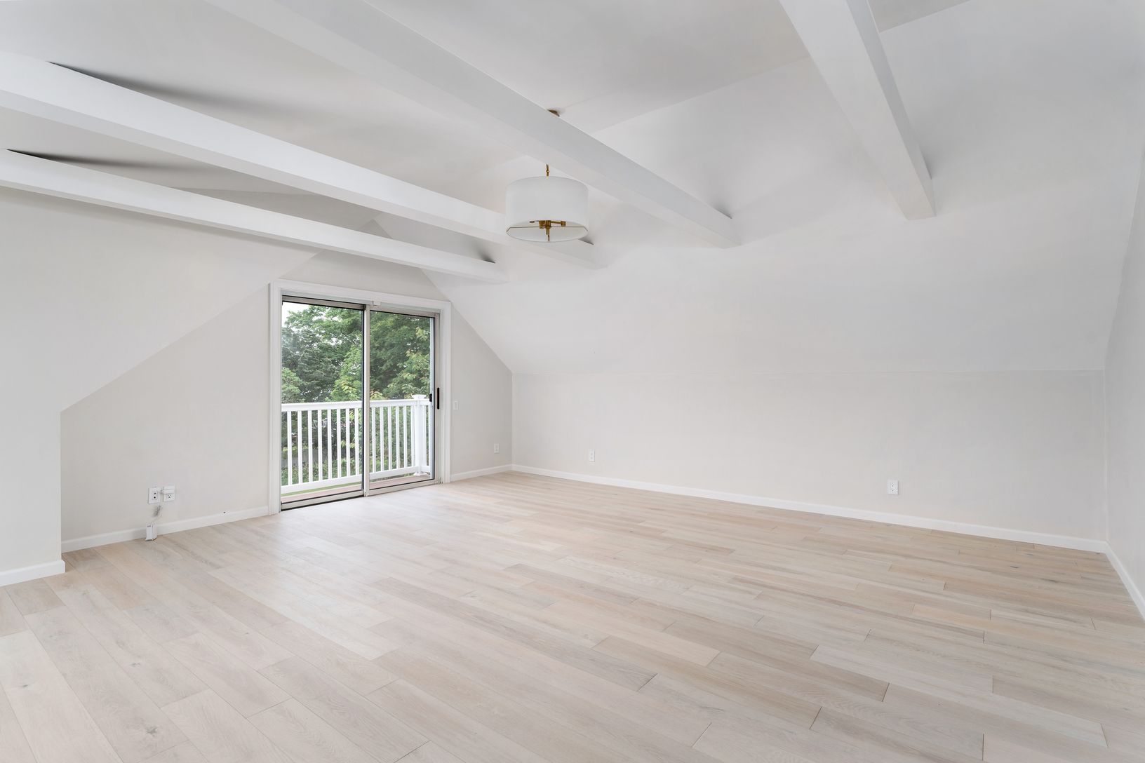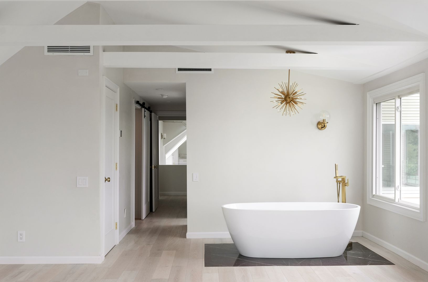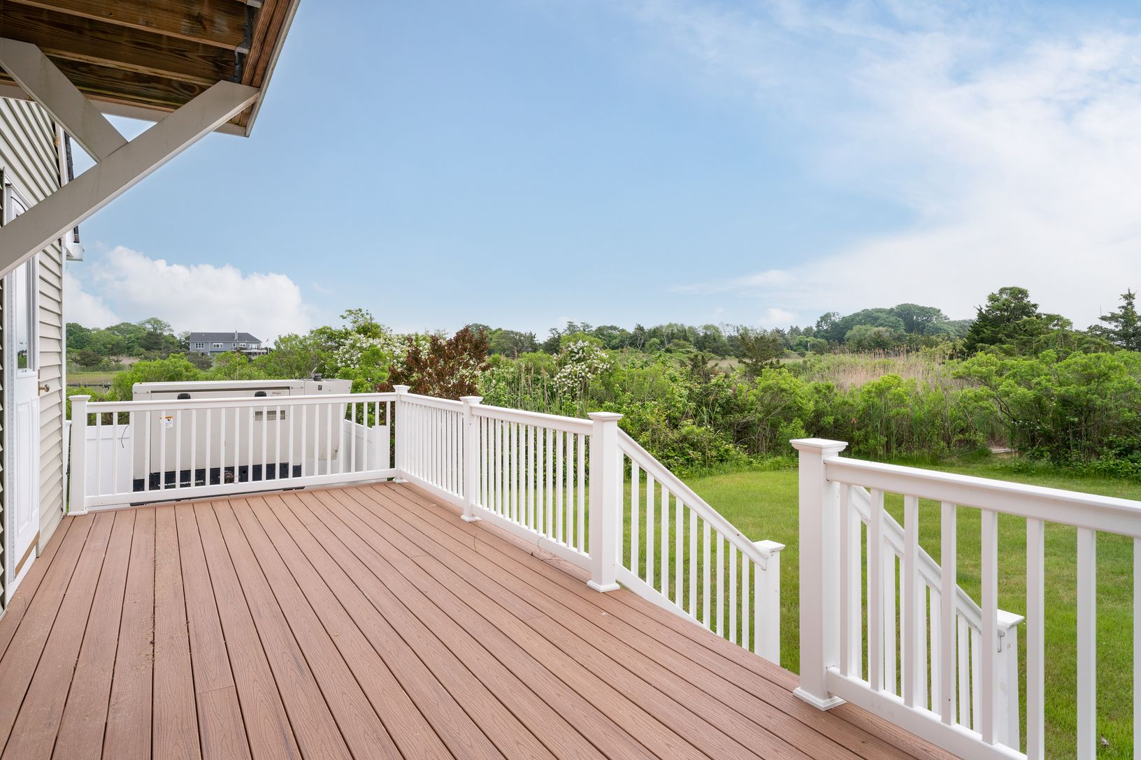 Impeccably renovated from top to bottom, this stylish four-bedroom contemporary is located on the water in East Moriches with a private dock.