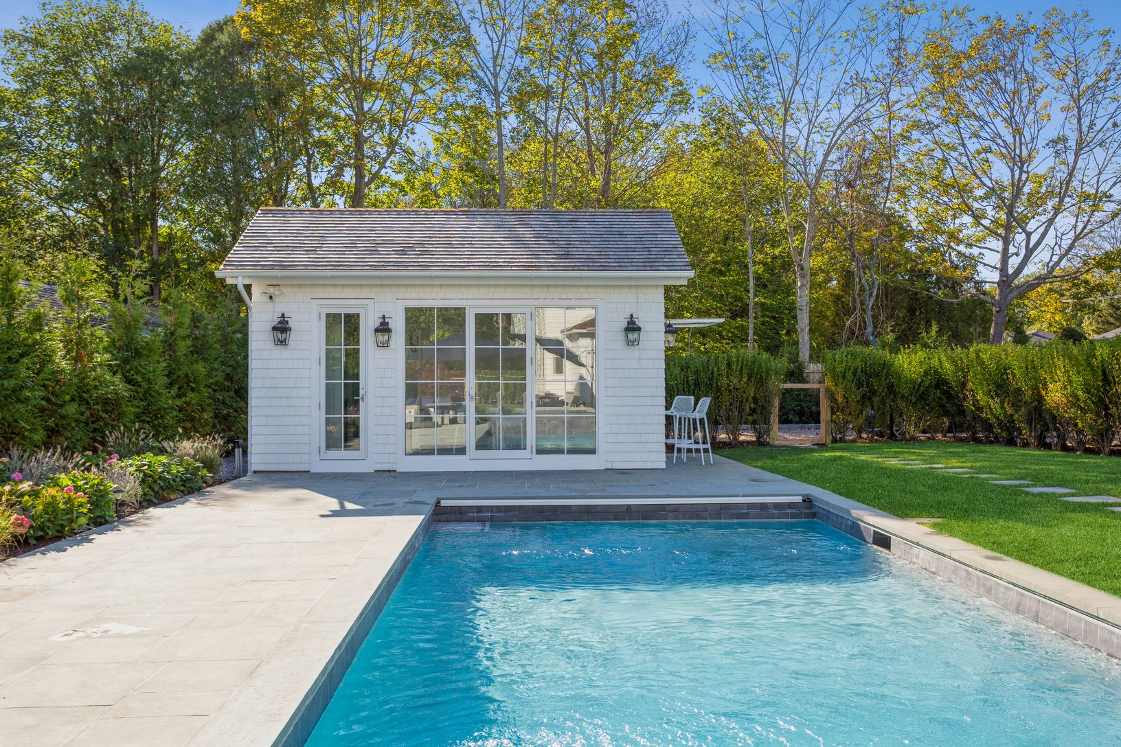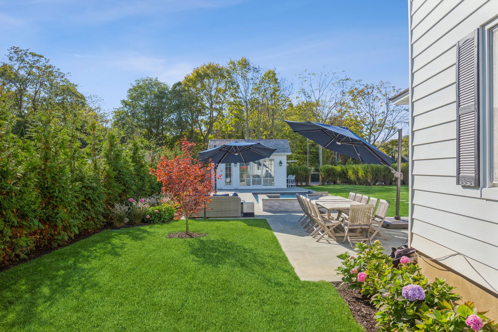 Perfect Hamptons getaway situated in the village. With ease to get to all shops, restaurants, ocean beaches, and markets. Or stay home relaxing poolside and have a BBQ. A spectacular outdoor living space has been created complete with pool house with a kitchenette, wet bar, 65" television and a third full bathroom. The newly planted lush landscape offers you a private backyard oasis. This newly, tastefully renovated home offers you the luxury