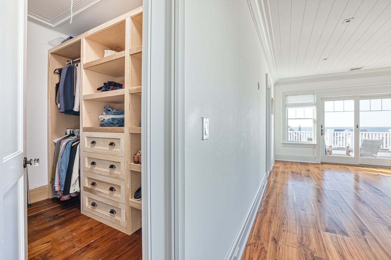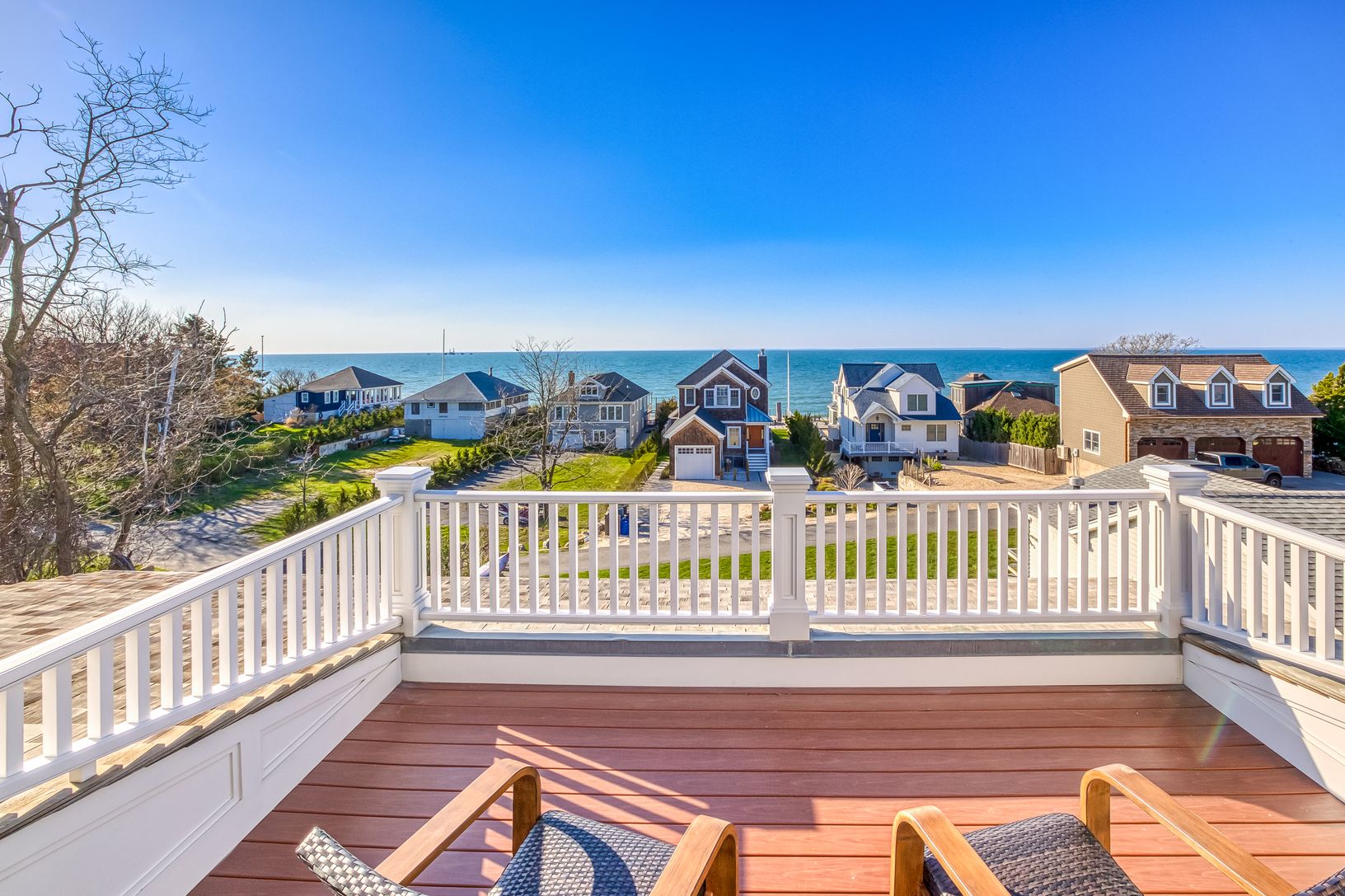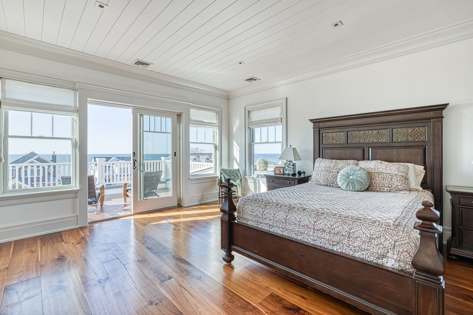Jamesport, North Fork: views of and moments to beautiful Northville Beach, no expense spared in the building of this exquisitely crafted Nantucket inspired home - 3 years young and features top-tier design, high-end finishes, materials and quality construction. Wide plank walnut flooring. Sophisticated and relaxed living from the moment you enter the vaulted entry foyer, den/home office (could be 4th bedroom), waterside living room with fi