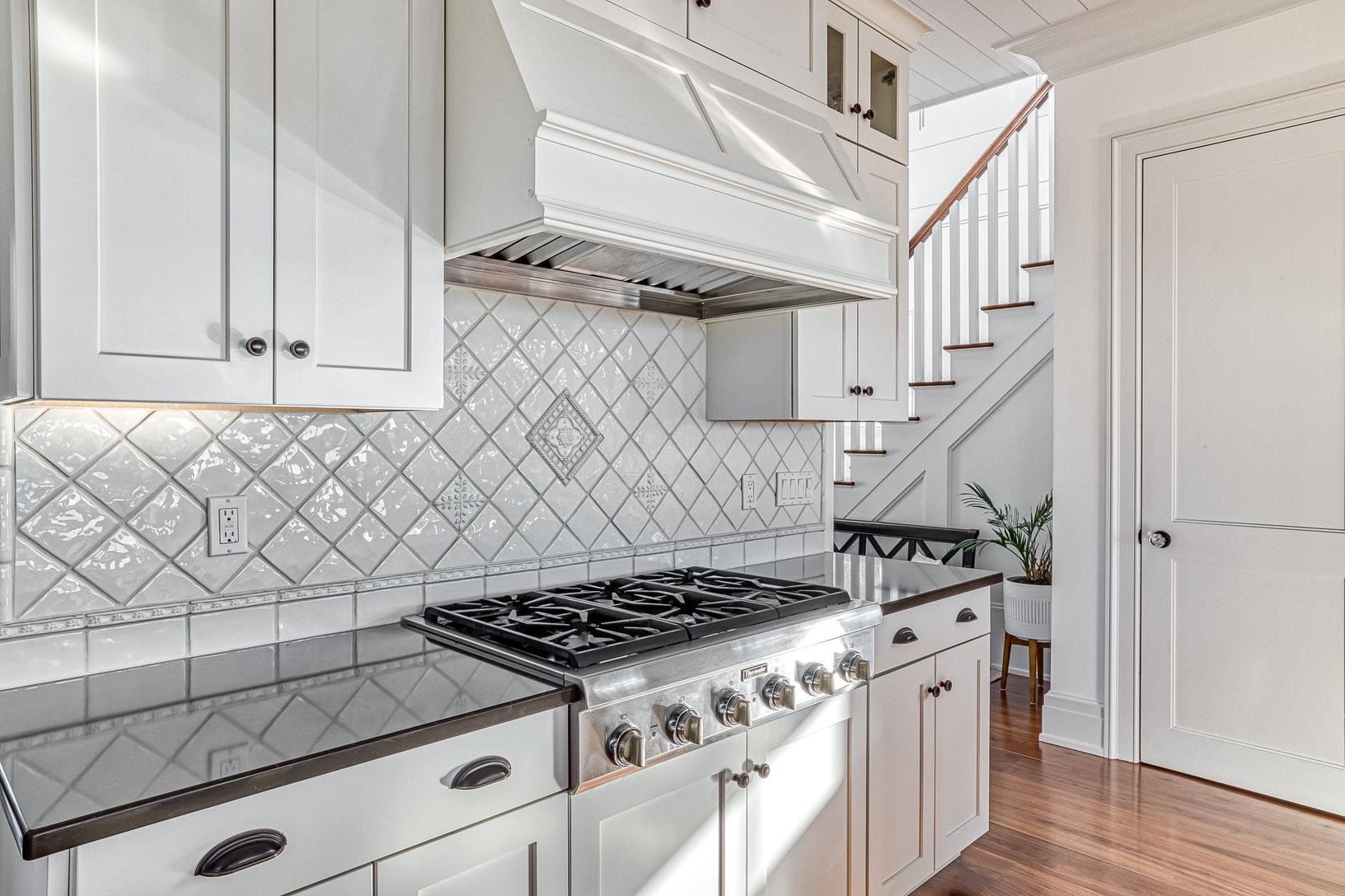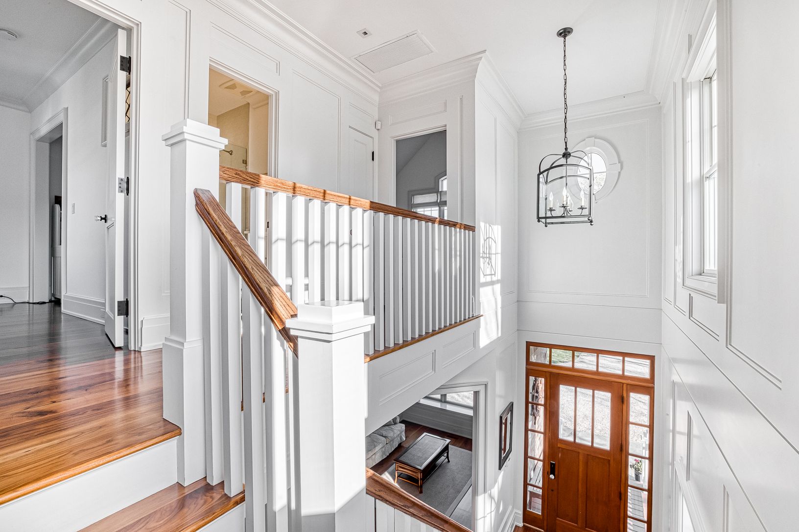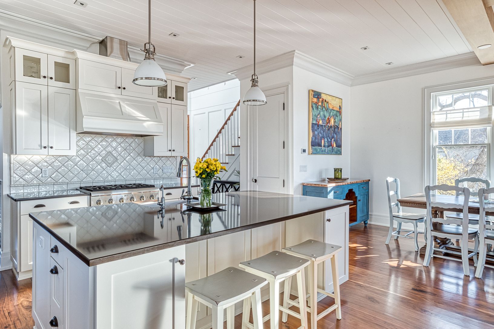 Jamesport, North Fork: views of and moments to beautiful Northville Beach, no expense spared in the building of this exquisitely crafted Nantucket inspired home - 3 years young and features top-tier design, high-end finishes, materials and quality construction. Wide plank walnut flooring. Sophisticated and relaxed living from the moment you enter the vaulted entry foyer, den/home office (could be 4th bedroom), waterside living room with fi