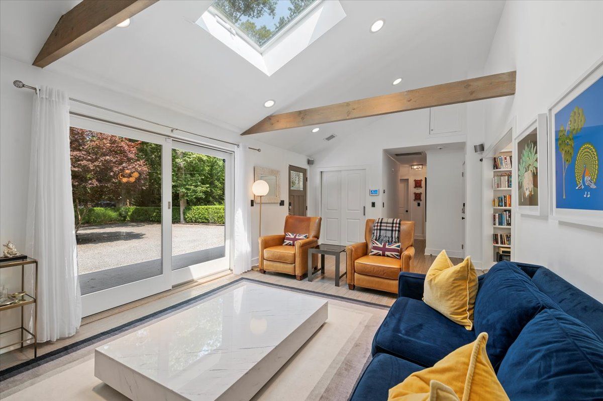 Set behind a private driveway framed by boxwoods, the home opens to an airy, open concept living space with a beamed cathedral ceiling and an operable skylight that brings in incredible natural light. A sle
