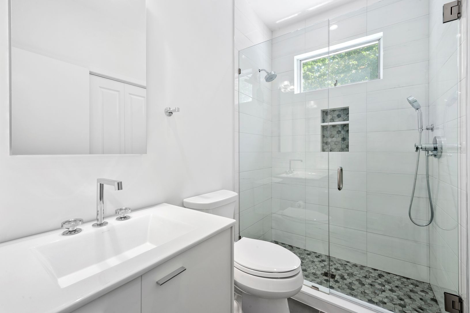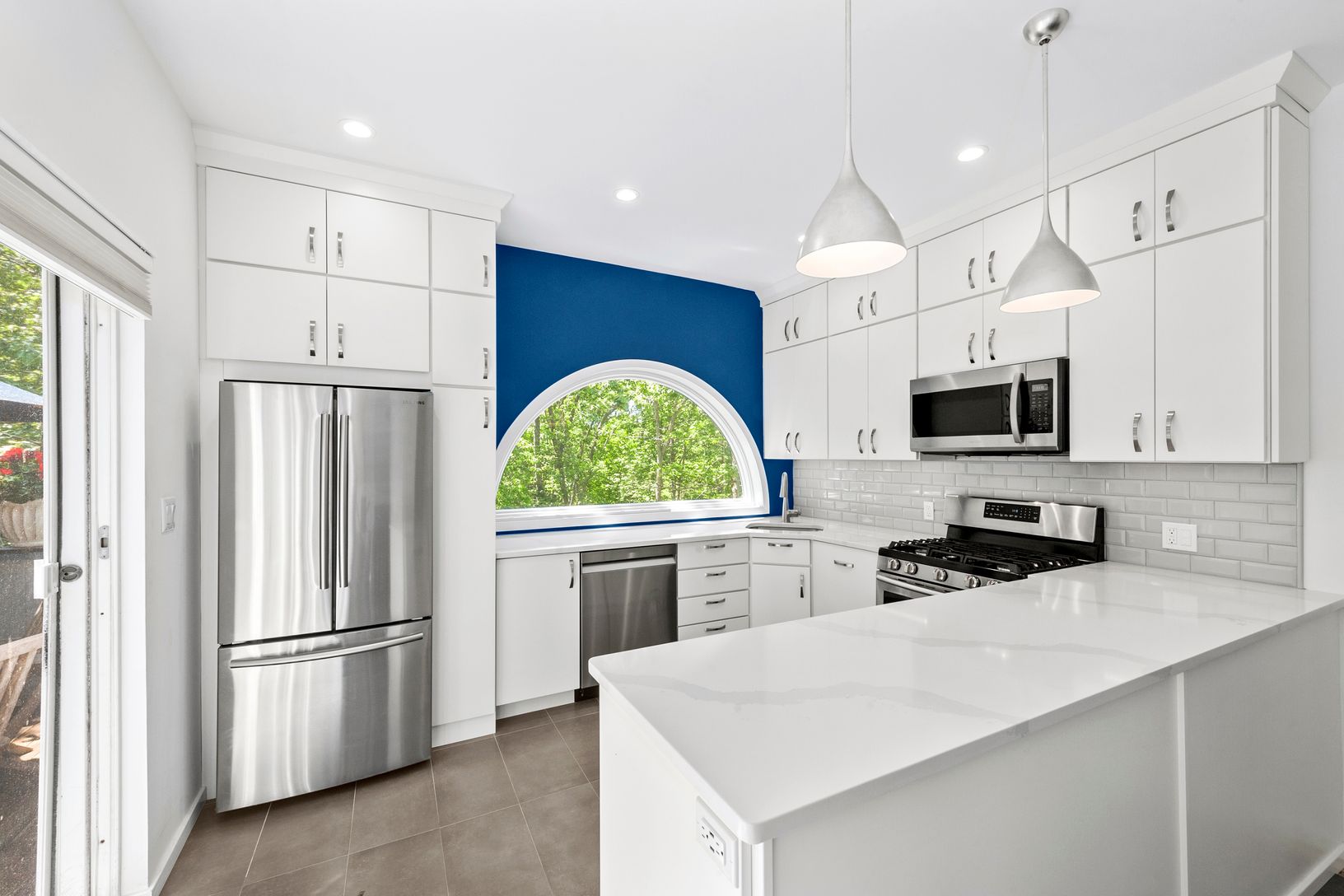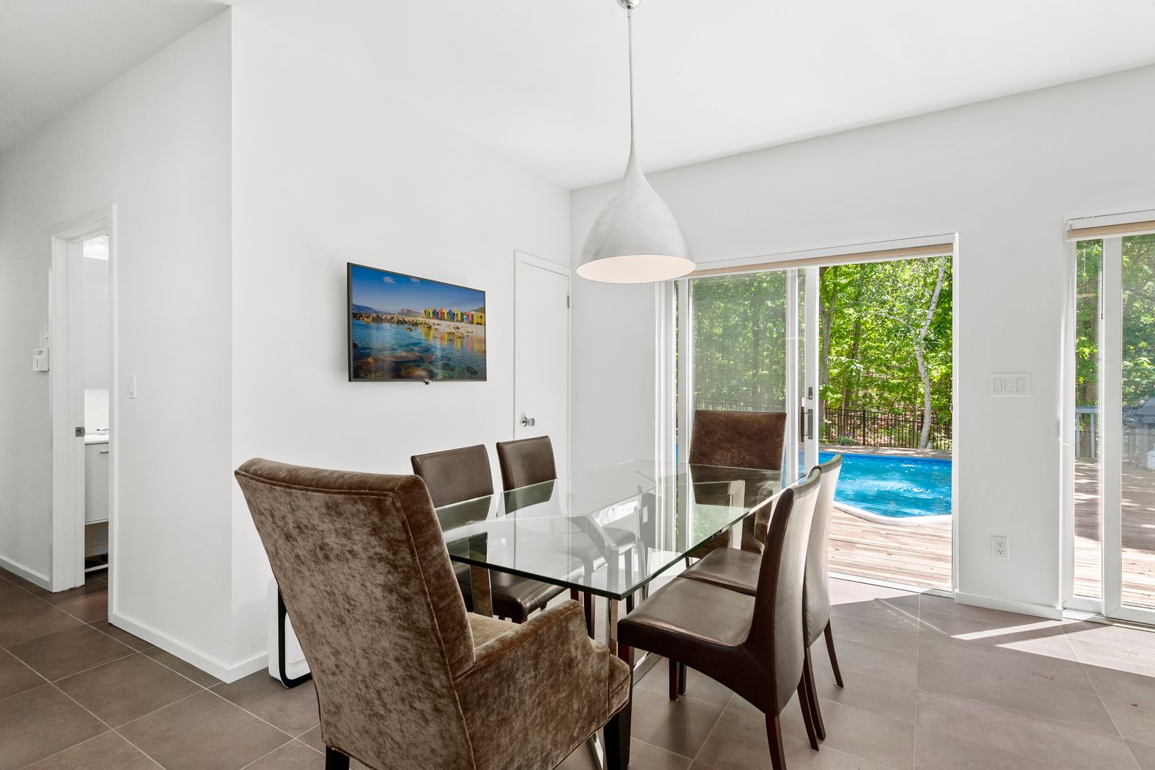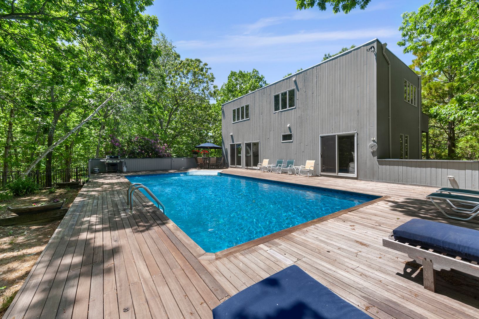This meticulously maintained contemporary & newly renovated three bedroom, two bath home is sited high and dry on a shy 1 acre plot surrounded by lush trees offering privacy outdoors by the pool in a bucolic setting. The oversized mahogany wooden deck compliments this picture. The kitchen has undergone a tasteful renovation, & the bathrooms are newly renovated as well. The dining is right off the kitchen, looking outside to the pool ar