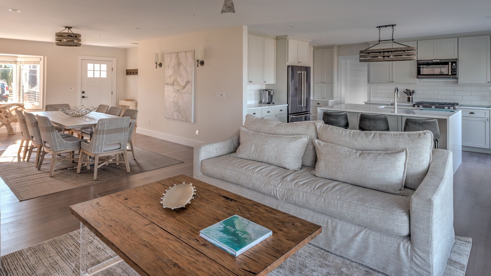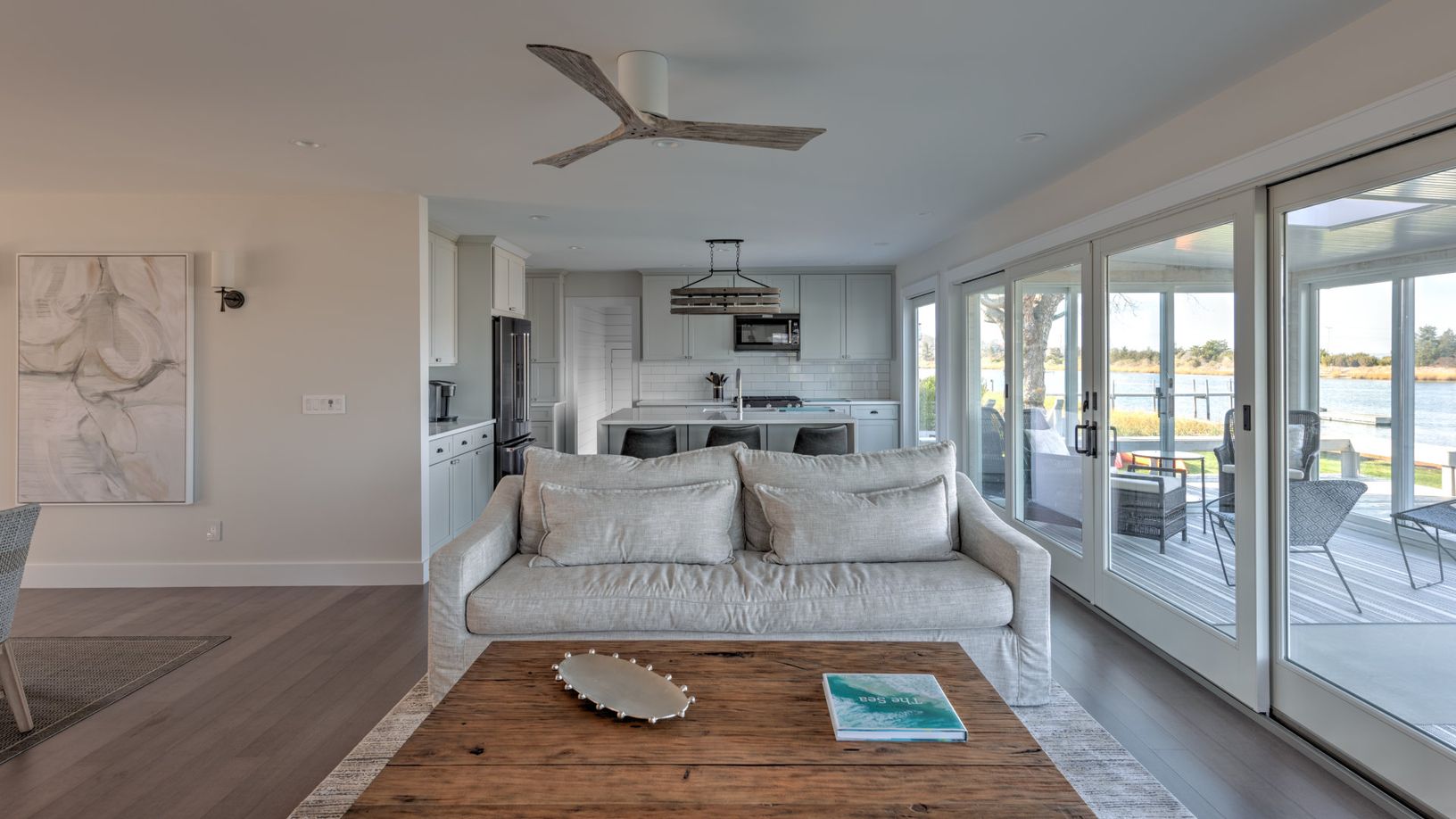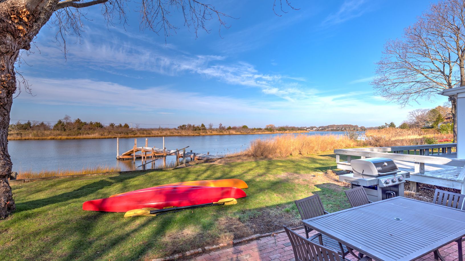 The home features a deep water dock for a boat with a 24” draft. Take out the family and cruise to Peconic Bay, Gardiners Bay, and Long Island Sound. Inside, guests will find a spacious interior with an open living room that flows into the dining room, all containing hardwood floors. Cook up three meals a day in the