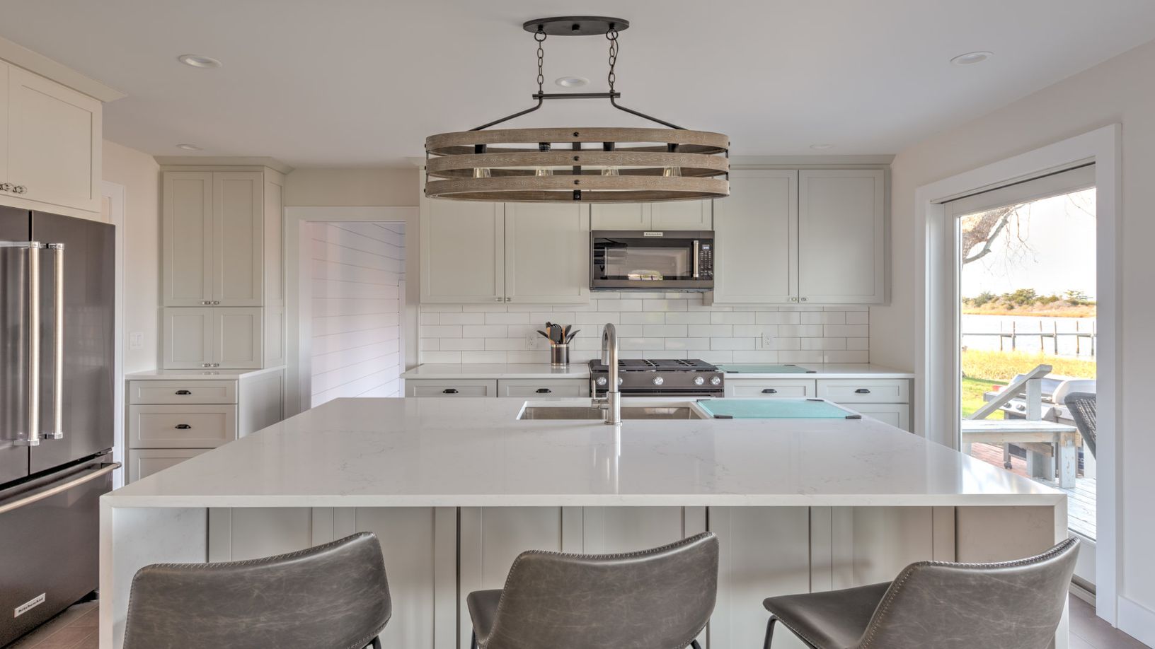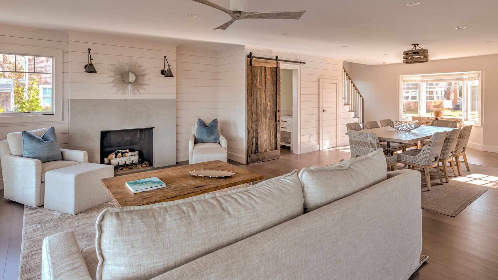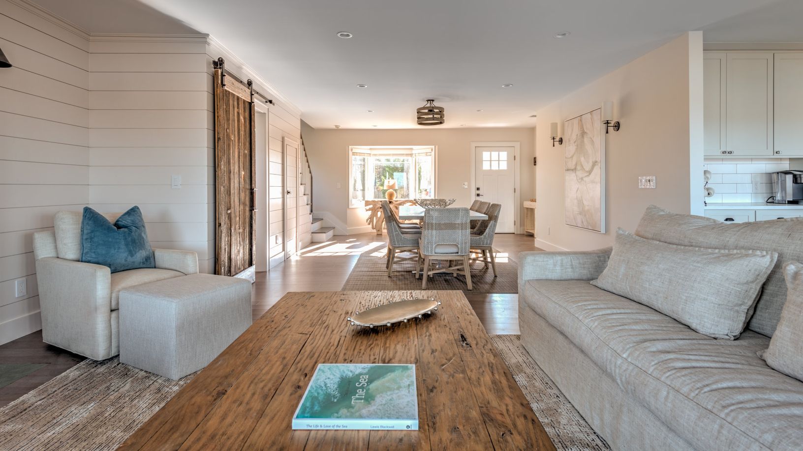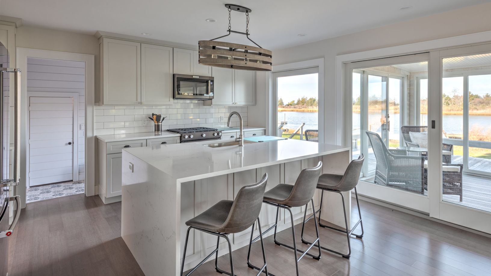 The home features a deep water dock for a boat with a 24” draft. Take out the family and cruise to Peconic Bay, Gardiners Bay, and Long Island Sound. Inside, guests will find a spacious interior with an open living room that flows into the dining room, all containing hardwood floors. Cook up three meals a day in the