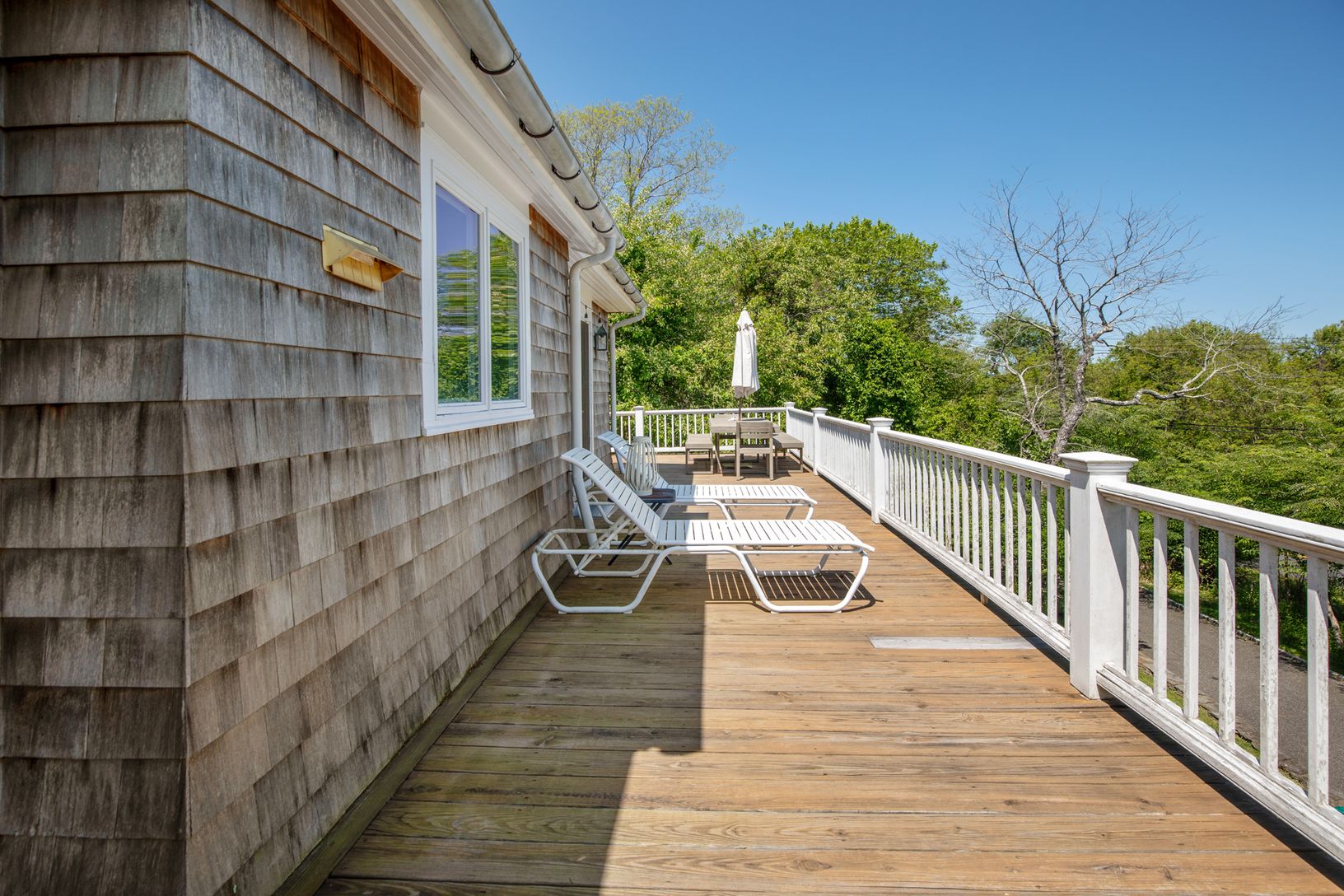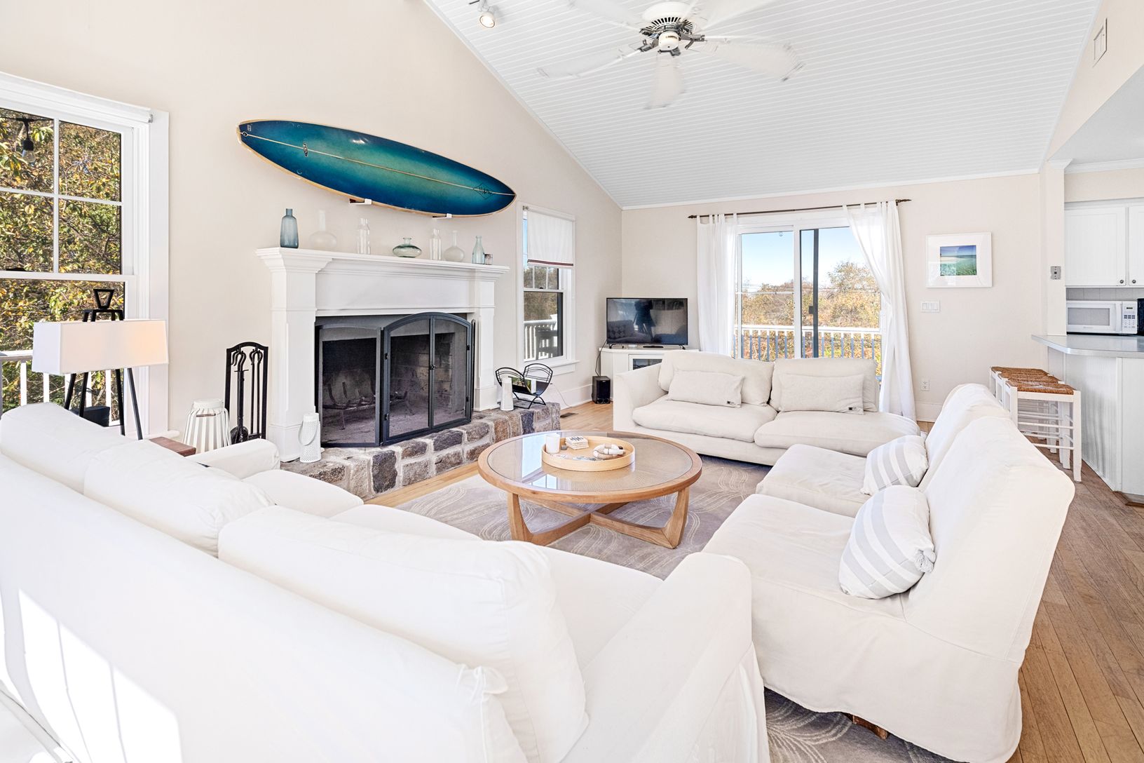 Fantastic 4-bedroom, 2-bathroom home close to Montauk Downs, offering a relaxed and comfortable summer retreat. The first floor features three bedrooms, a full bathroom, and a casual living area. The second floor includes the kitchen, dining area, a living room with fireplace, another full bathroom, and the primary bedroom. Enjoy wraparound decking with sunset views, an outdoor shower, central air conditioning, and a private backyard for your