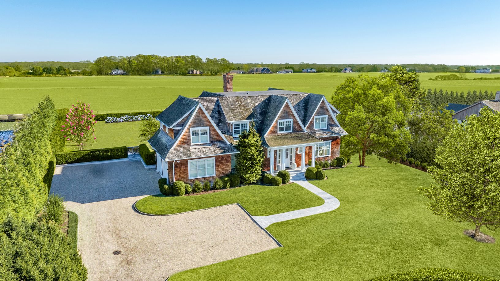 Sitting directly on approximately 106+/- acres of protected reserve land and directly across from more than 100 acres of additional reserve, this traditional cedar-shake estate is set within the coveted Hamlet of Water Mill on a beautifully proportioned 0.92-acre lot and offers endless, open views that define refined Hamptons living. Built in 2014, the residence spans 6,443 square feet and blends timeless architecture with modern comforts, fea
