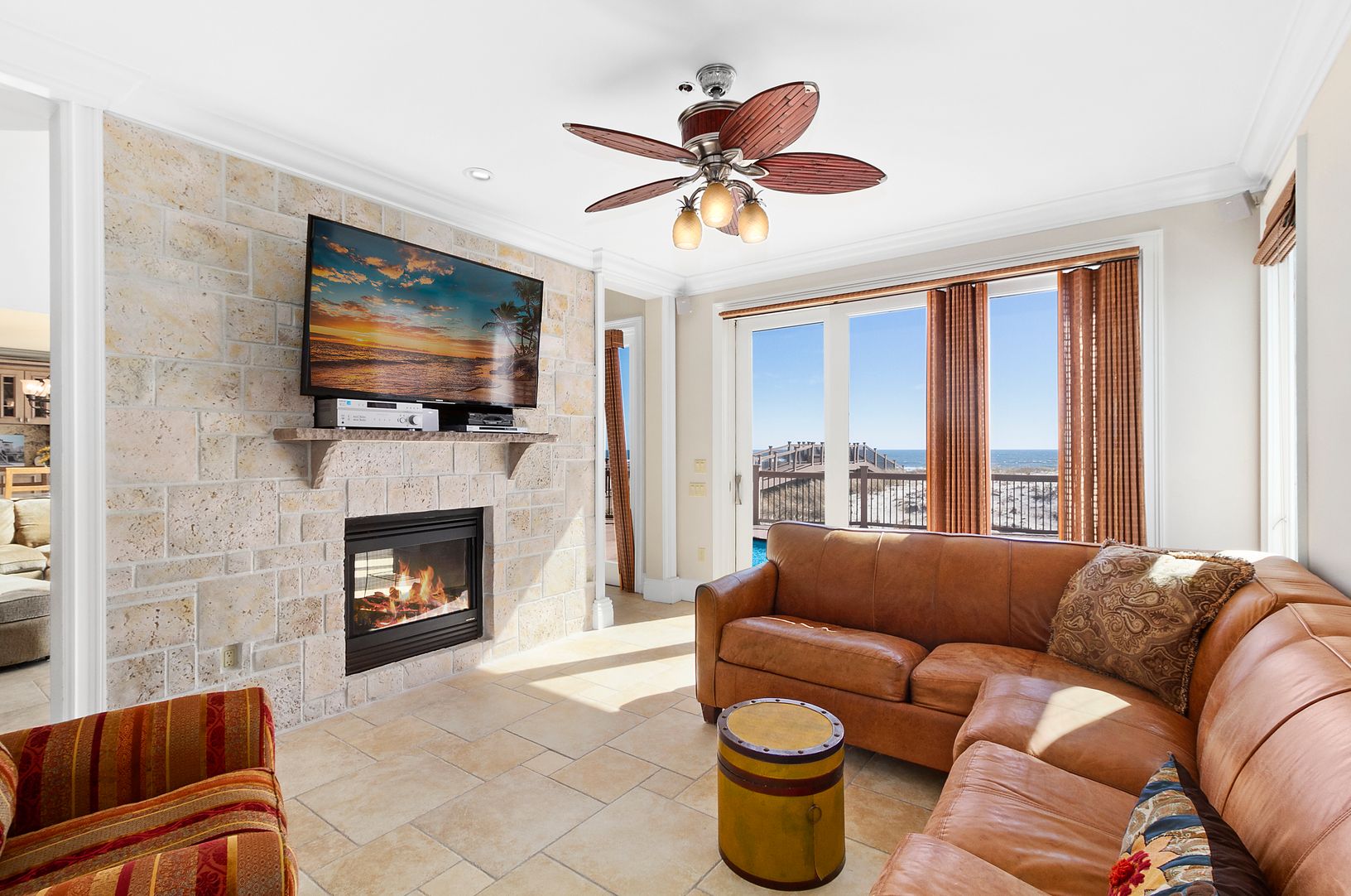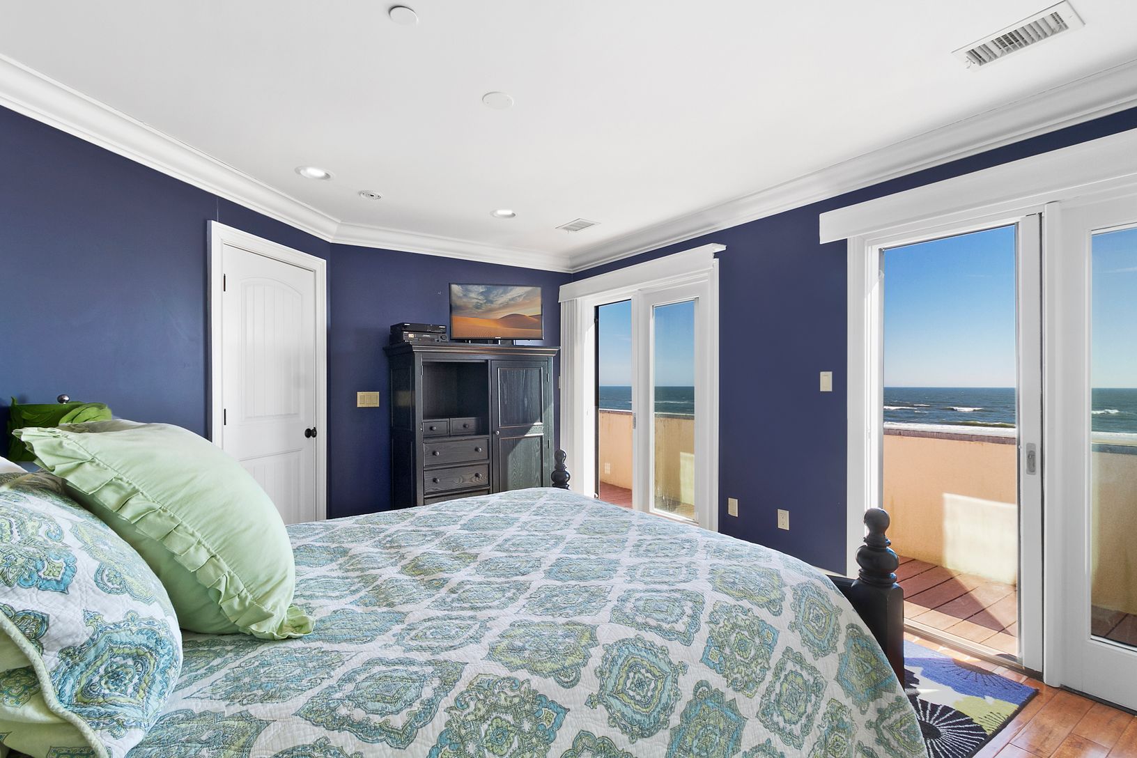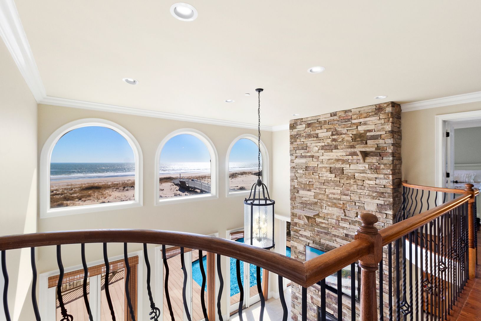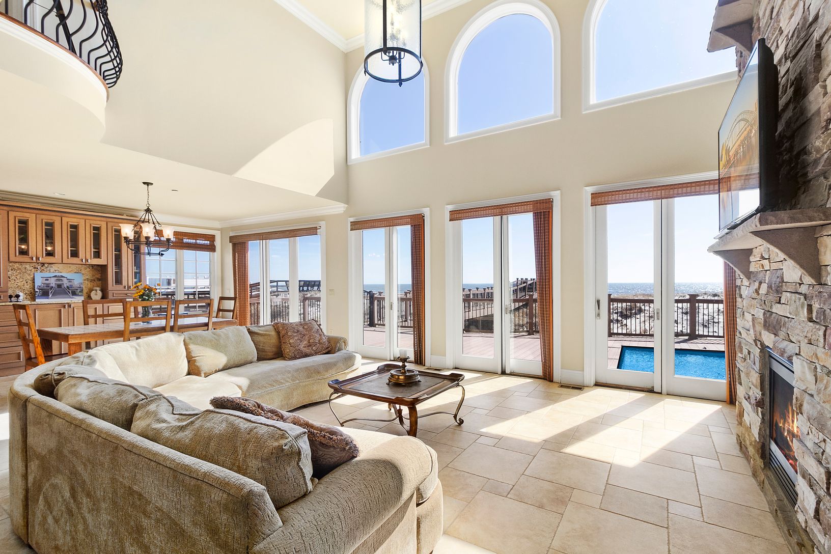 A dramatic, richly customized, oceanfront home on Dune Road boasting ocean views from almost every room. The spacious foyer, with a beautiful, rich wood coffered ceiling, immediately showcases the tremendous views of the ocean. Beyond the entrance is the great room with soaring ceilings, a massive stone fireplace, living room, dining area, and state-of-the-art gourmet kitchen will all the modern amenities. The den overlooks the beautiful sandy