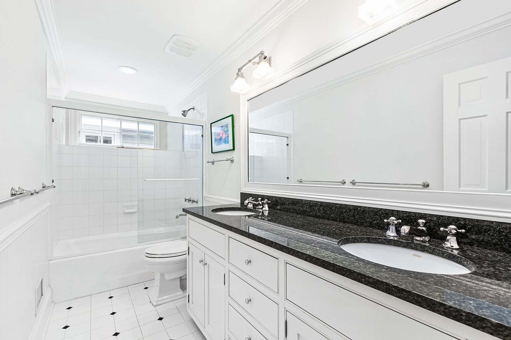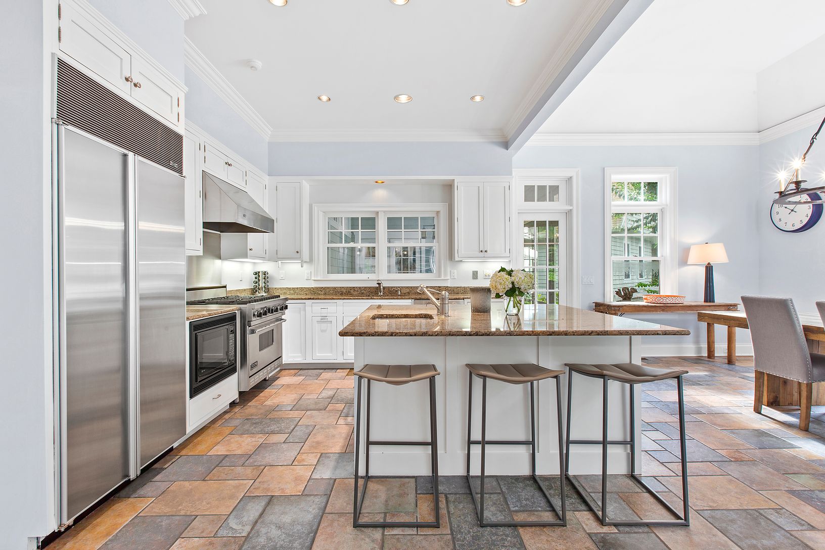 Upon entering this spacious home, step down into the formal living room with double-height ceilings and fireplace. The classic chef’s kitchen with granite countertops and island adjoins the dining room which leads ou