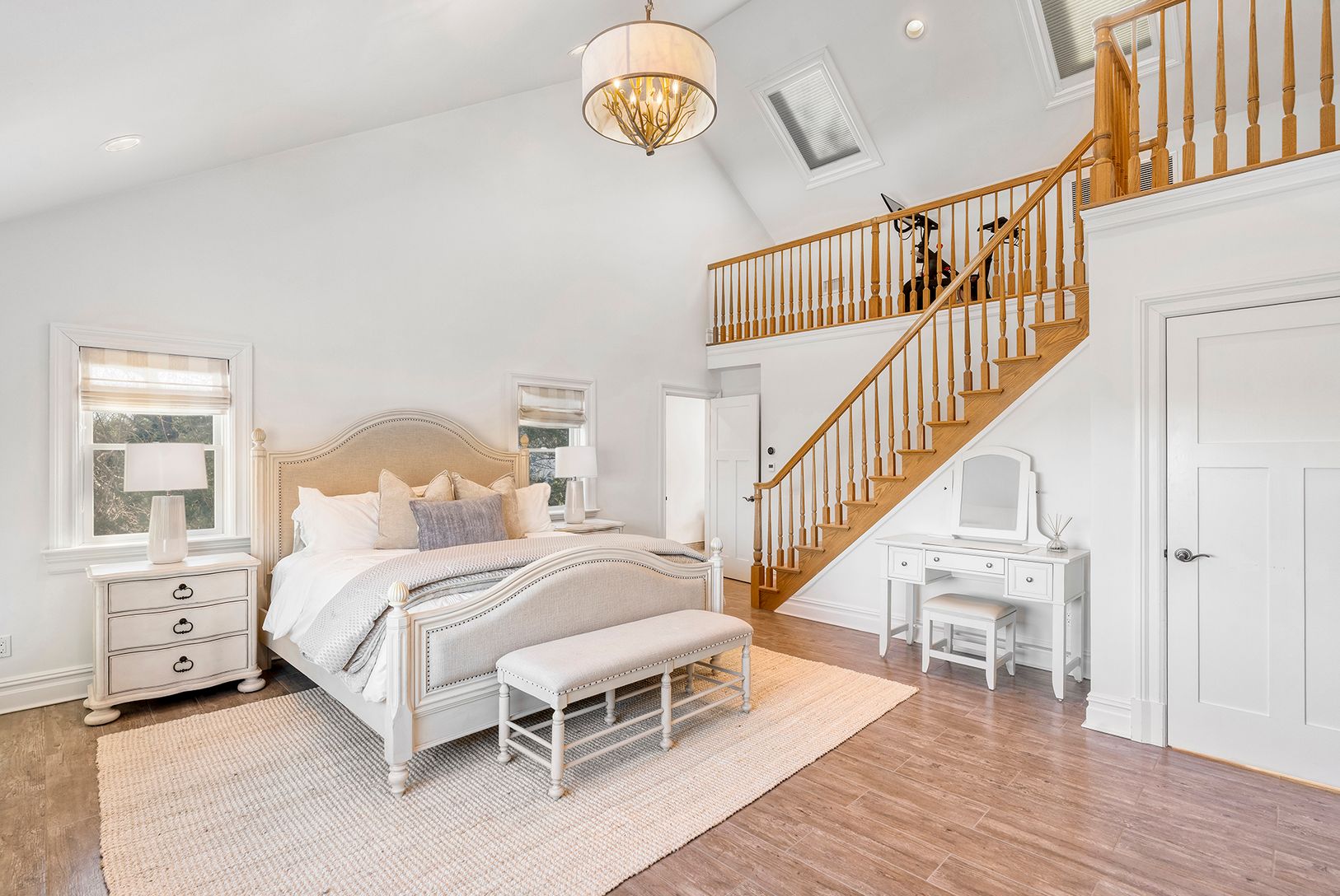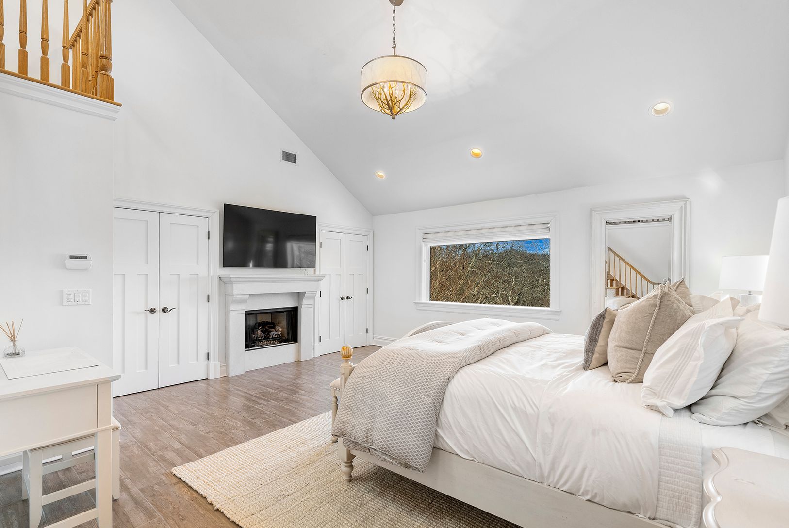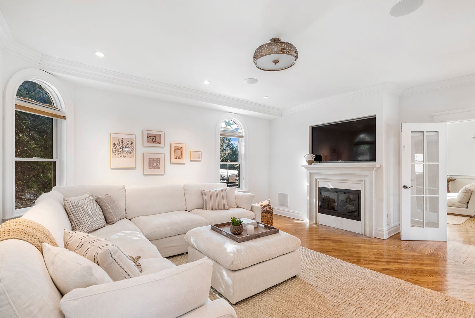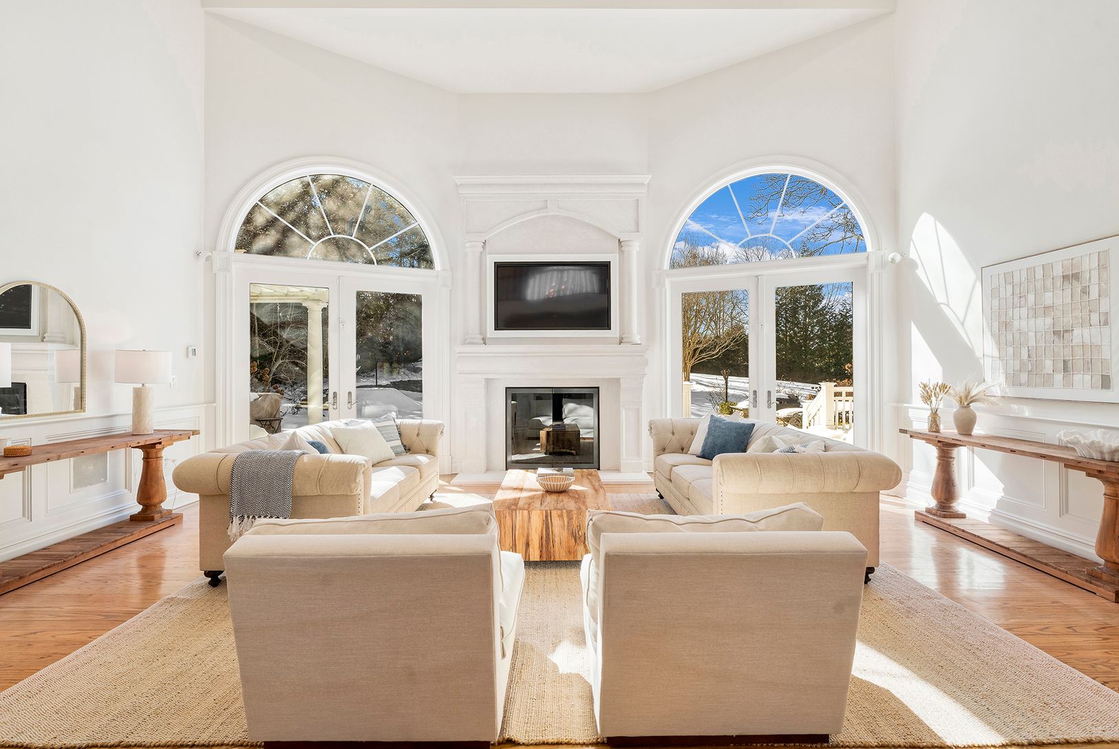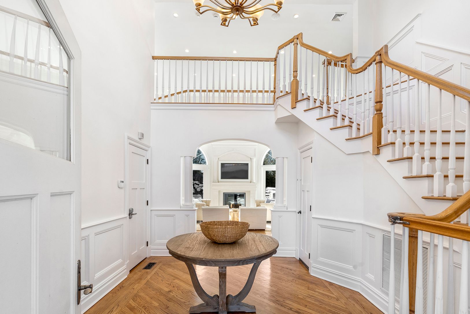 A gracious wraparound porch welcomes you into a soaring two-story living room adorne