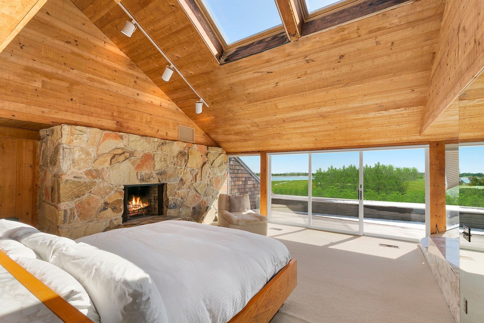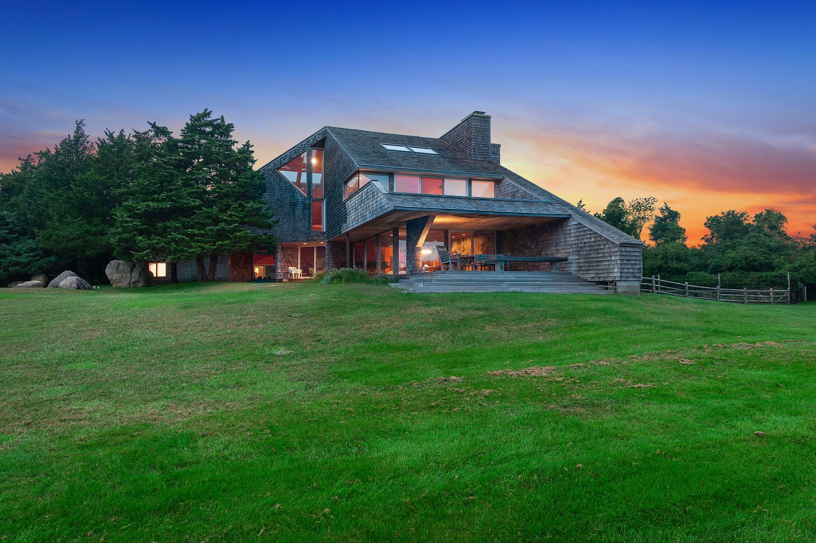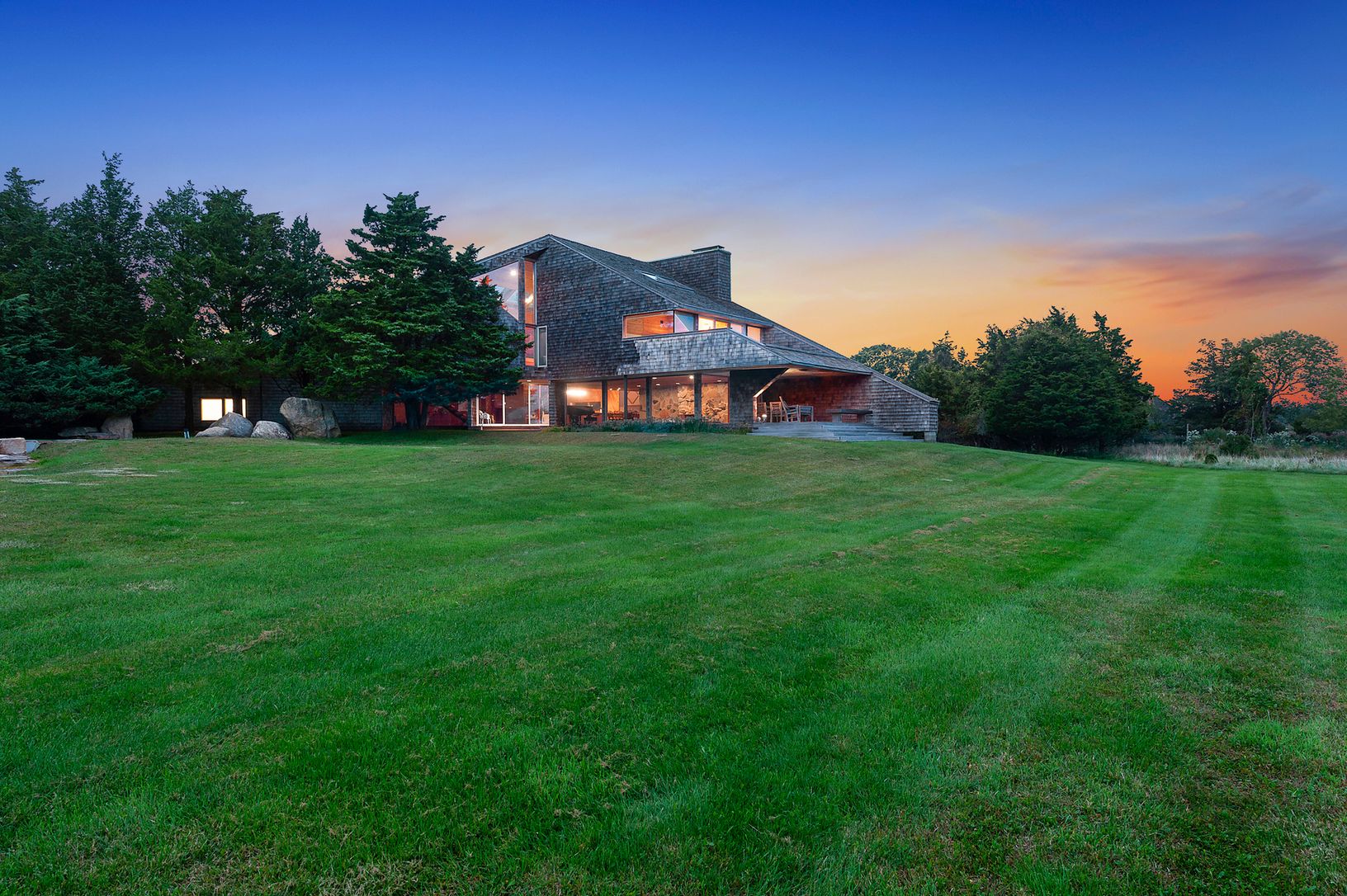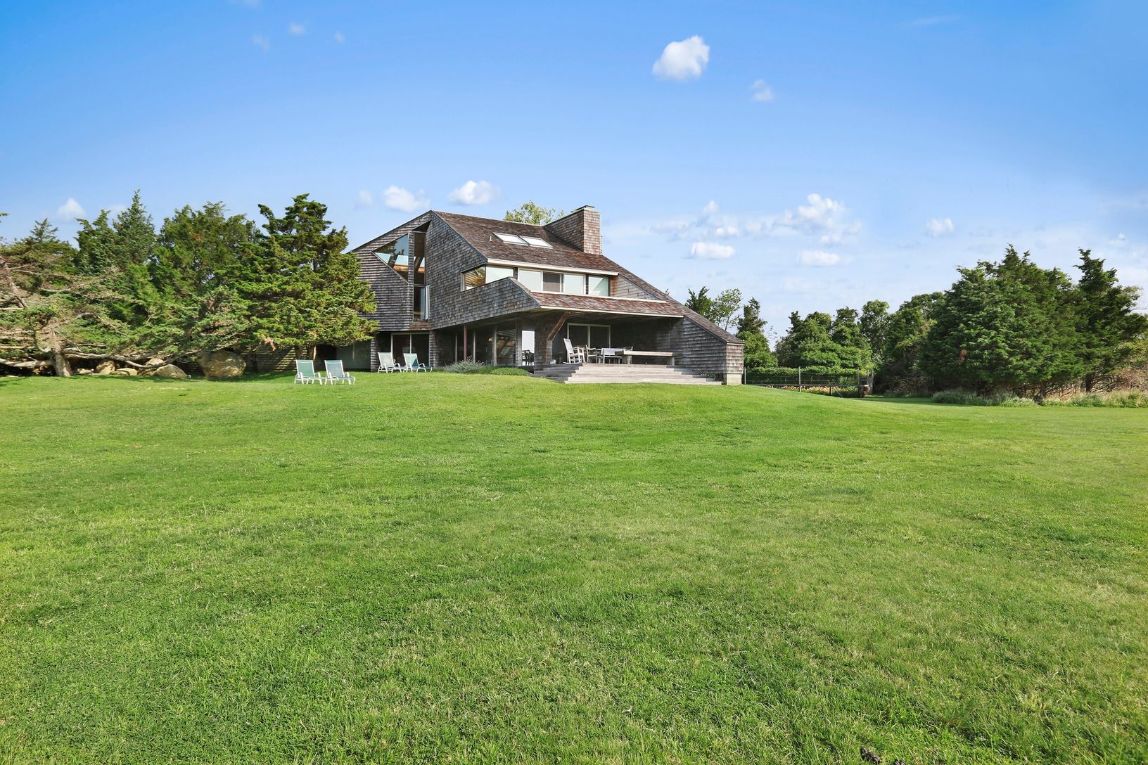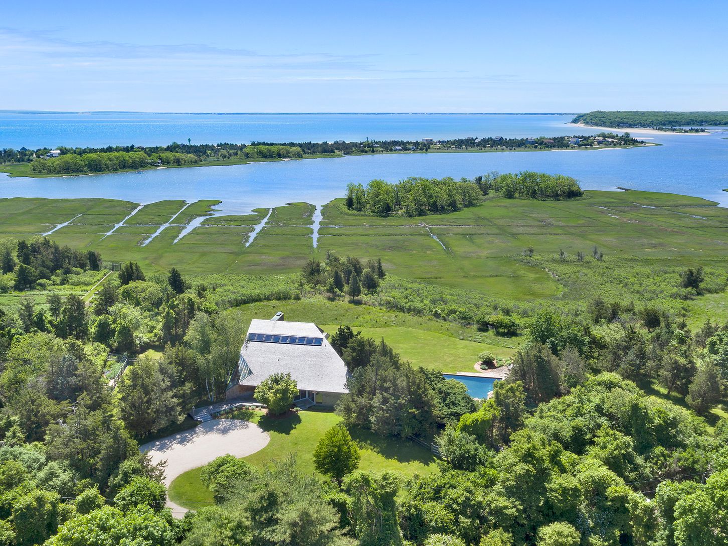 This striking and sculptural waterfront contemporary is being offered for the first time. Designed and built by Norman Jaffe, a "romantic modernist" architect known for creating a direct relationship between nature and dwelling. This stunning home is thoughtfully positioned to take full advantage of one of the most bucolic views over Accabonac Harbor in East Hampton. Jaffe worked with the owners to ensure that there was only a gentle footprint