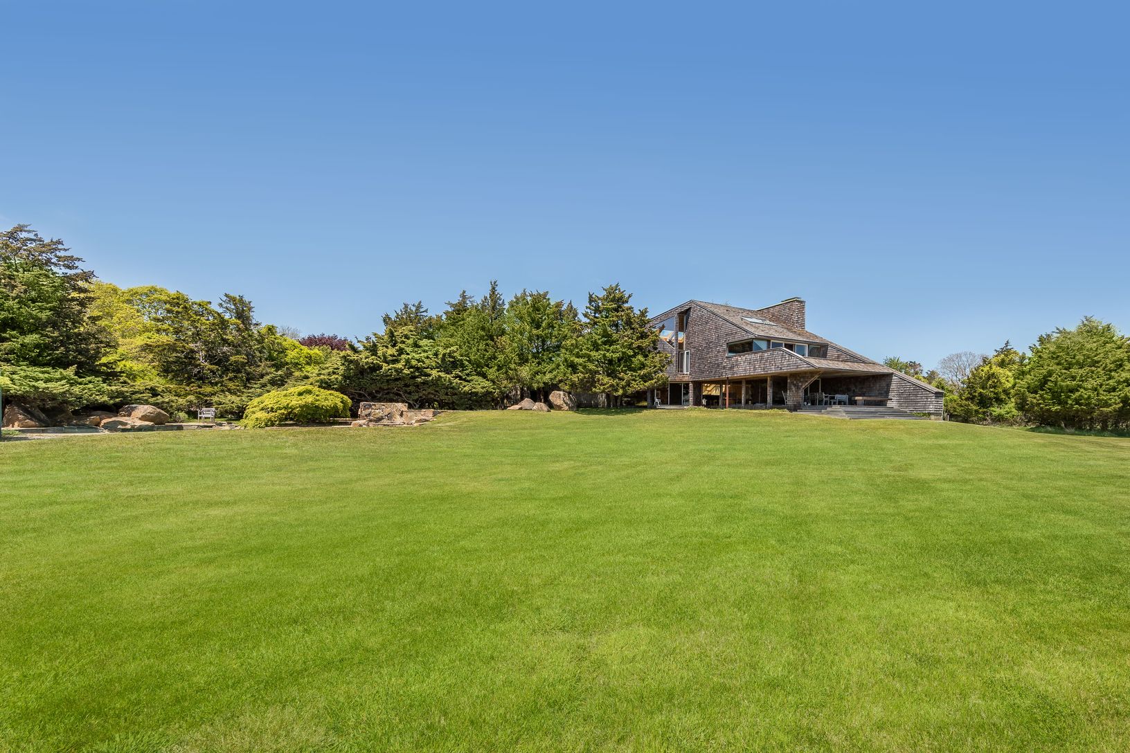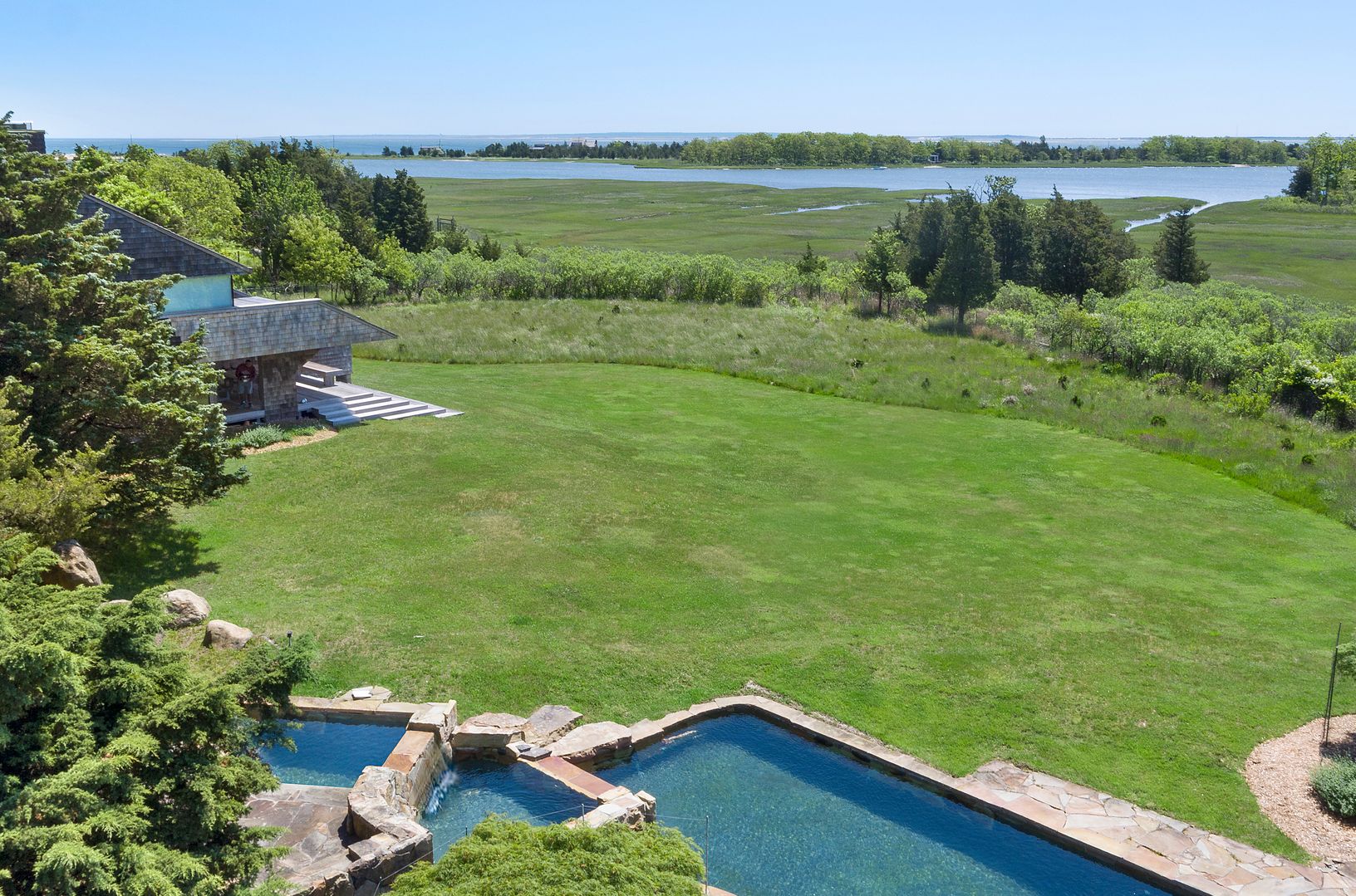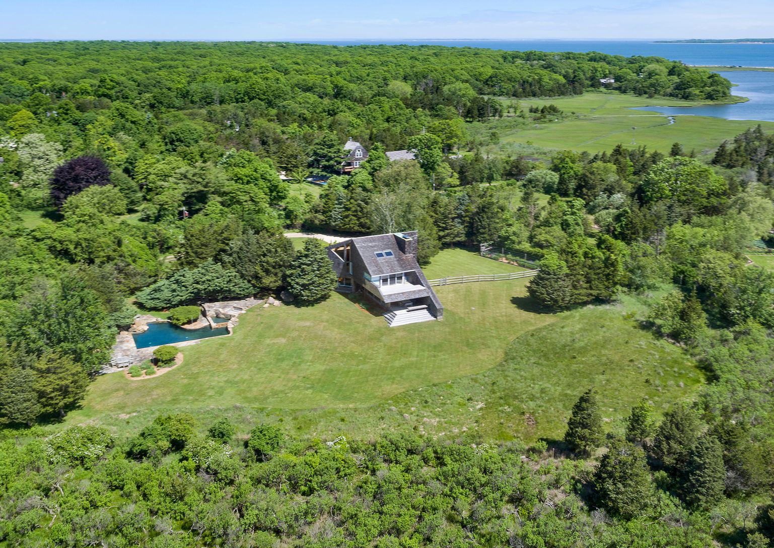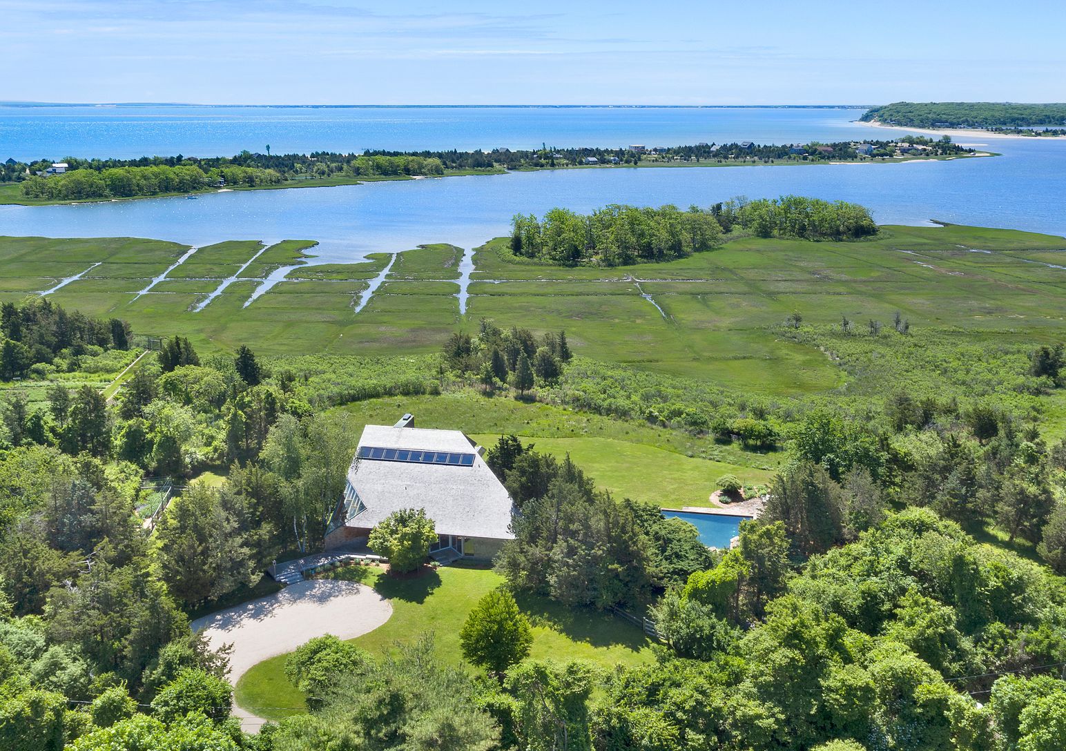 This striking and sculptural waterfront contemporary is being offered for the first time. Designed and built by Norman Jaffe, a "romantic modernist" architect known for creating a direct relationship between nature and dwelling. This stunning home is thoughtfully positioned to take full advantage of one of the most bucolic views over Accabonac Harbor in East Hampton. Jaffe worked with the owners to ensure that there was only a gentle footprint