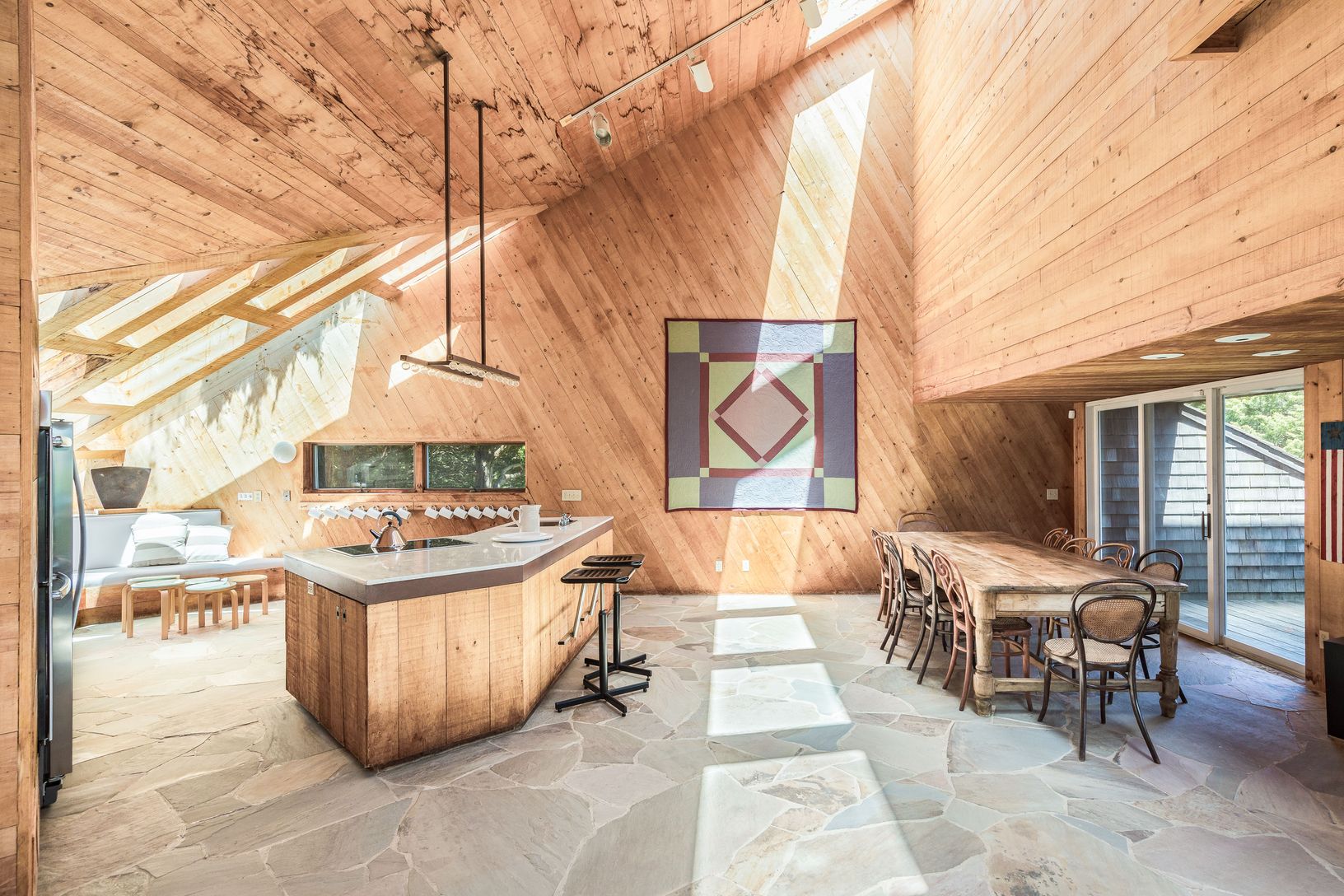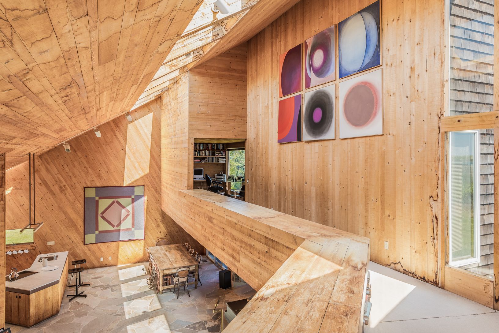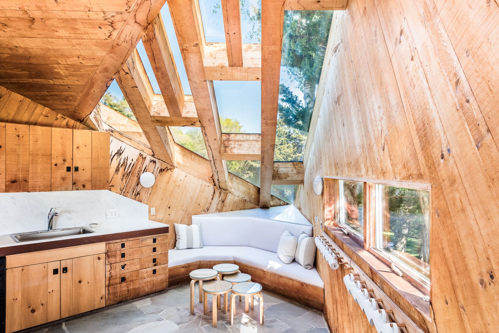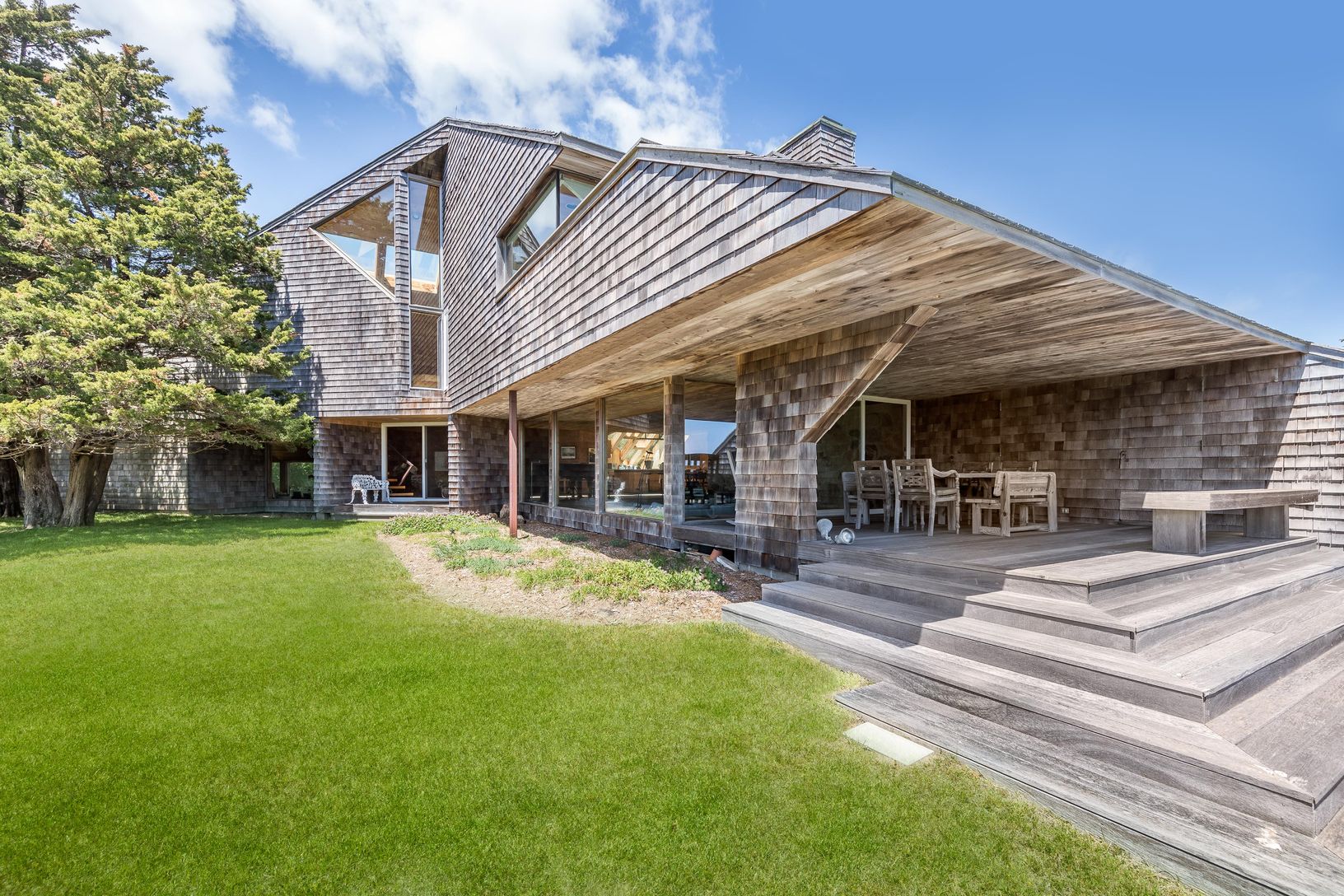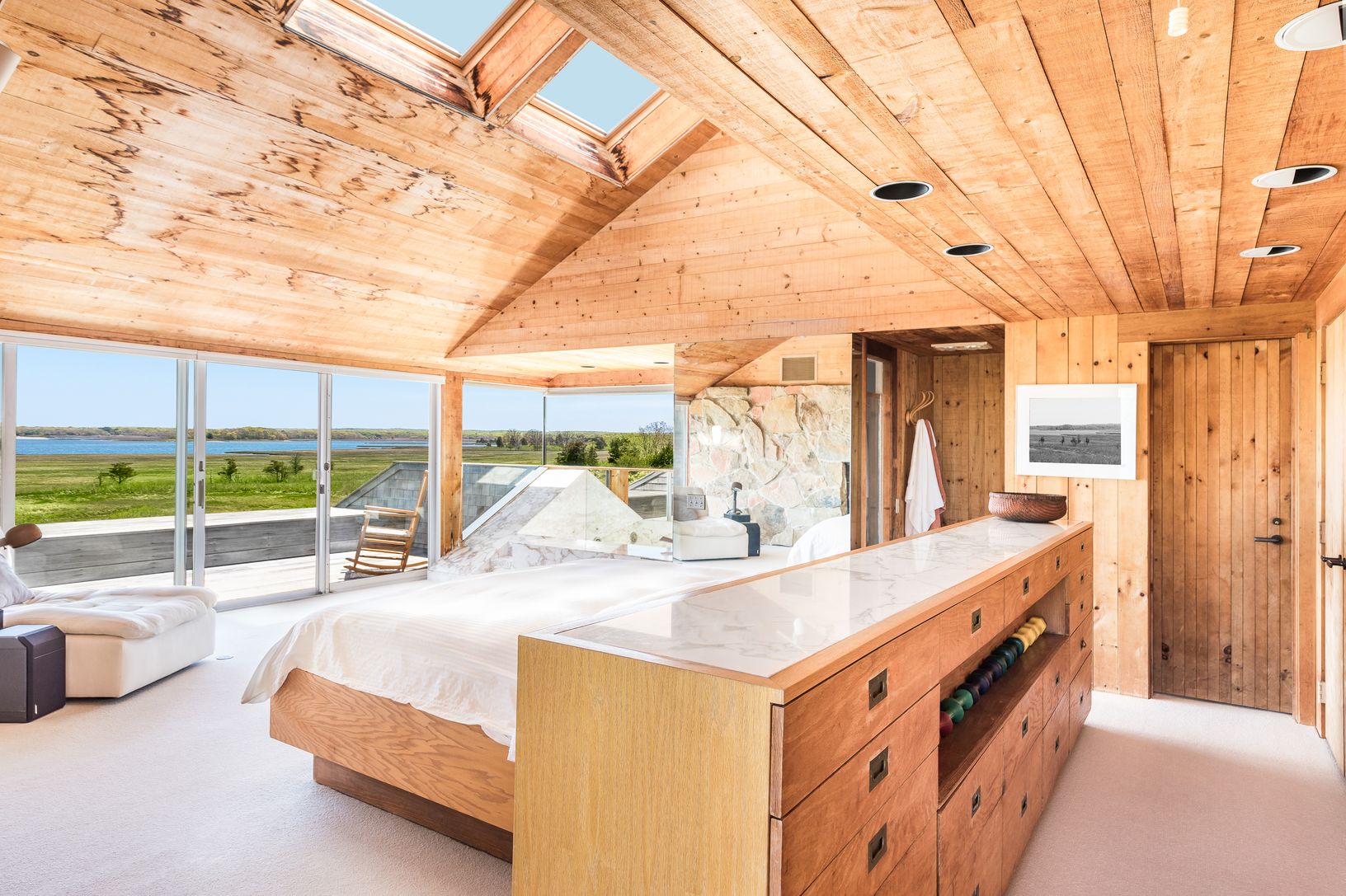This striking and sculptural waterfront contemporary is being offered for the first time. Designed and built by Norman Jaffe, a "romantic modernist" architect known for creating a direct relationship between nature and dwelling. This stunning home is thoughtfully positioned to take full advantage of one of the most bucolic views over Accabonac Harbor in East Hampton. Jaffe worked with the owners to ensure that there was only a gentle footprint