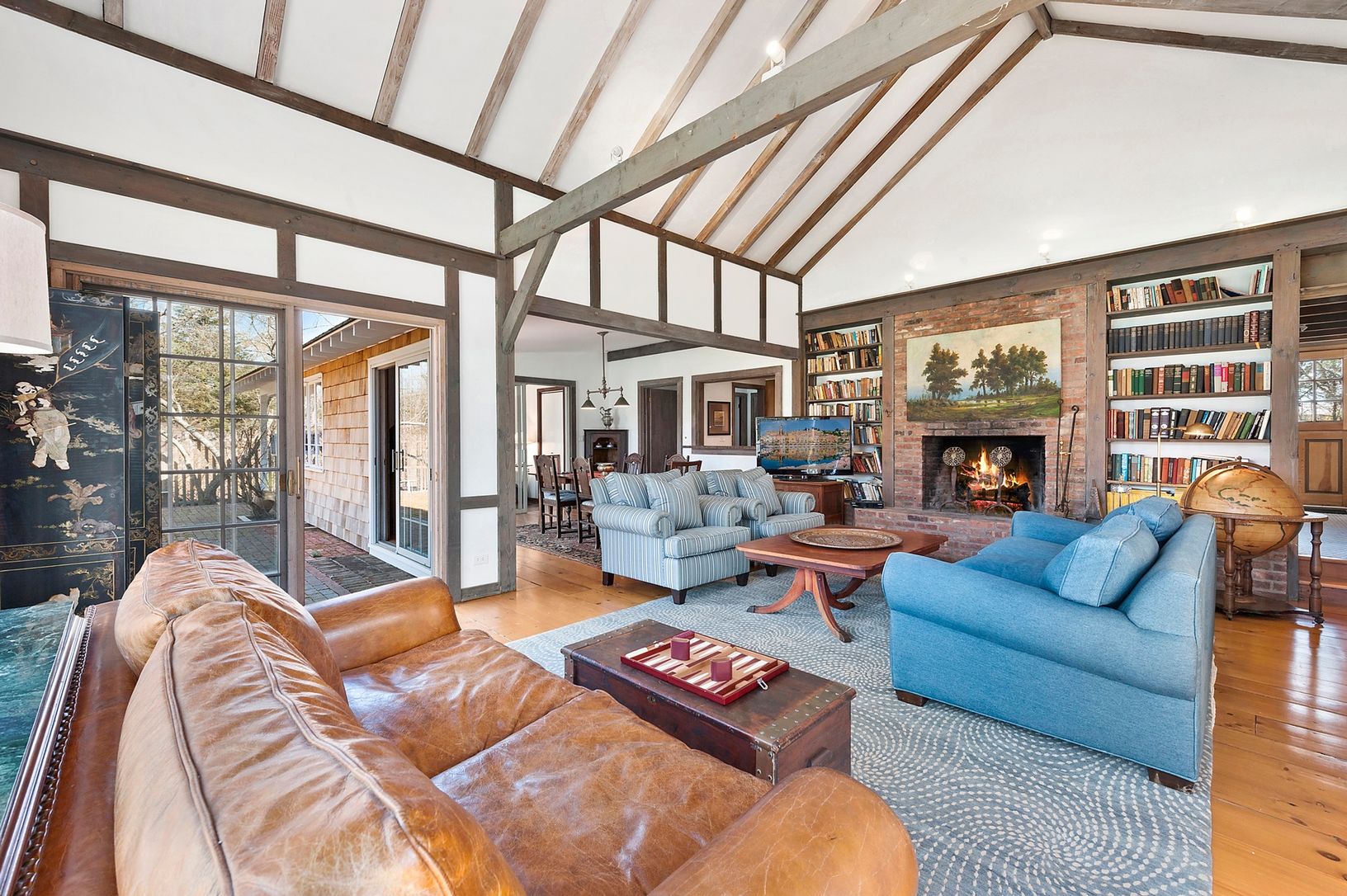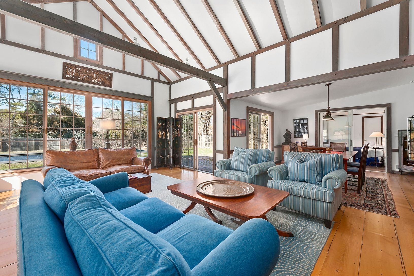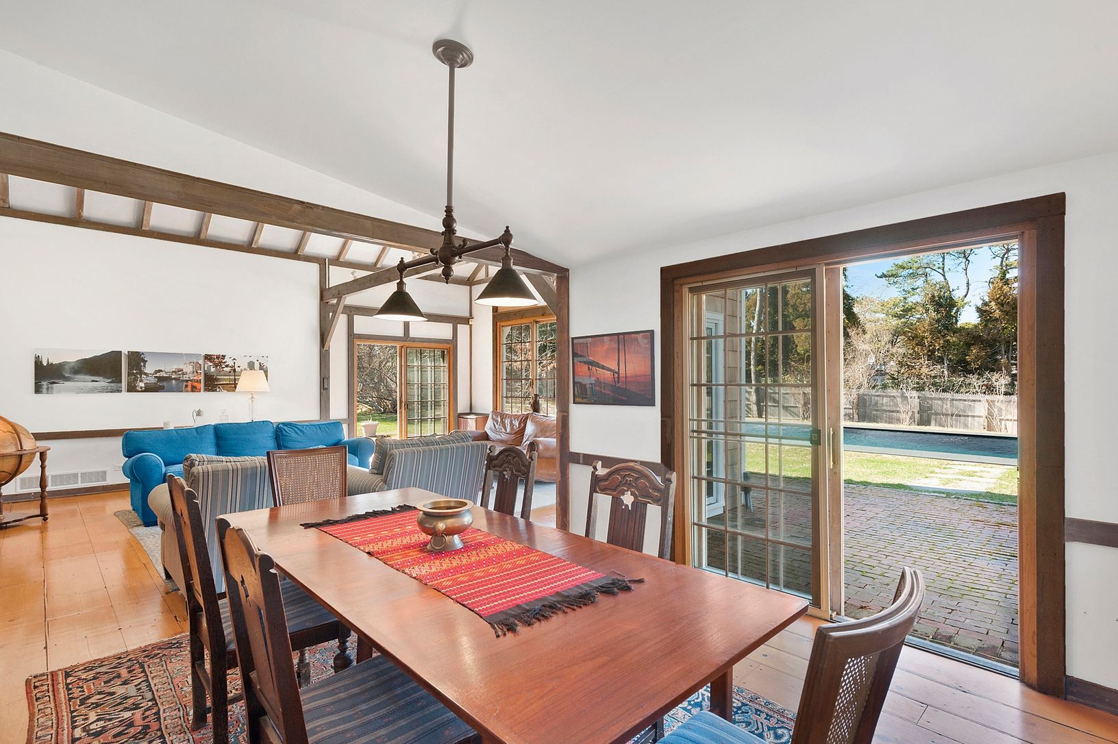Situated on an unusually large .74 acre +/- lot, the house captures a classic period in local architecture introduced by Alfred A. Scheffer, built in 1958. Well maintained throughout the years, the house offers a large living room with vaulted ceiling, wide plank floors, 5 bedrooms including upstairs master bedroom, 3.5 baths and two fireplaces. Outdoor brick patios, swimming pool and mature landscaping. Only one block from a private beach