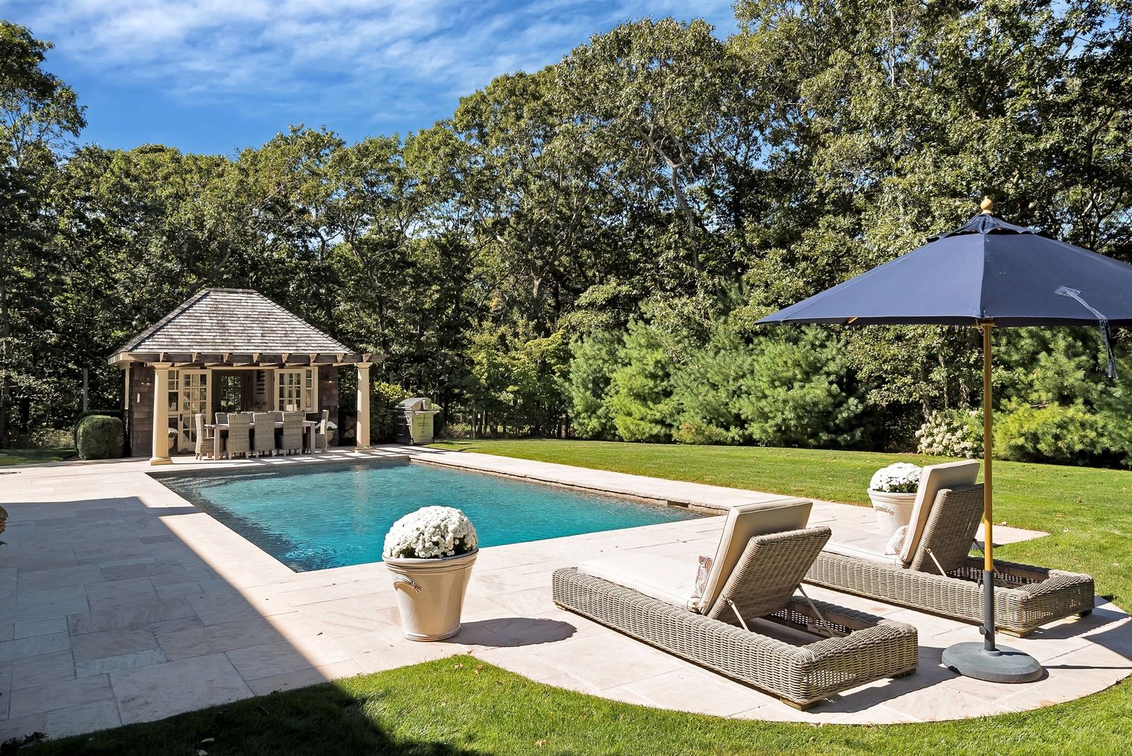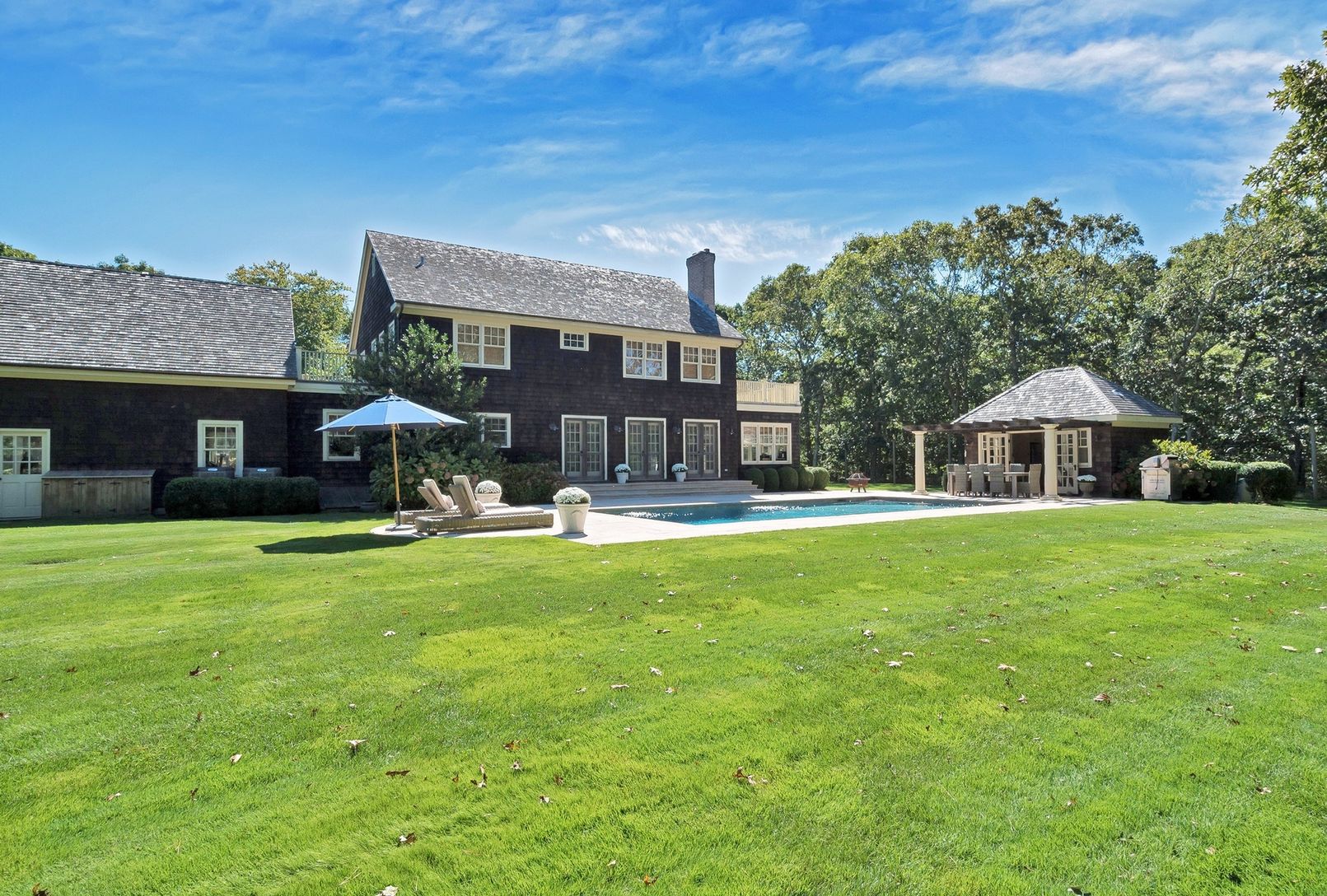 This property is a must see! 1.6 acres- bordering on 26 acres of town reserve -- beautiful lush lawns, elaborate plantings and mature trees makes this private property so special. At the end of a cul-de-sac on a desirable street in Amagansett you enter through a private remote gate onto a long paved driveway with plenty of parking and a two car garage. The backyard boasts a gunite pool and pool house with a full bath and kitchen. There are