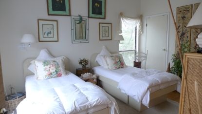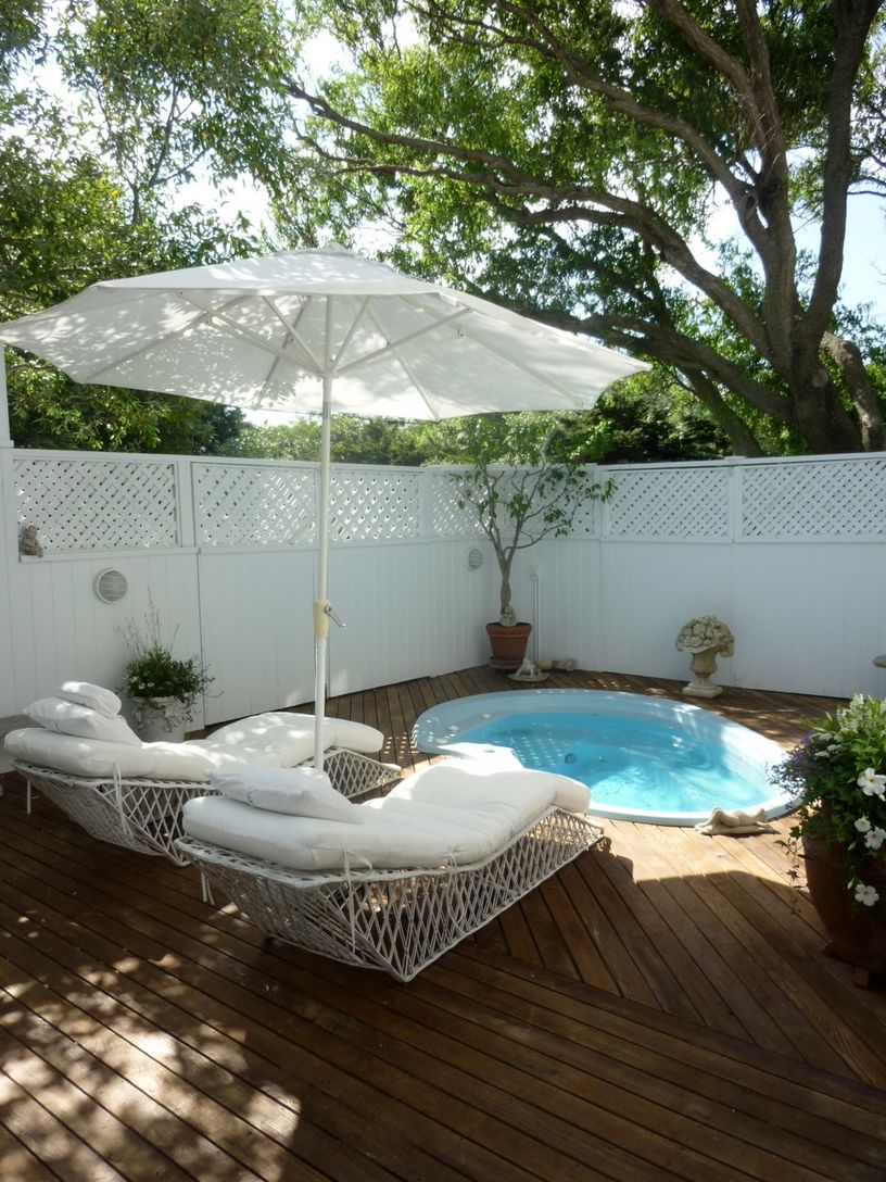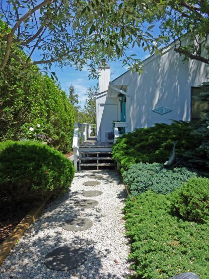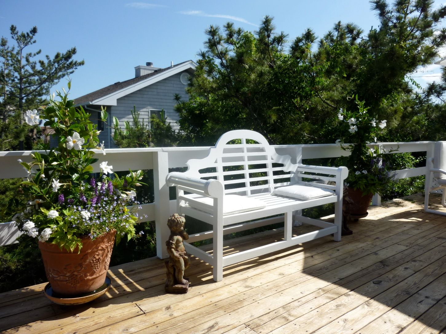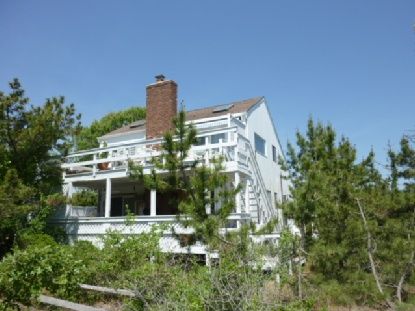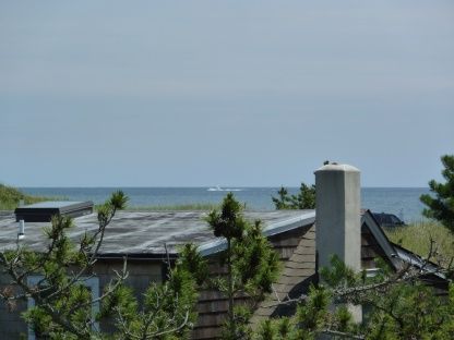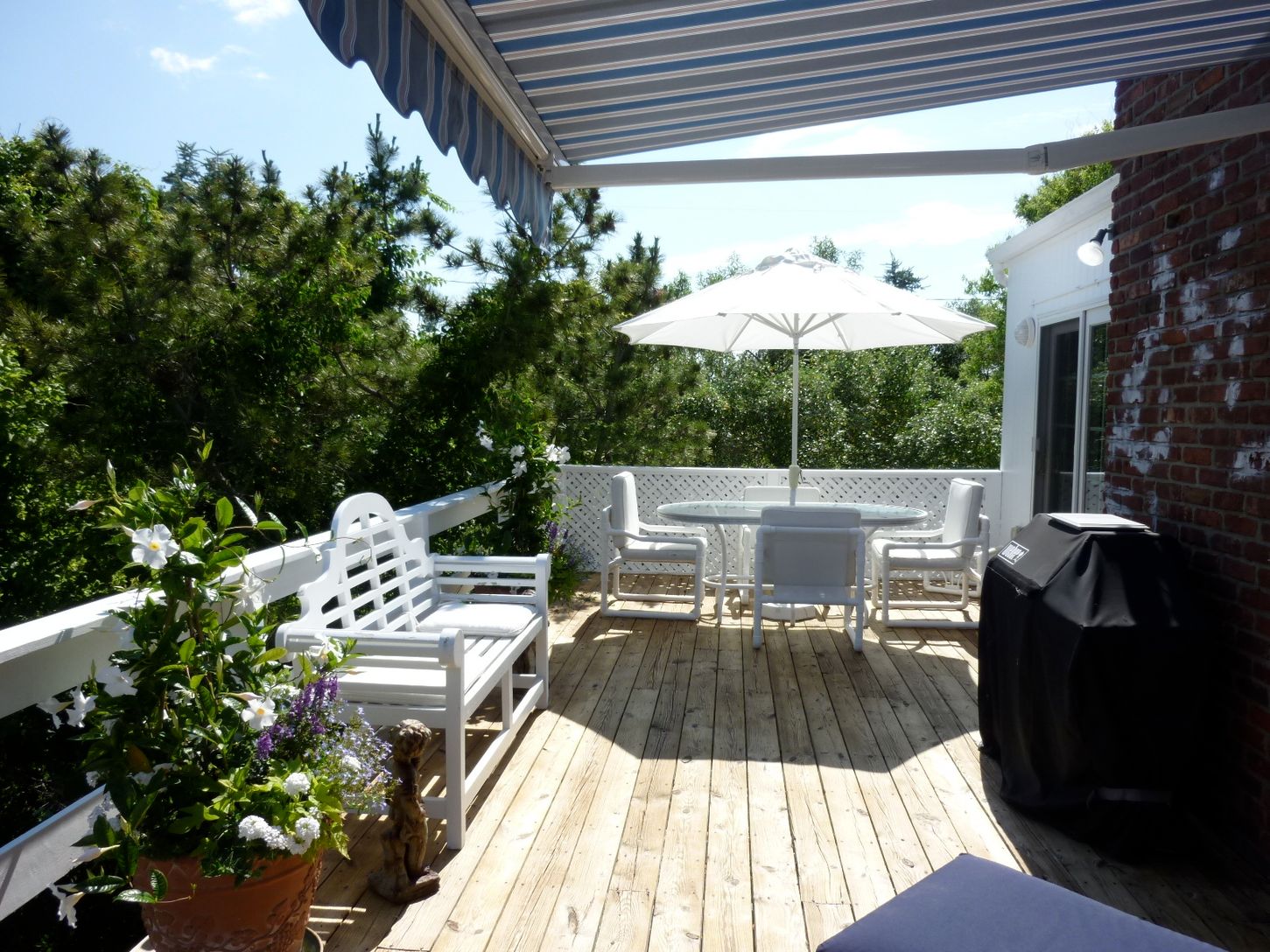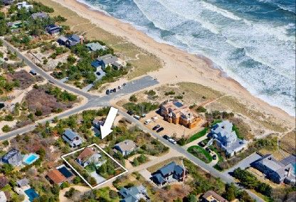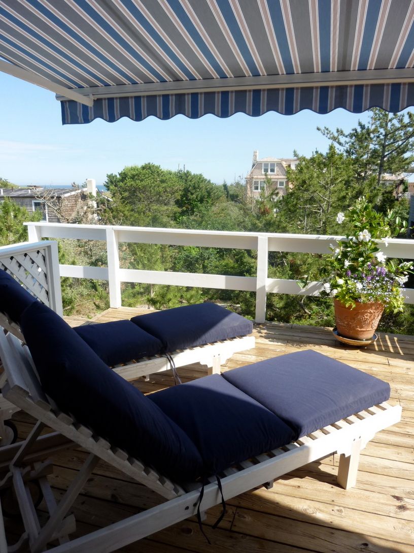 This sunny contemporary, just one house off Marine Boulevard, offers ocean views and breezes. This sophisticated home has a gracious entry foyer, 3 bedrooms, 2 full bathrooms, plus a full powder room. The light filled living room features a cathedral ceiling, wood-burning fireplace, and built in bar. It opens to the kitchen and dining area. The outdoor space includes 1500 square feet of decking. The upper deck has ocean views, and the private