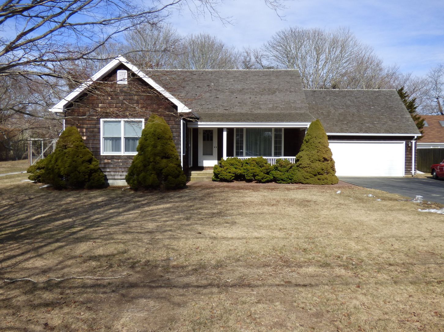 South of the highway on a tree-lined lane, half way between the Village and the Atlantic, this cedar shingled traditional is yours for the taking. Enjoy as-is this summer while you plan the perfect renovation. Three bedrooms, two and one half baths, eat-in-kitchen and nice size living room. Two car garage and room for pool on 0.4 acre.