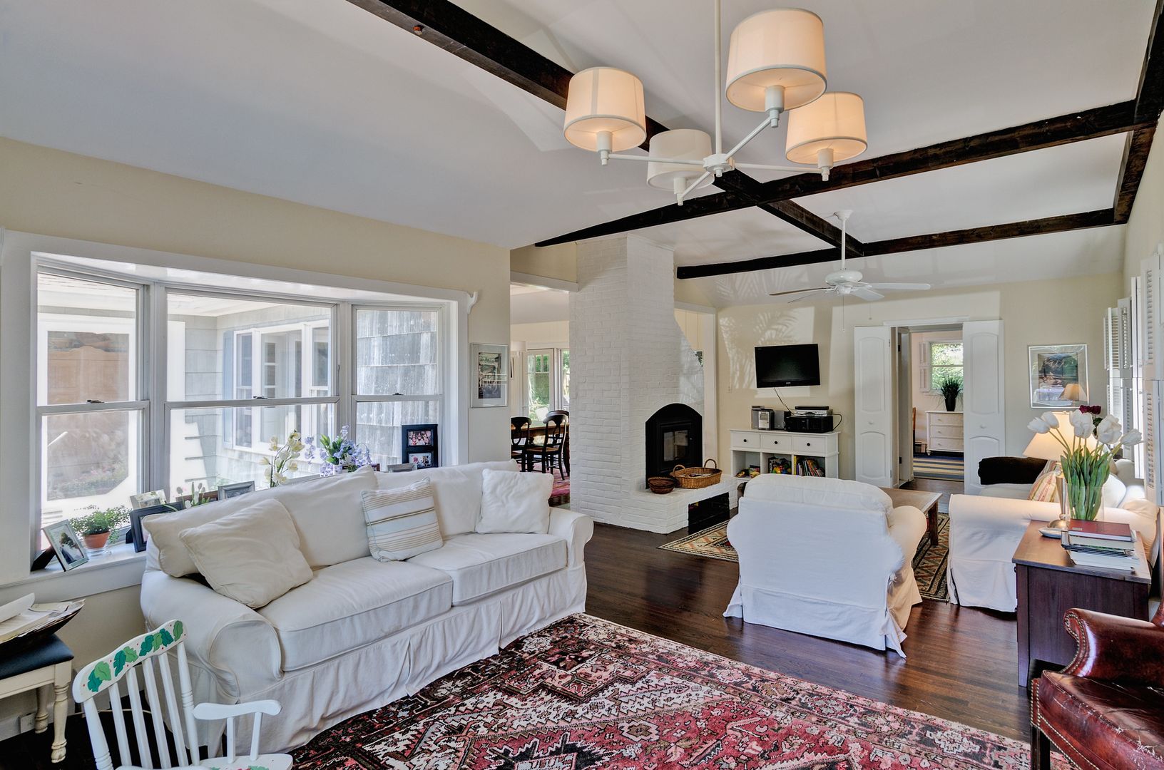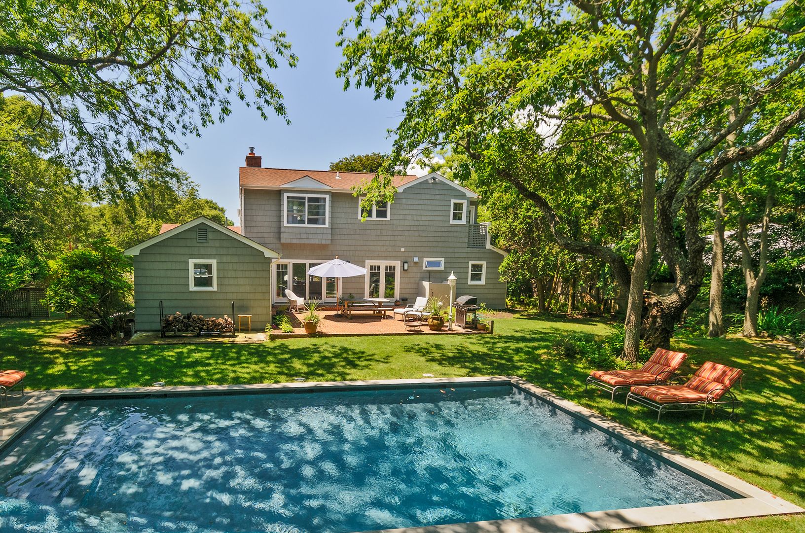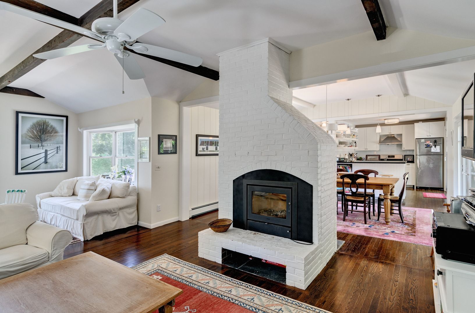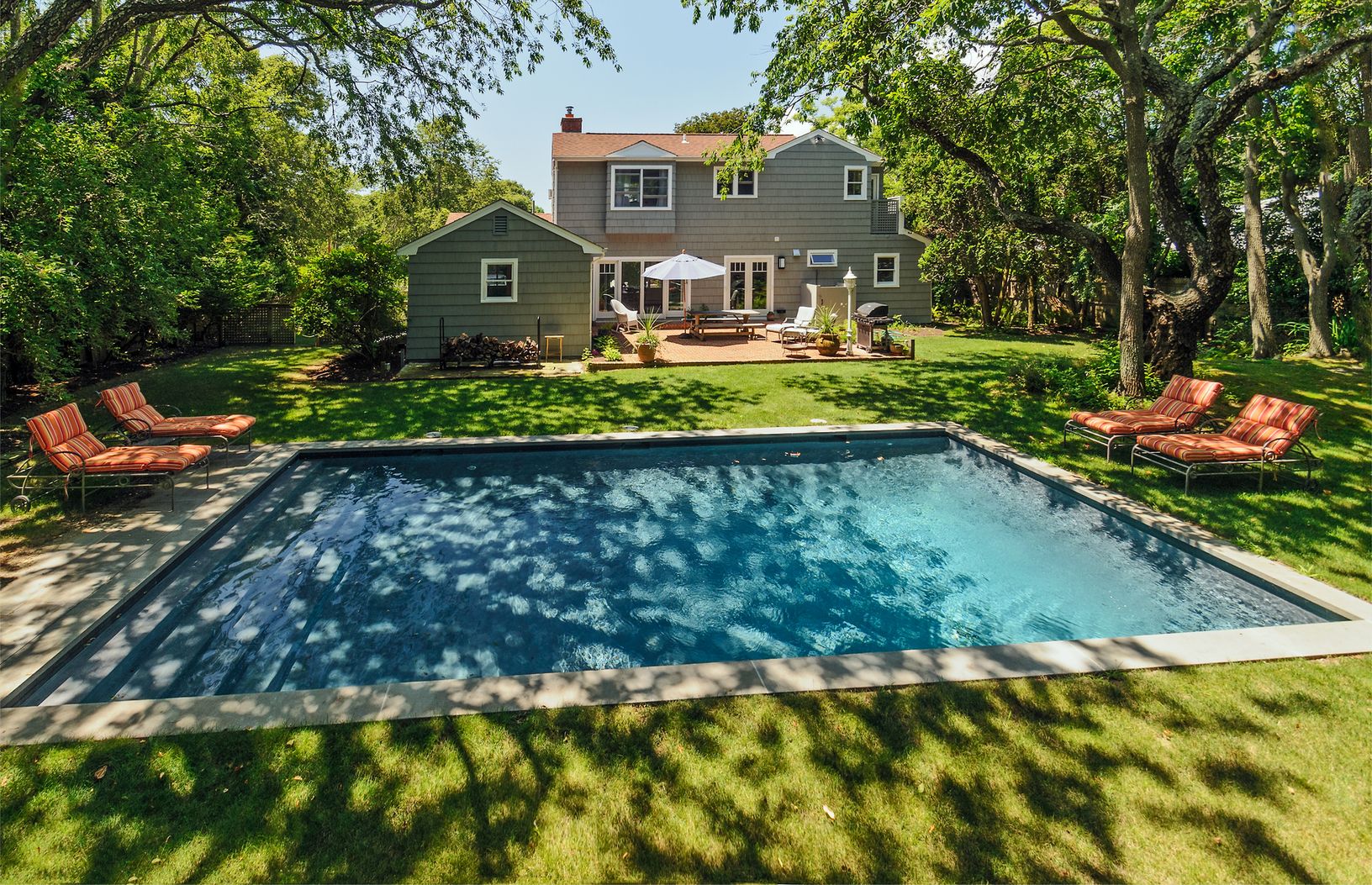 Ideal beach home in Amagansett south in the best part of the lanes - striking distance to the ocean and to town. A winding brick path leads to a flower garden that surrounds the front door. Beyond the vestibule, find a welcoming, sun filled open living room with a two sided fireplace warming both the dining room and living room area. The wonderfully renovated kitchen opens up to the dining room as well as the back patio and pool area. There