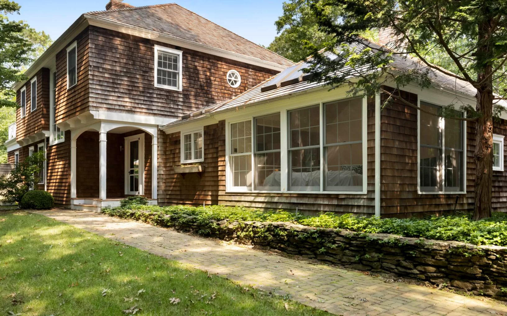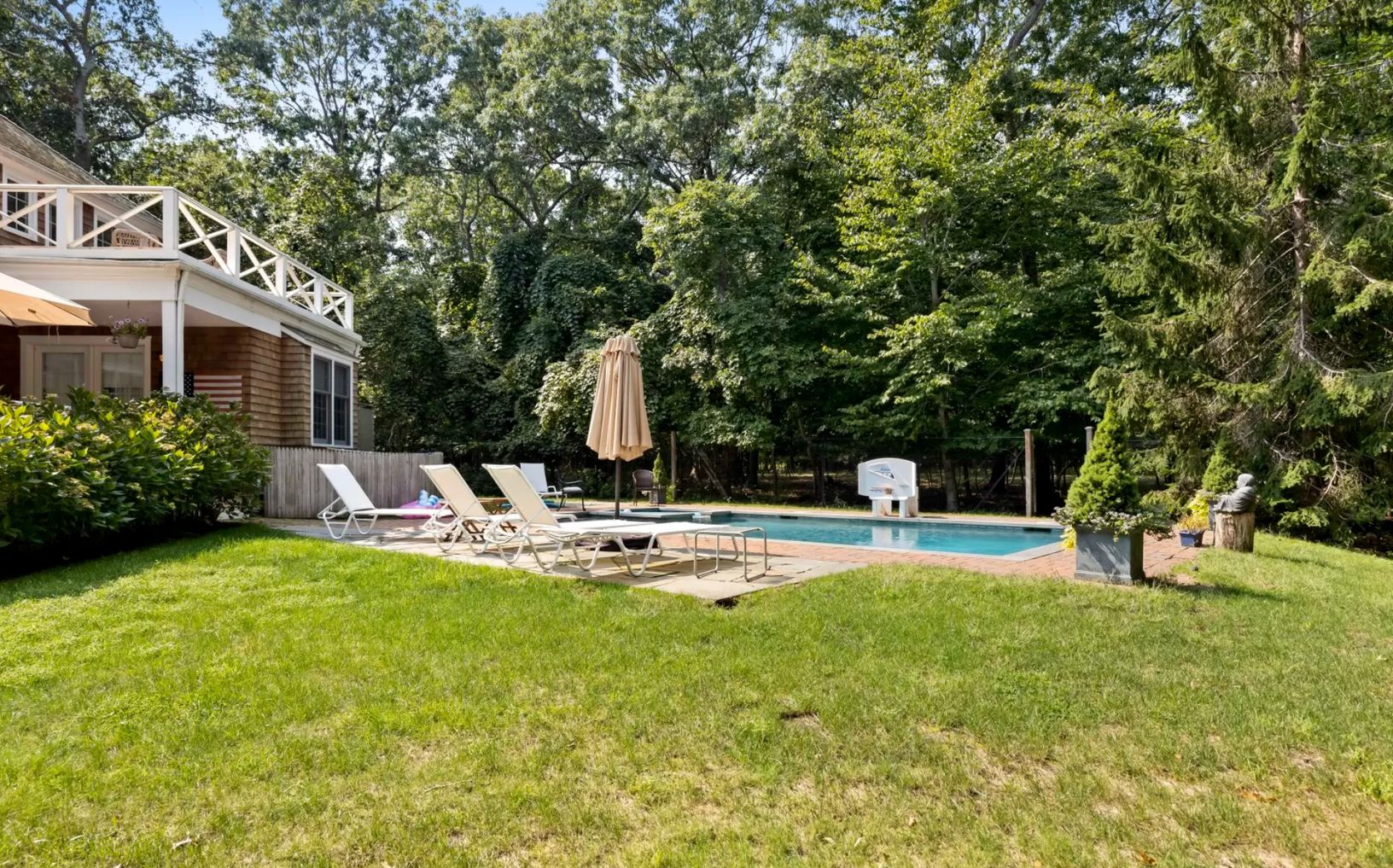 This cedar shingle two-story Built in 1992 on 1.7 acres on the lovely Bell Estate, adjacent to the Nature Conservancy Reserve. Living room with fireplace, master suite with fireplace and top deck, sunroom off kitchen (with wood burning stove). The communal rooms benefit from cathedral ceilings because they offer light and airiness. There is plenty space for outdoor activities. Gunite pool with heating. Showering outside. New bathrooms and a re