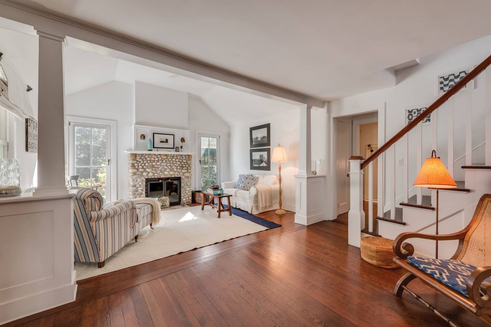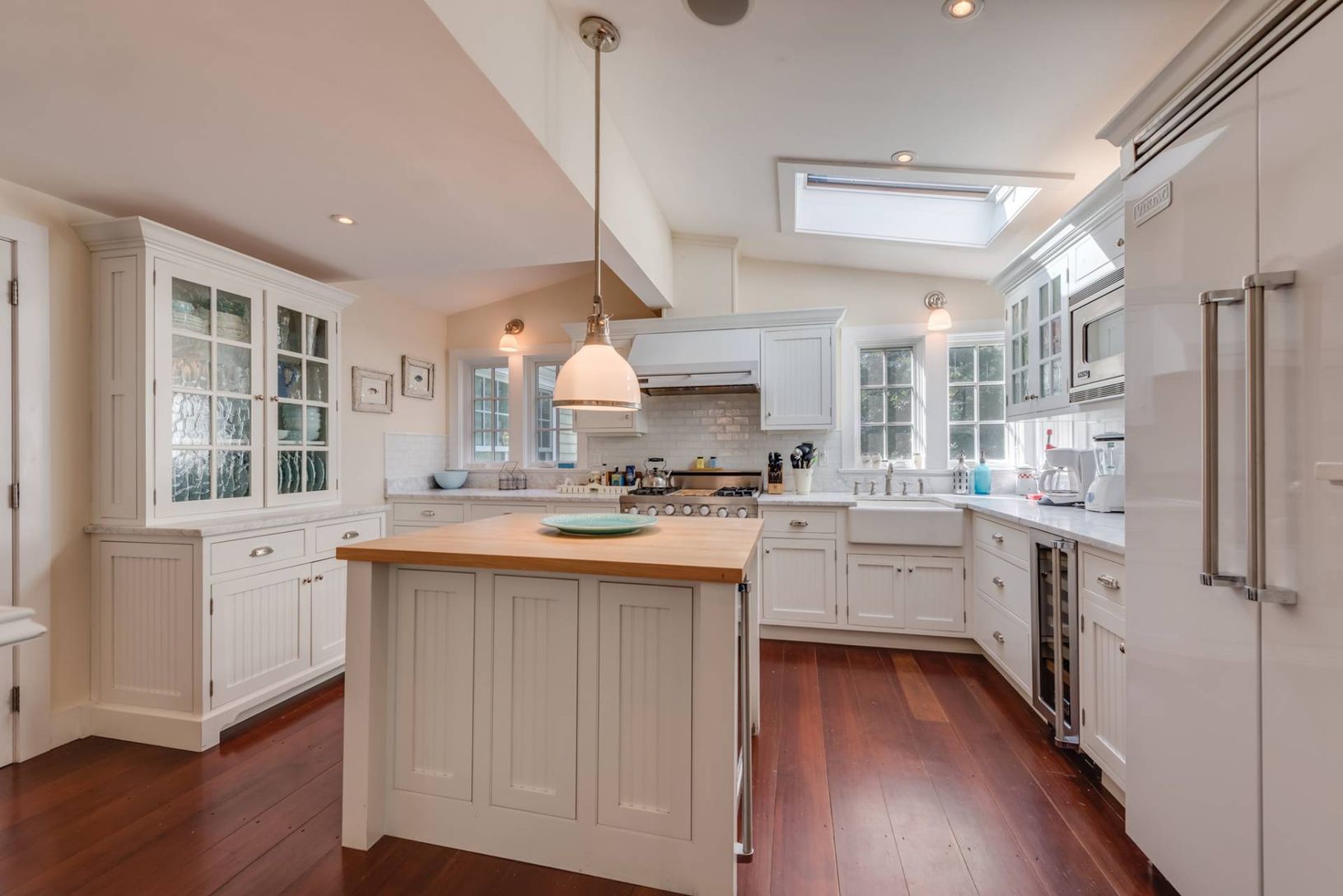 Make summer memories in this welcoming renovated farmhouse right in the heart of charming Amagansett. The restaurants, shops and other delights of the hamlet center are just a few blocks away, with the train and Jitney also nearby, and ocean beaches minutes away. This beautifully appointed four bedroom, four bath home is light and bright, with a welcoming vibe. Light-filled living areas flow smoothly among the living room with fieldstone firep