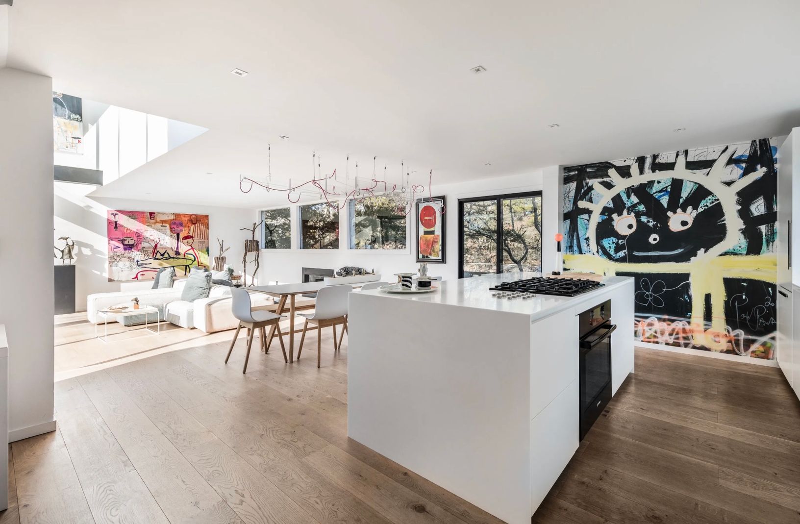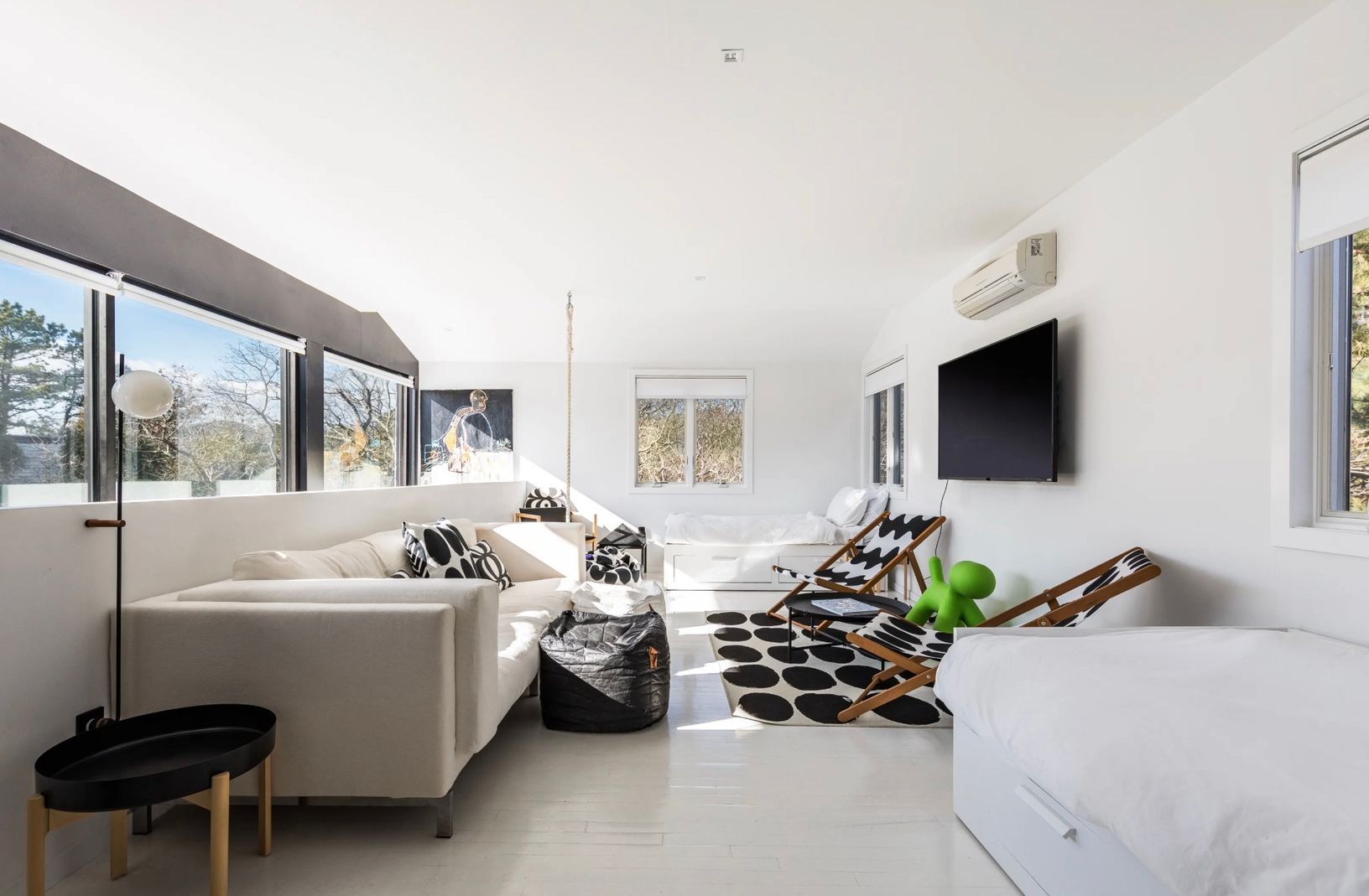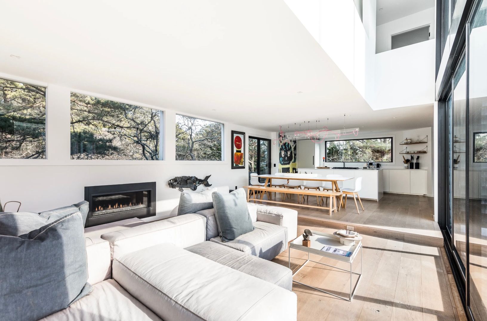 This furnished contemporary home, built in 2017, offers approximately 2,270 square feet of comfortable living across two levels. Features include hardwood floors throughout, an open layout, and a welcoming living area with a fireplace.