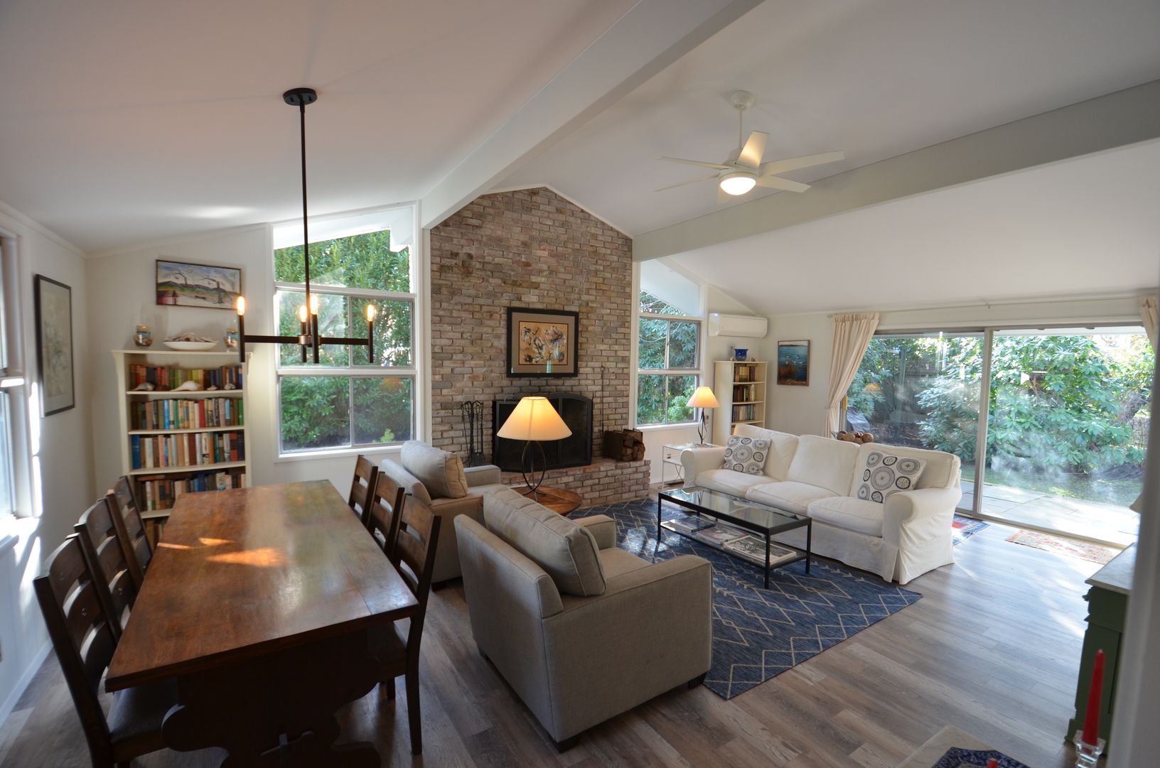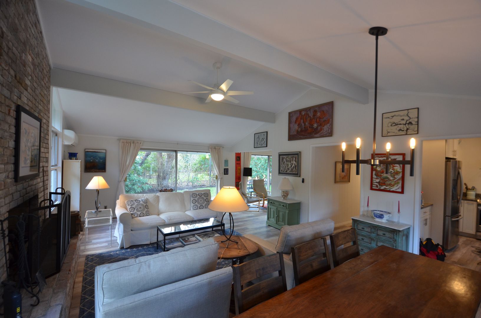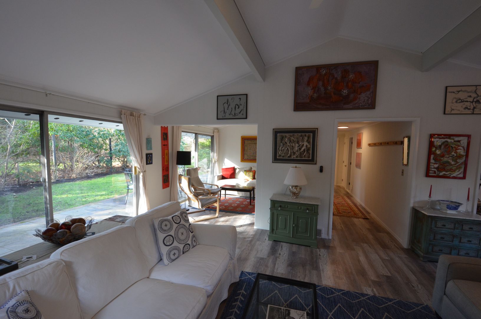 Amagansett - This desirable Bluff Road location is only a short distance to the beach and town. It Is a one-story, 3 bedroom, 3 bath mid-century modern house with cathedral ceilings and large sliding glass doors, opening to the beautifully landscaped yard and brand new heated gunite pool.The living/dining area has a fireplace, adjoining den, and patio. It has an eat-in kitchen with all appliances..