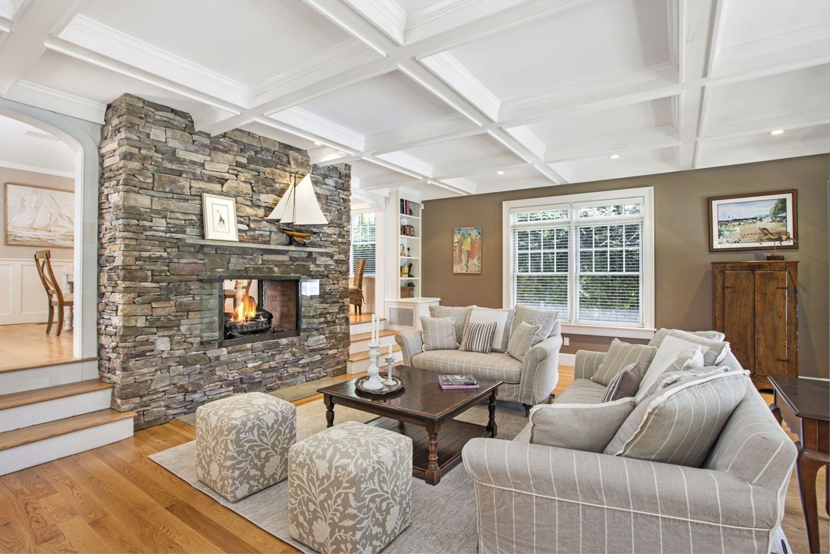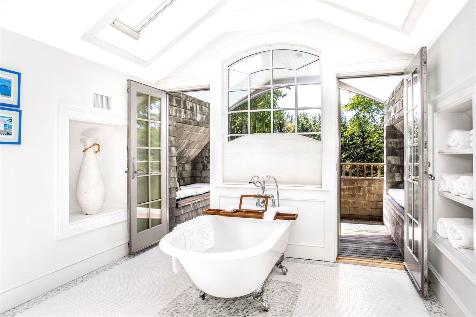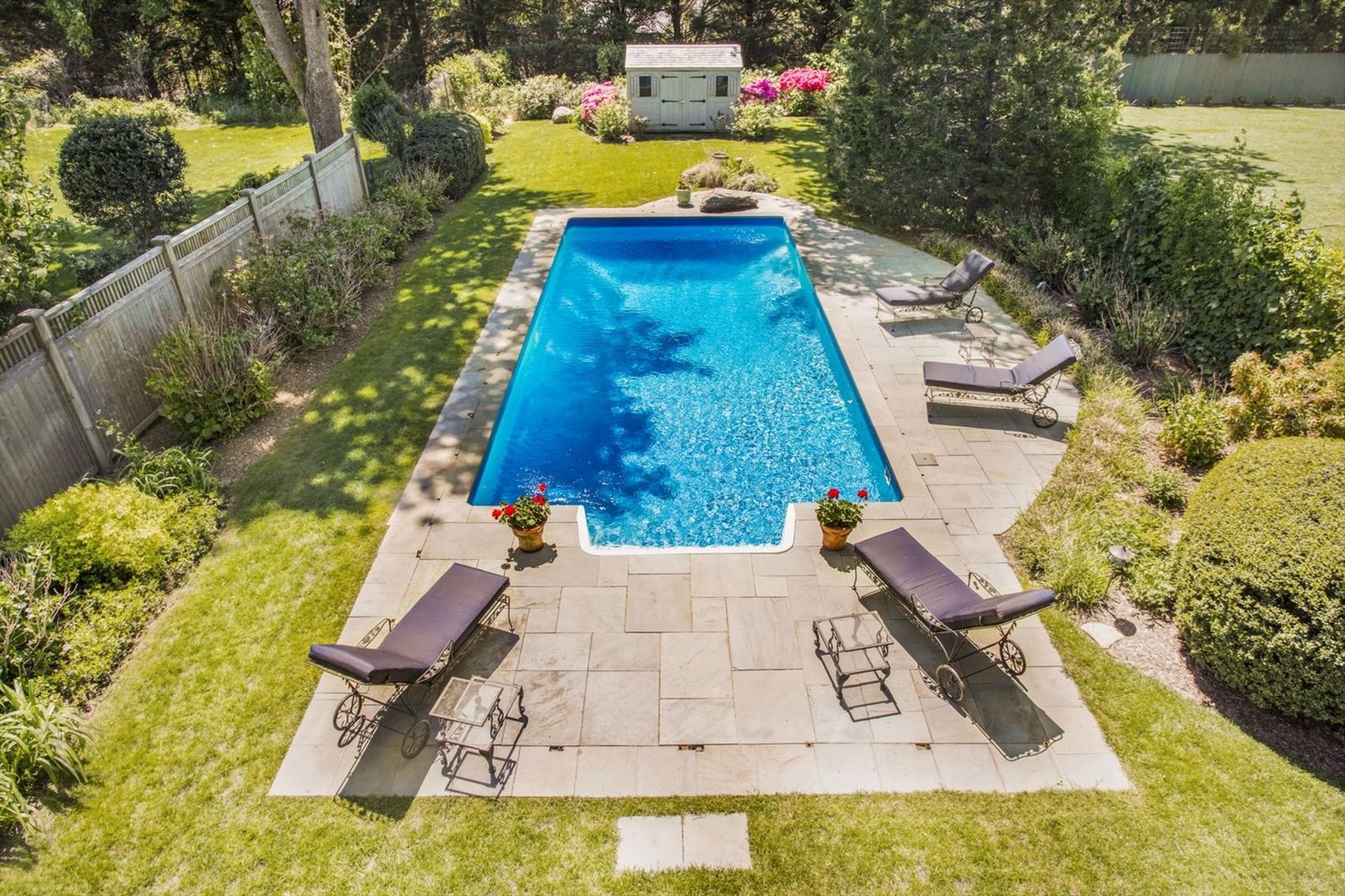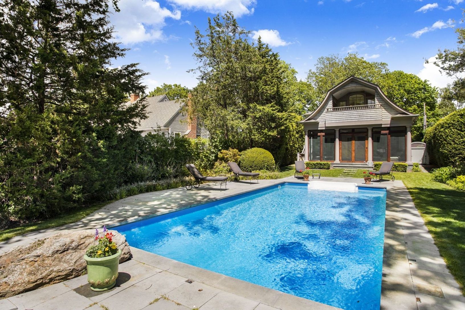 Not a stone has been left unturned in this handsome two story Traditional. Two master suites one down and one up with handsome built-in mahogany lounges on the second story deck overlooking the heated pool. A chef's kitchen and a double-sided fireplace, a formal dining room and a screened porch to while away the hours overlooking the glorious garden. Close to the Jitney and the train station five minutes away. Can't you hear the ocean alread