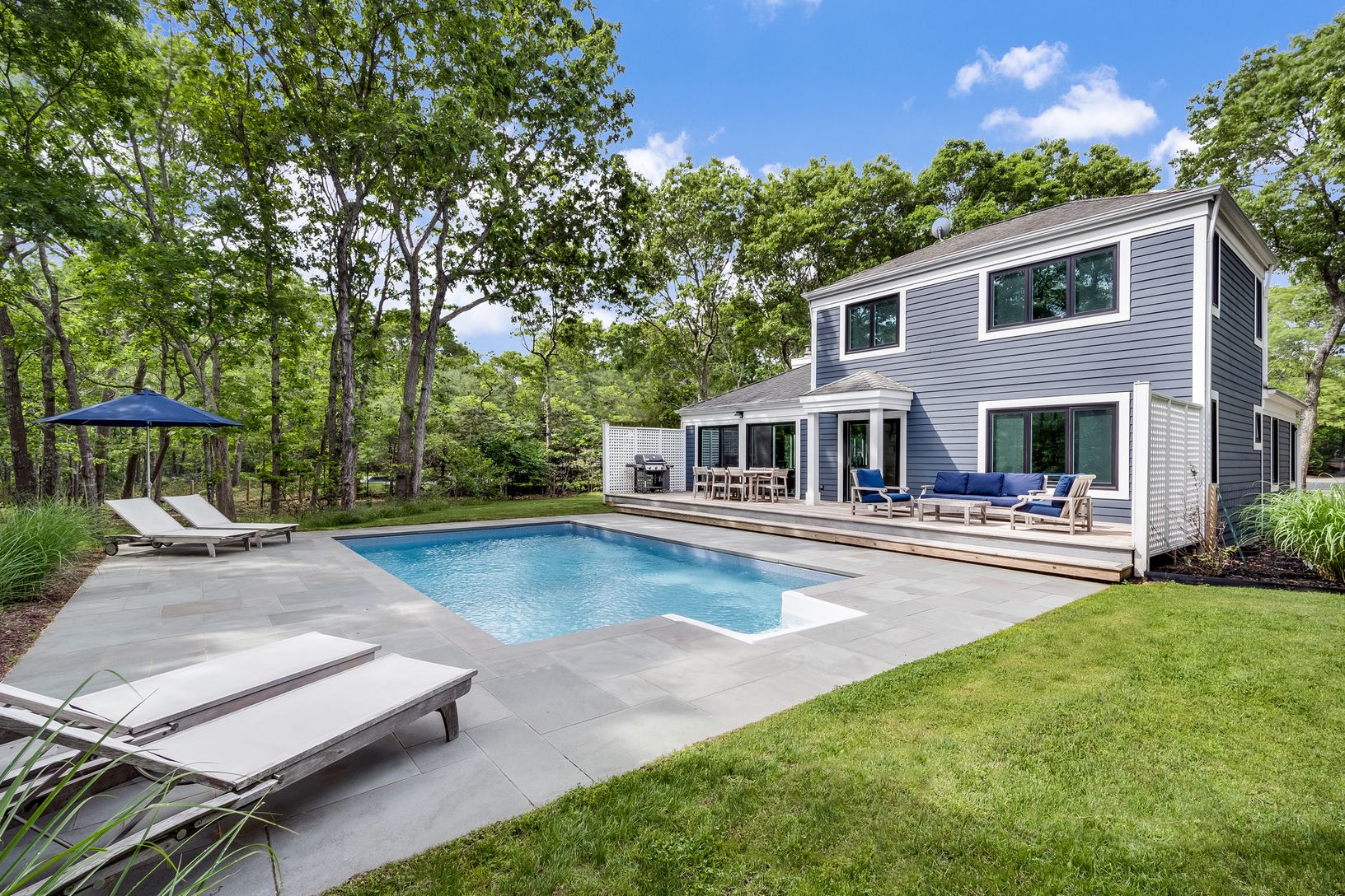 Located at the end of a quiet cul-de-sac this bright and open Contemporary home was designer renovated and furnished in 2014 - to include new a kitchen/ bathrooms/ HVAC/ hot water on demand/ windows/ flooring/ decking/ pool equipment and landscaping. A professional open kitchen, three bedrooms, three bathrooms and open space for entertaining make this a perfect place to relax. Take a dip in the salt water heated pool or enjoy Long Pond Greenbe