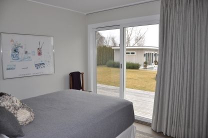 Enter into this Bridgehampton South home and be wowed by the design, the light and the land. Designed for easy living both indoors and out, this one-story four bedroom home on .6 acres has been renovated from top to bottom with custom designed finishes. Set around a courtyard, letting the light and the outdoors in, stand the living room, the kitchen, dining area, and the passage leading to the bedrooms. The living room with a wood-burning fi