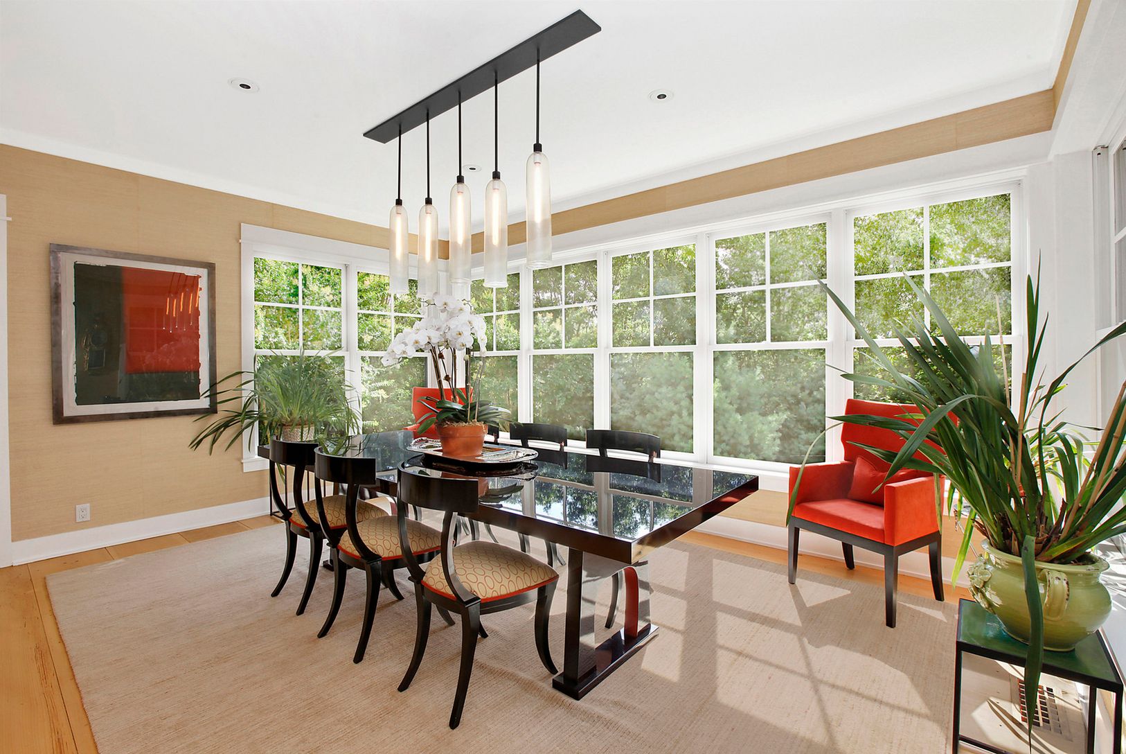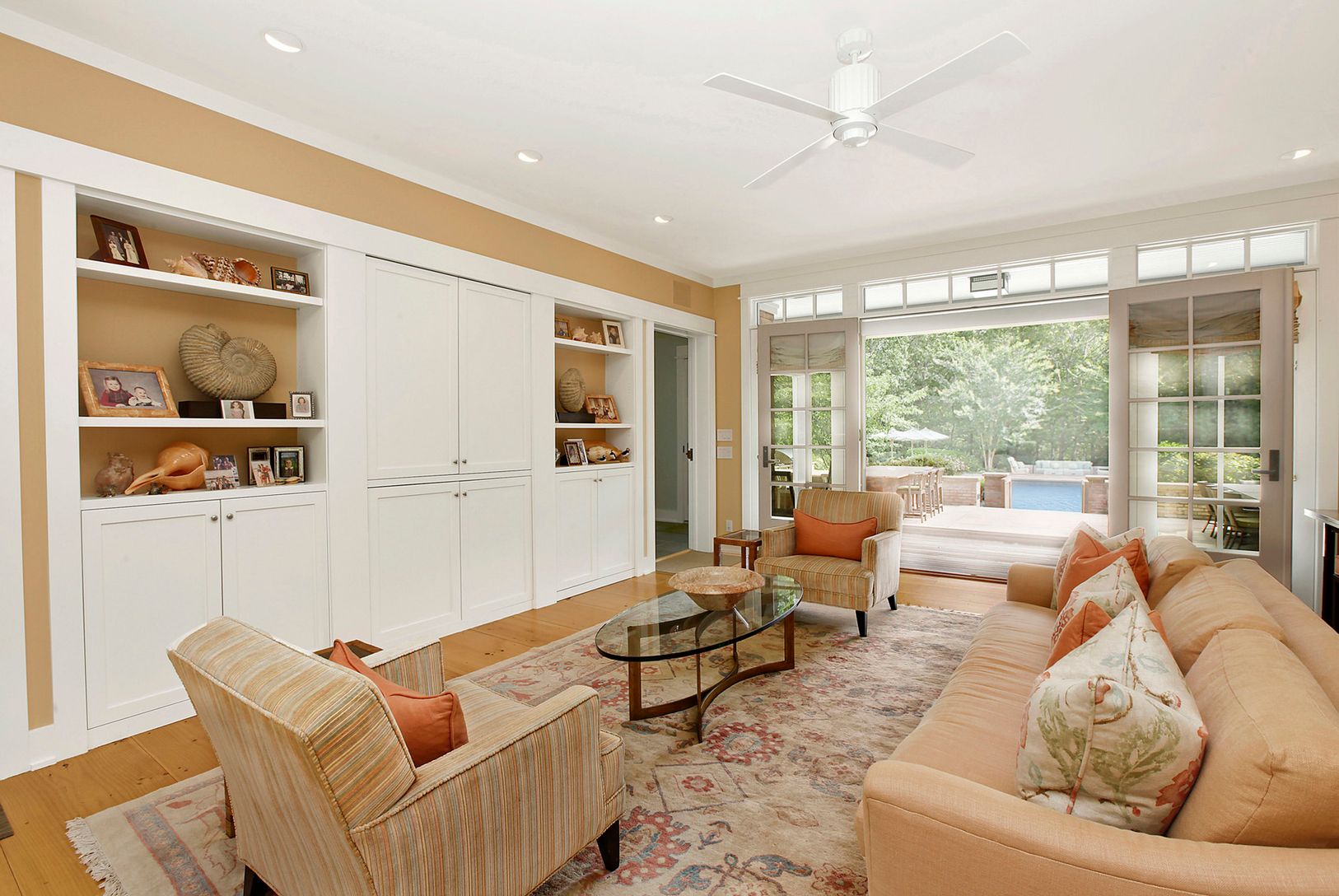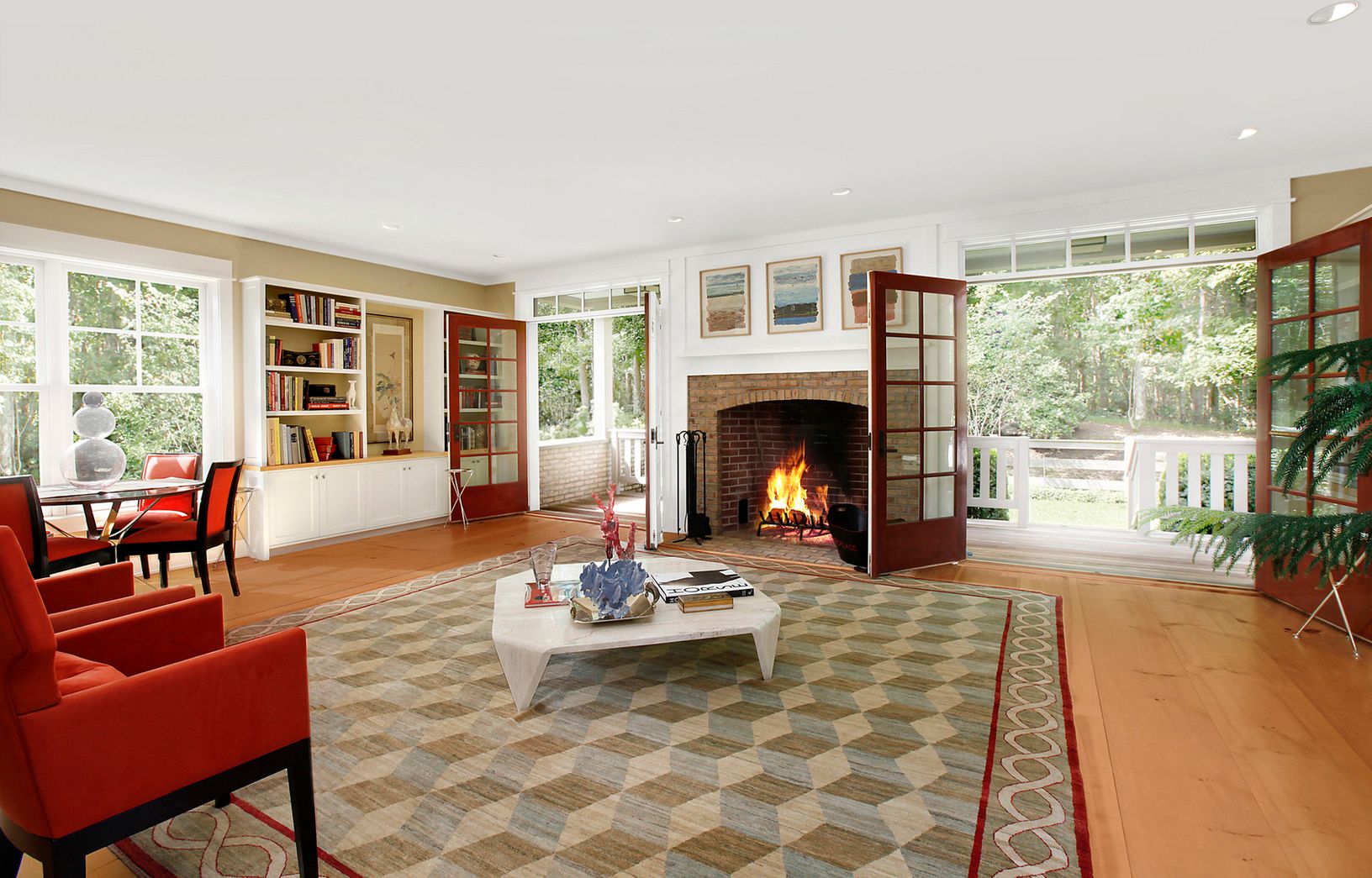 The vast property has been featured in home design and architecture magazines for its distinctive beauty. Living room with fireplace, great room, fami