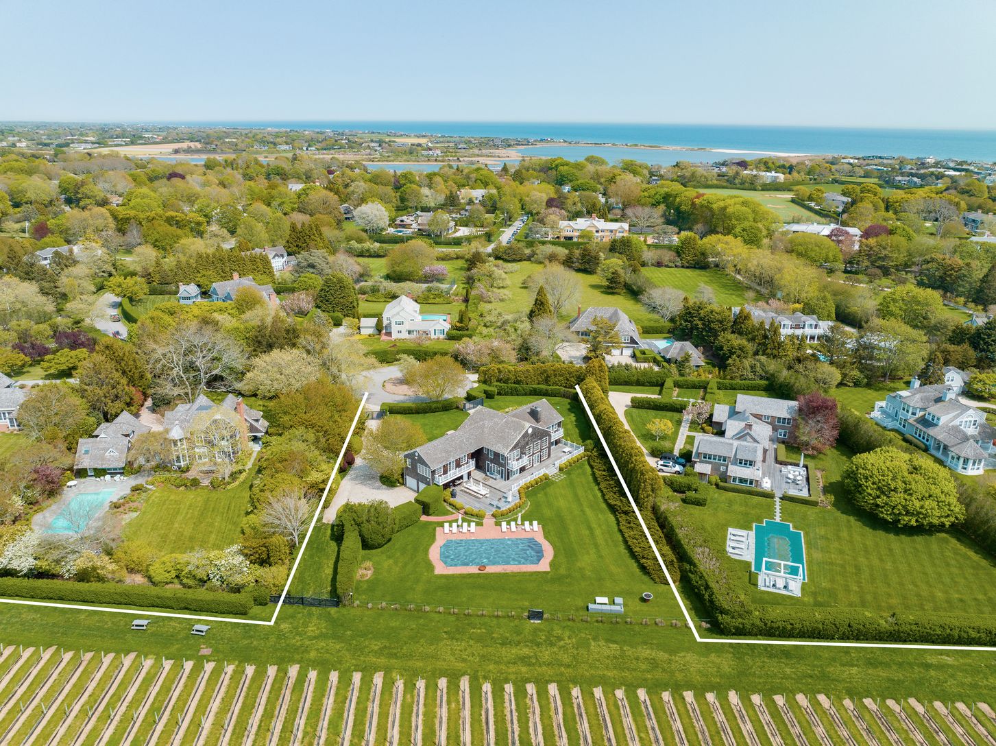 Experience the pinnacle of Hamptons living in this extraordinary Bridgehampton estate, nestled south of the highway on 8.23 acres of breathtaking landscape. Tucked away at the end of a tranquil cul-de-sac, this one-of-a-kind property boasts a fully functioning private vineyard producing 10,000 - 12,000 bottles of Sauvignon Blanc, Sirah, and Cabernet Franc, offering an unparalleled lifestyle of elegance and exclusivity. The existing 7,000 sq. f