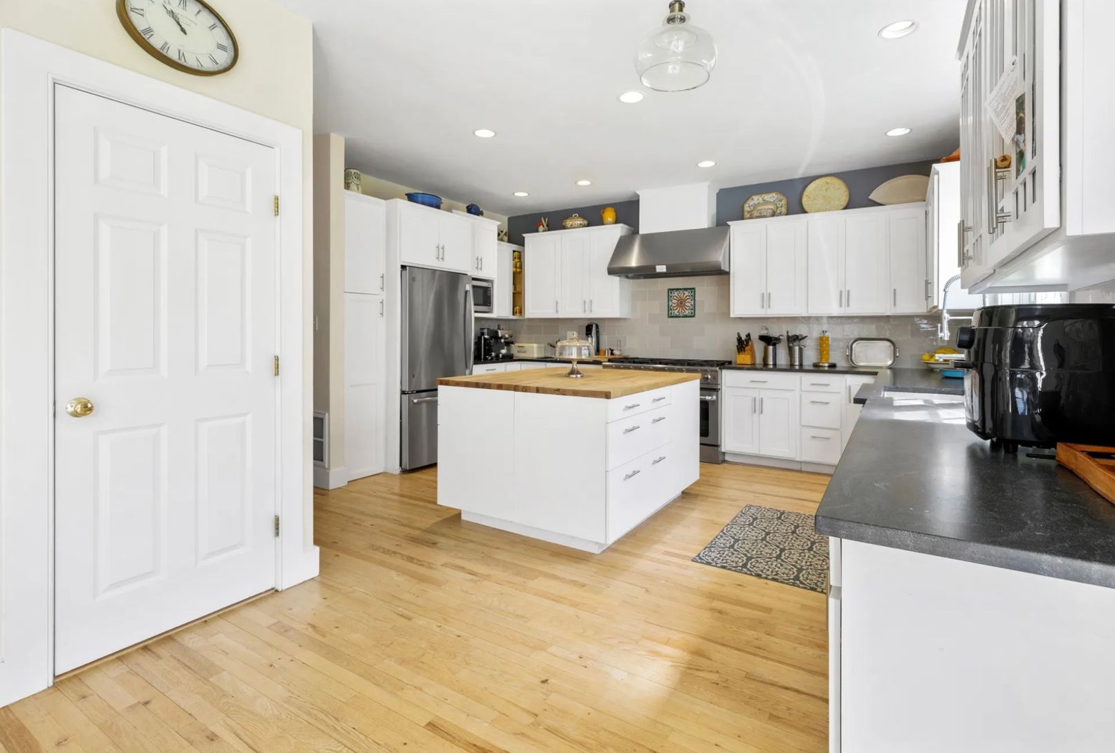 The main level features a desirable first-floor primary suite with an en-suite bath, along with expansive gather