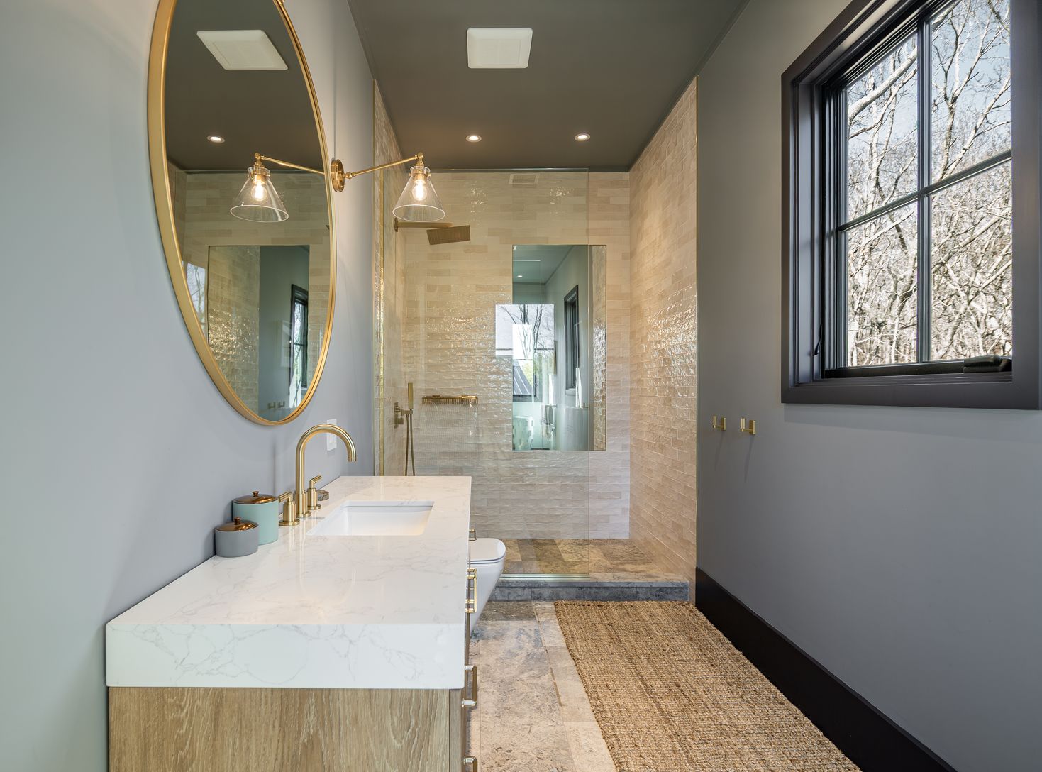 Discover a newly completed 2025 modern residence, quietly set far back from the road for exceptional privacy. Thoughtfully designed, the home features three generously scaled primary suites and a striking great room with balcony, oriented toward serene views of the 100-foot pool, spa, and brick‑lined terrace. A covered porch and outdoor dining area invite relaxed gatherings framed by the natural landscape. Inside, a spacious chef's kitchen anc