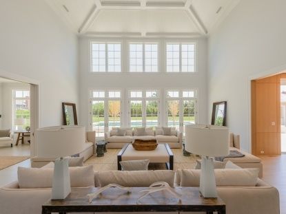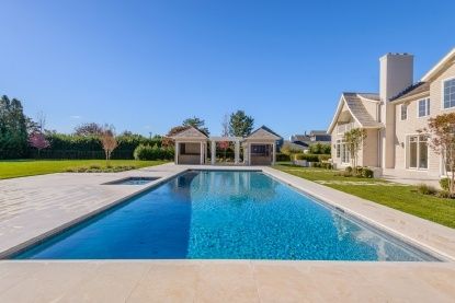 This beautiful, newly constructed Estate is available for your summer holiday escape to the ocean. Featuring eight bedrooms, nine full baths and one powder room, a gourmet kitchen with top-of-the-line appliances, built-in outdoor grilling area, two pool houses, first floor theater/cinema, hot tub and heated gunite pool plus a three-car garage are only a few of the features to enjoy. The two-story coffered ceiling formal living room flows comfo