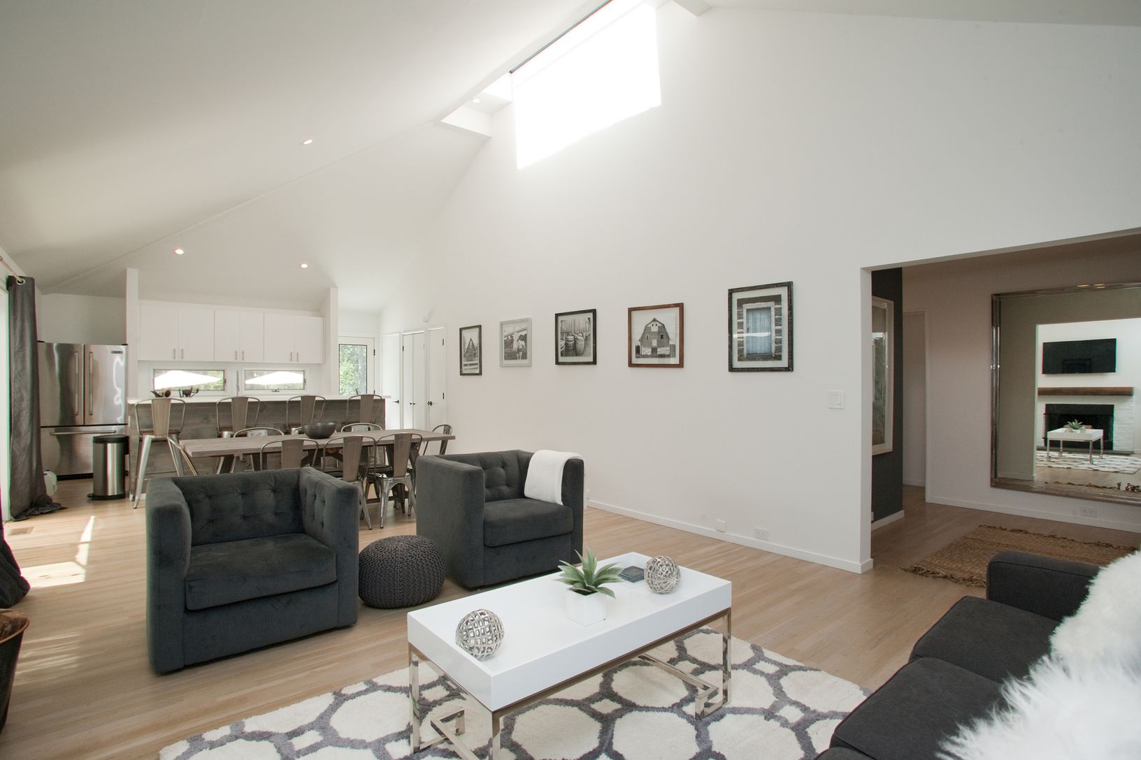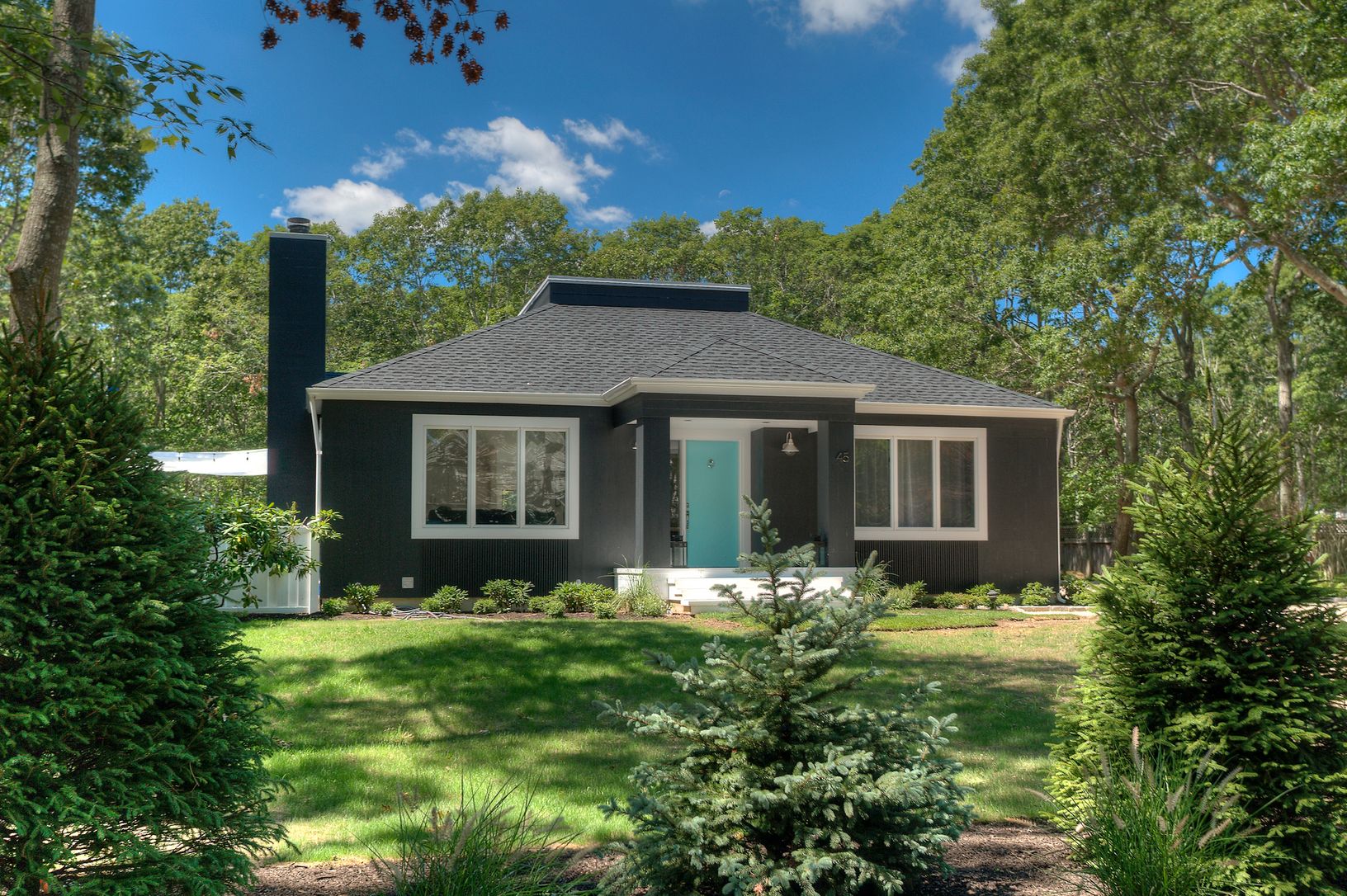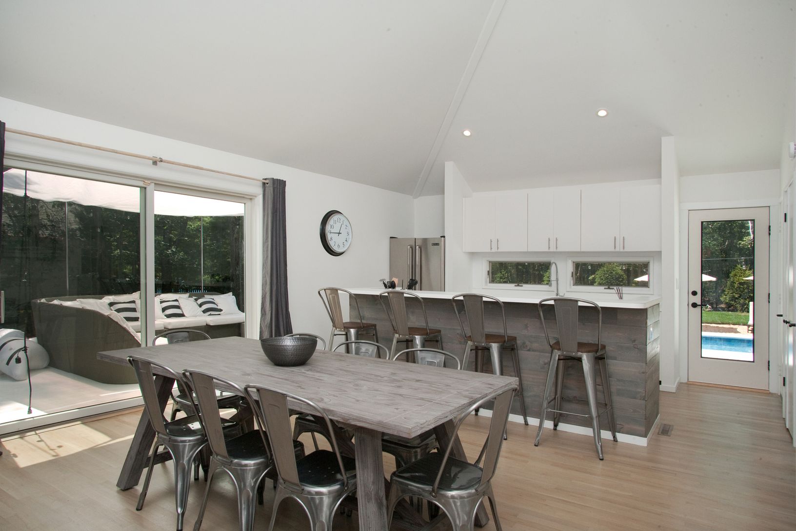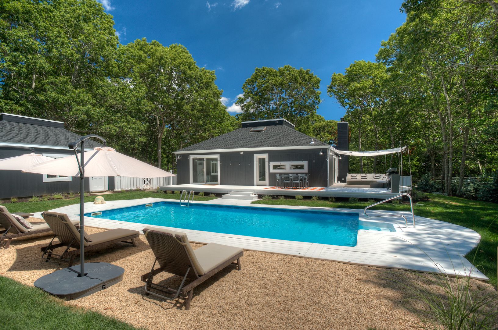 Located on a quiet cul-de-sac just minutes from Bridgehampton village and ocean beaches, this stylish contemporary offers easy one floor living. Bright and spacious with 3 bedrooms, 2 baths, open kitchen, dining and living room with wood burning fireplace. Skylights in the cathedral ceilings wash the home in sunlight. Outside, features ample decking for entertaining, pool, detached garage, outdoor shower and quiet property abutting open land