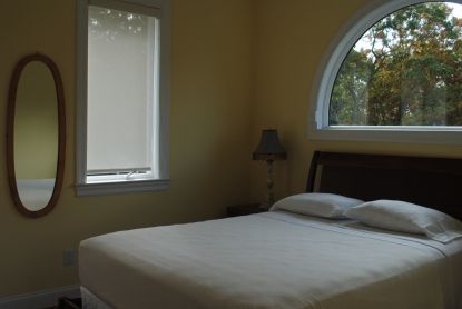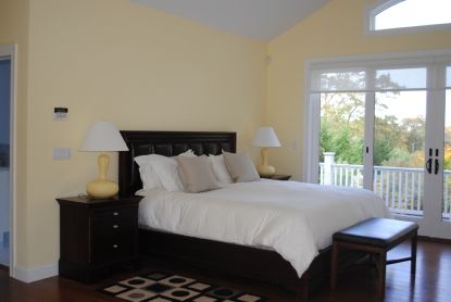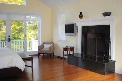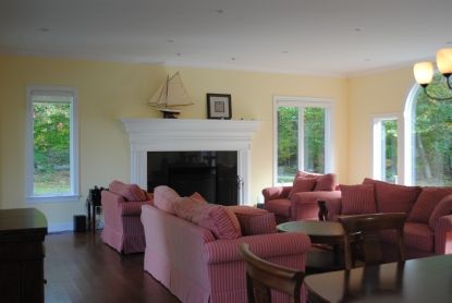 Beautiful newly constructed three-story traditional, secluded on an acre +/- of property overlooking Three Mile Harbor. This expertly crafted house features an impressive double-height foyer with chandelier, living room and dining area with large marble fireplace, fully-equipped professional kitchen with breakfast island, gathering room with stone fireplace, four large bedrooms, all with en suite baths (one with forced-air Jacuzzi), and a mast