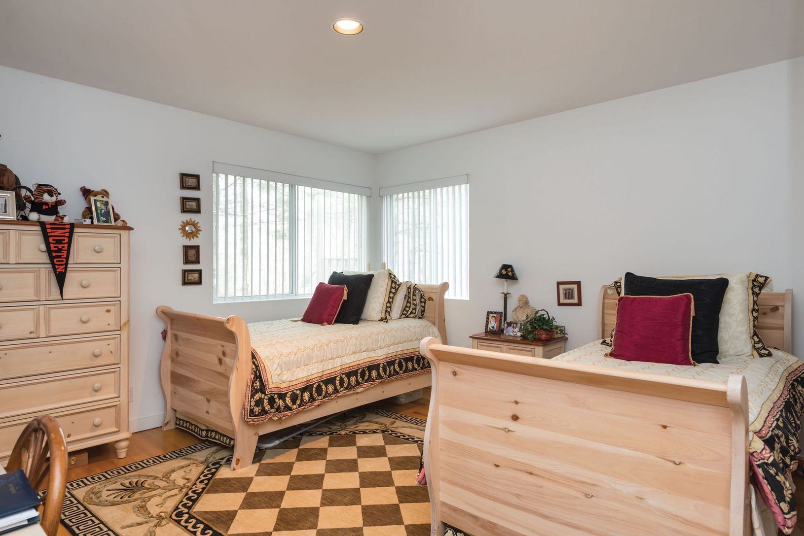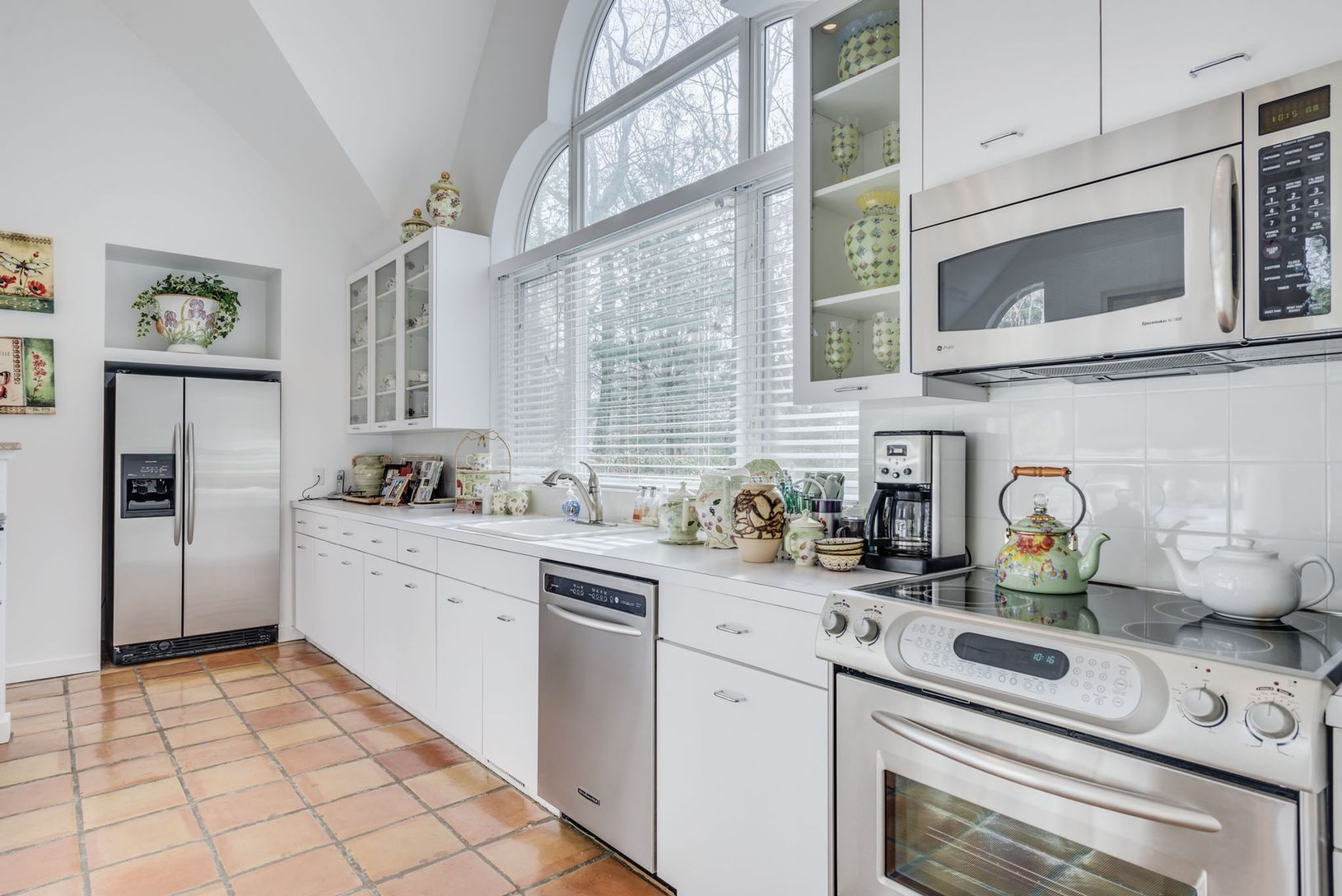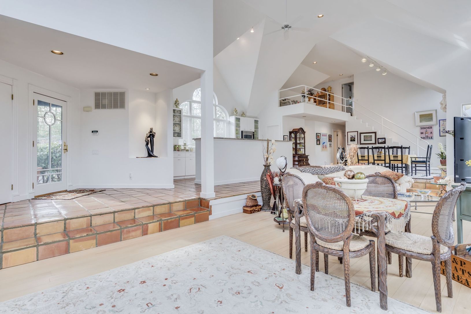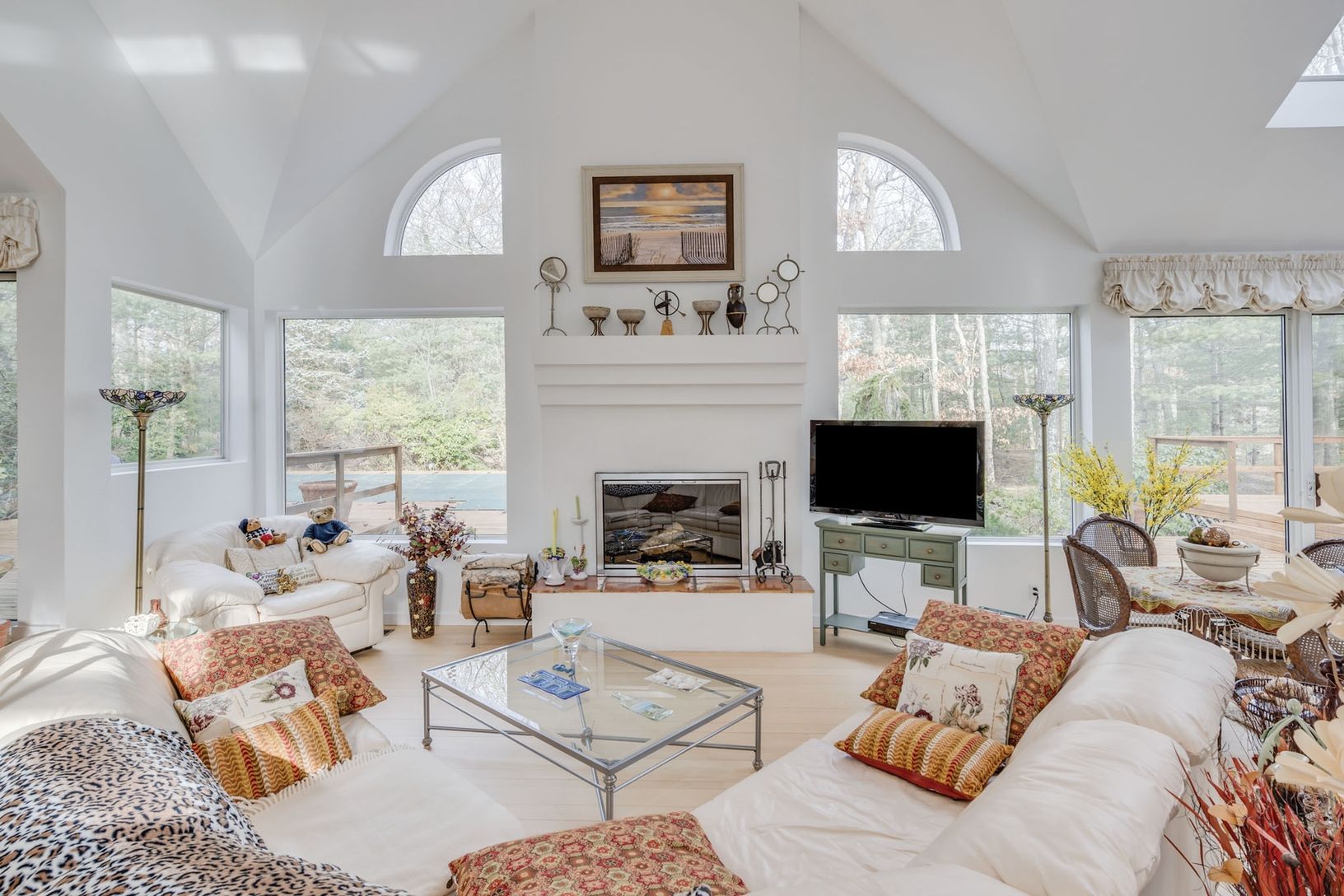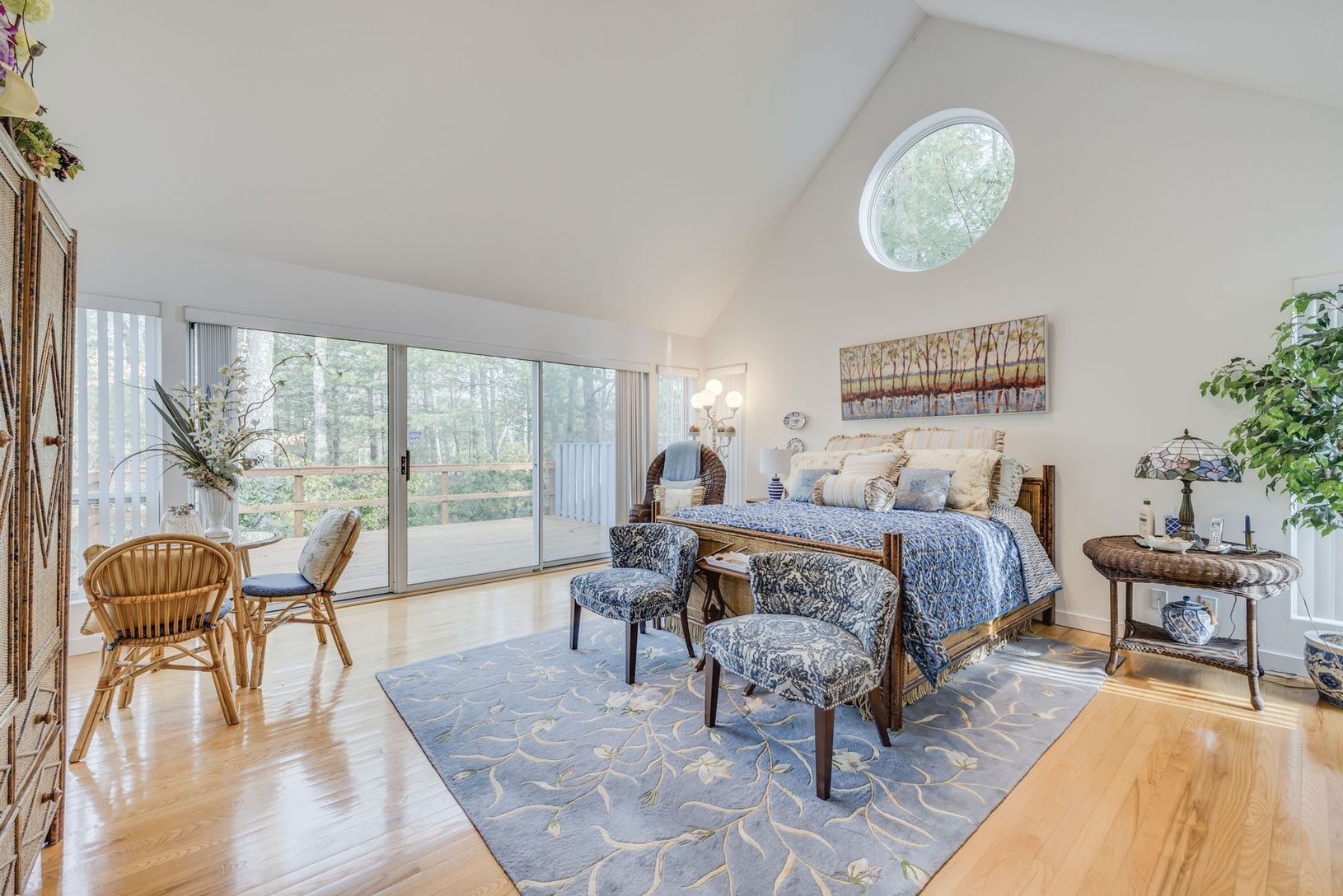 This bright open plan home features four bedrooms, three and a half baths, a large entertaining deck and pool, and is located on 1.6 +/- acres close to Three Mile Harbor. The open plan living room, dining room and kitchen are surrounded by large windows and sliding doors offering beautiful light throughout the day. The master bedroom suite is located on one side of the home, and features a beautiful large master bathroom, and a private deck of