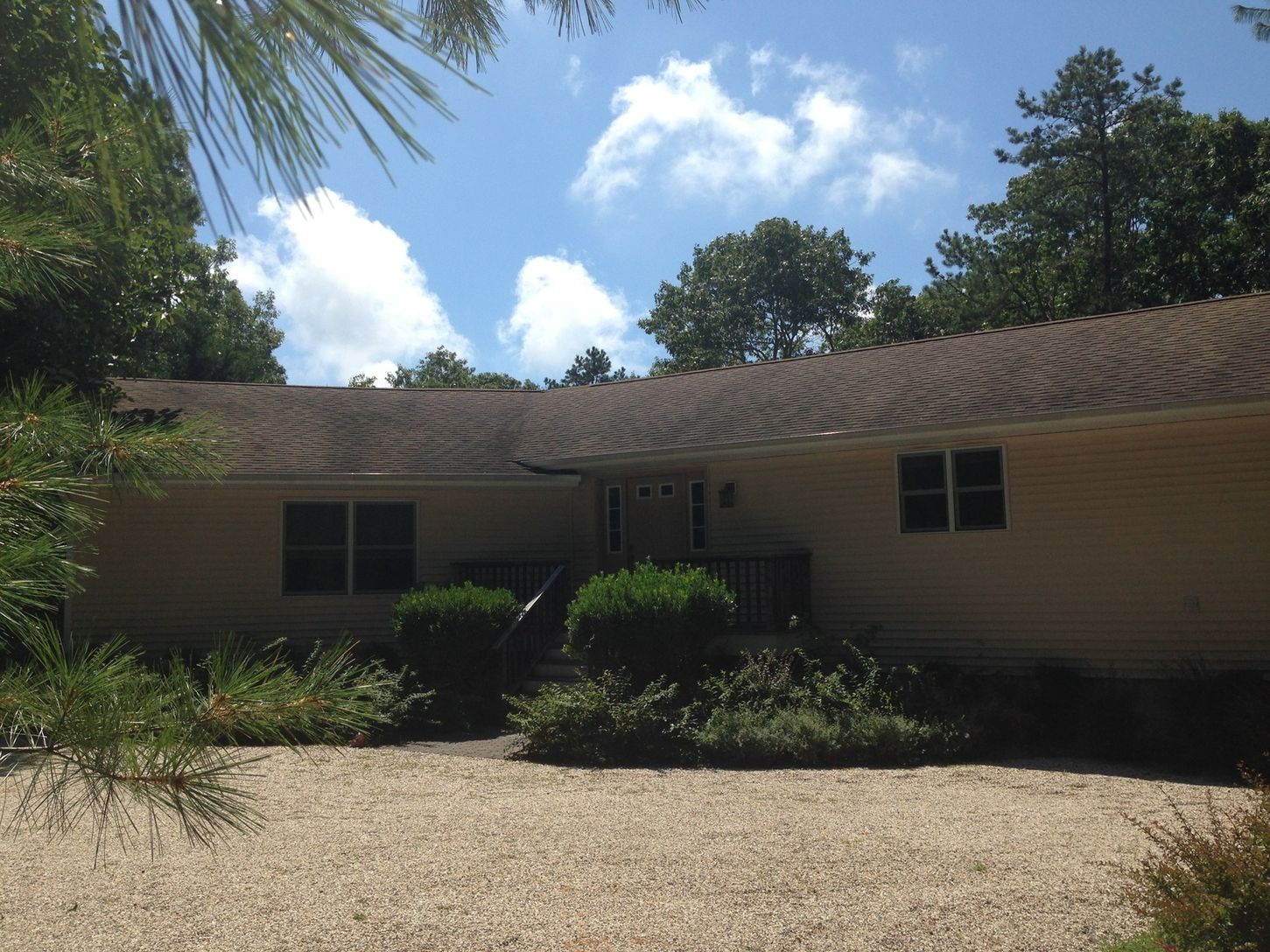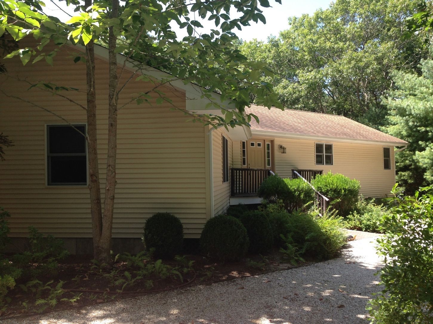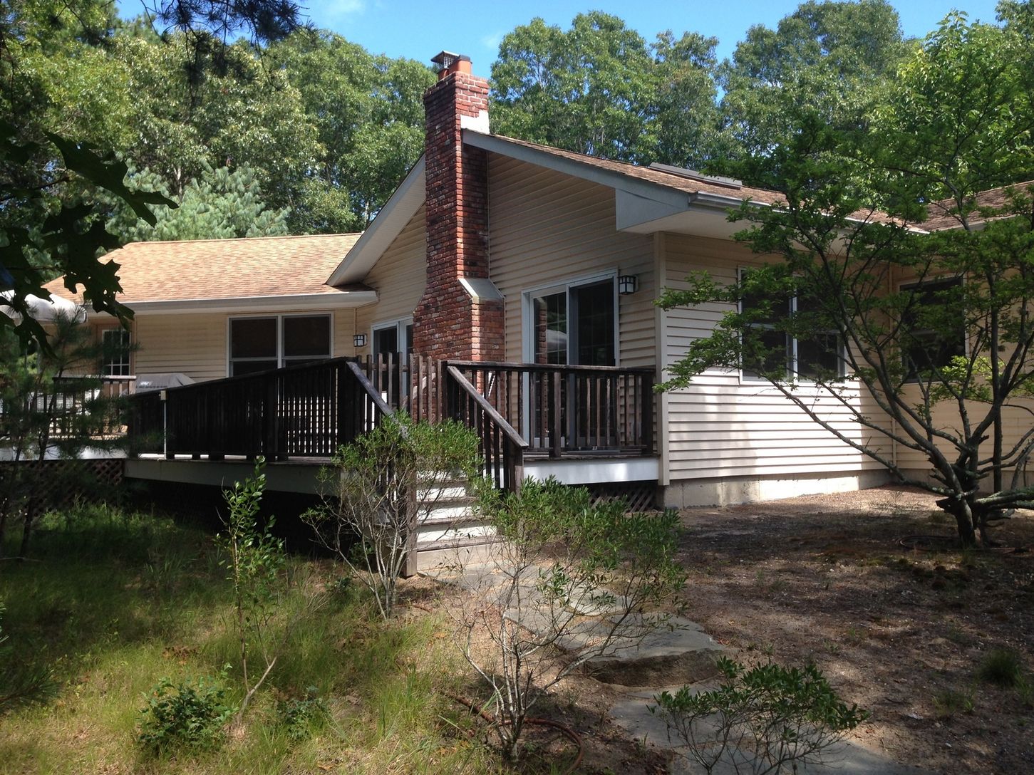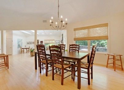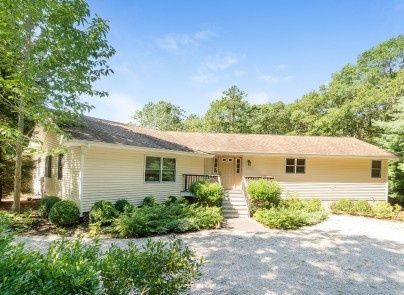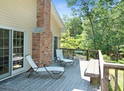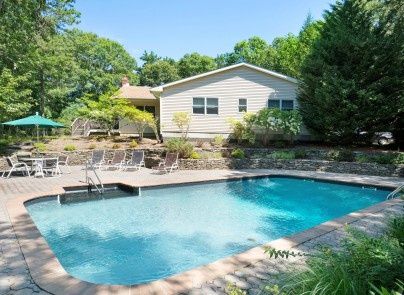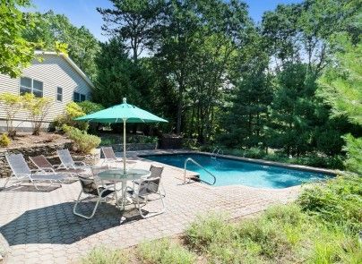 This open layout contemporary is centrally located in East Hampton and is situated at the end of a quiet cul-de-sac. With lofted ceilings, an open floor plan and a large fireplace the bright open feeling is also quaint and cozy. The backyard offers plenty of decking, and patio around the pool area. The interior has an eat-in kitchen, dining area, and mudroom area leading out to the backyard. Four nicely proportioned bedrooms with two and half