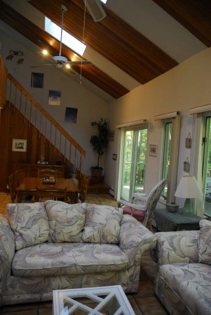 On a bucolic half-acre, this two-story Saltbox contemporary is surrounded by sun-dappled woods off a lovely tree-lined street, just minutes from bay beaches and beautiful sunsets. Included in 1800 square feet of living space are three bedrooms, two baths, double height living room with fireplace, dining room, and eat-in kitchen. Relax outside on a large wrap-around deck overlooking heated swimming pool. CAC. A hidden gem in Springs.