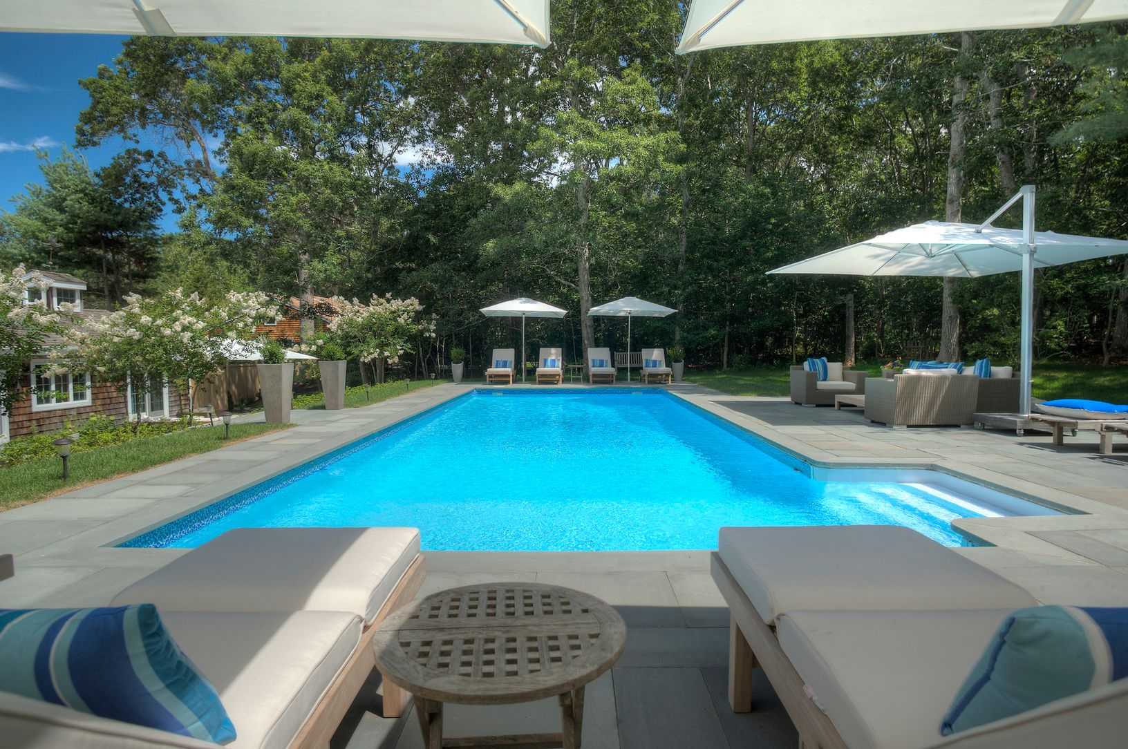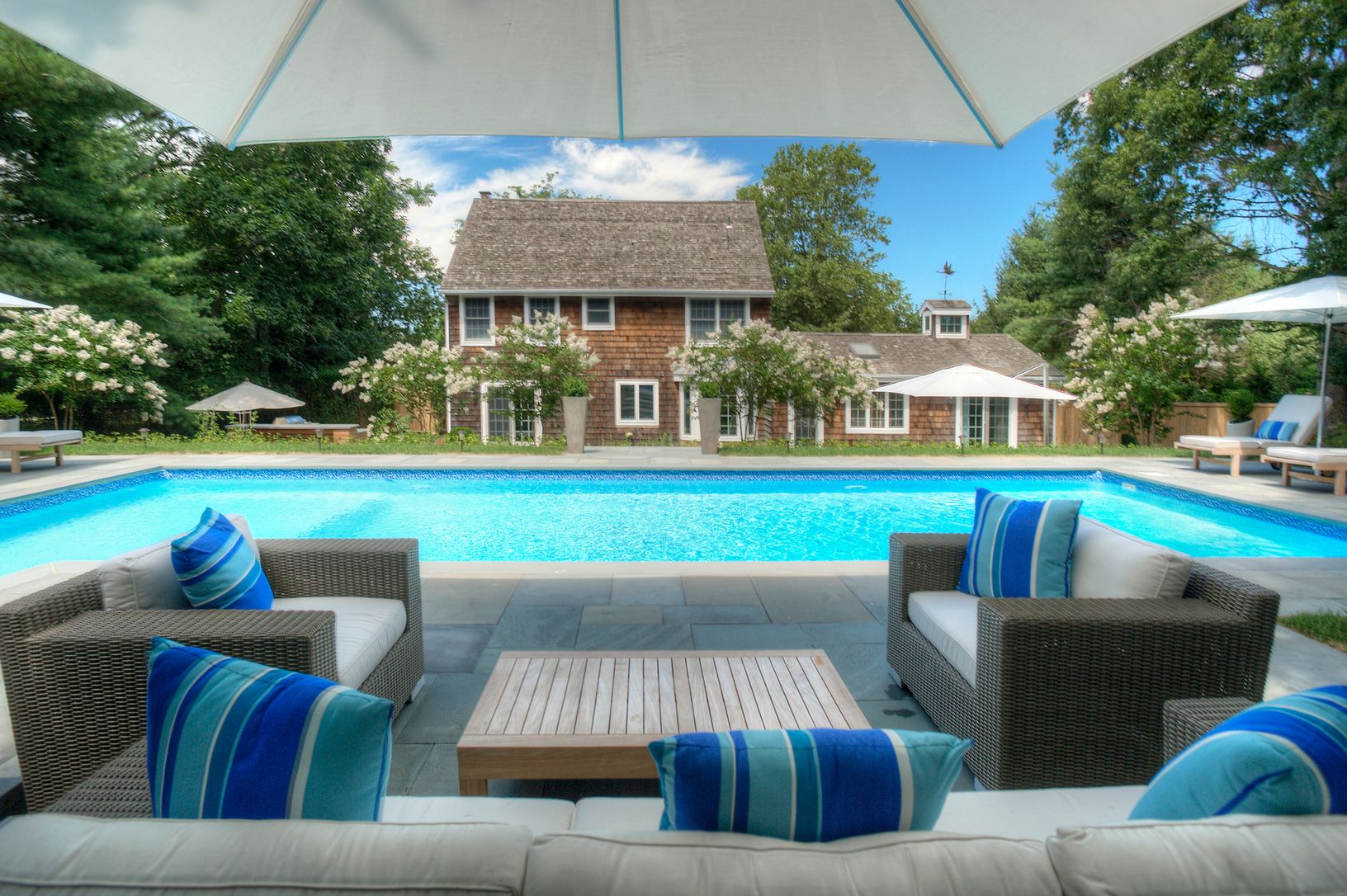 Rental Registration #: 18-1030 This summer retreat is all about the outdoor entertaining.......but wait, the interior is beautiful. 5 bedroom, master on the first floor, 3 and a half bath traditional home surrounded by a terrific patio with custom kitchen, fire pit and heated gunite 44 foot pool. The private community has 2 tennis courts and all of this is minutes to the Village and it's famed beaches..