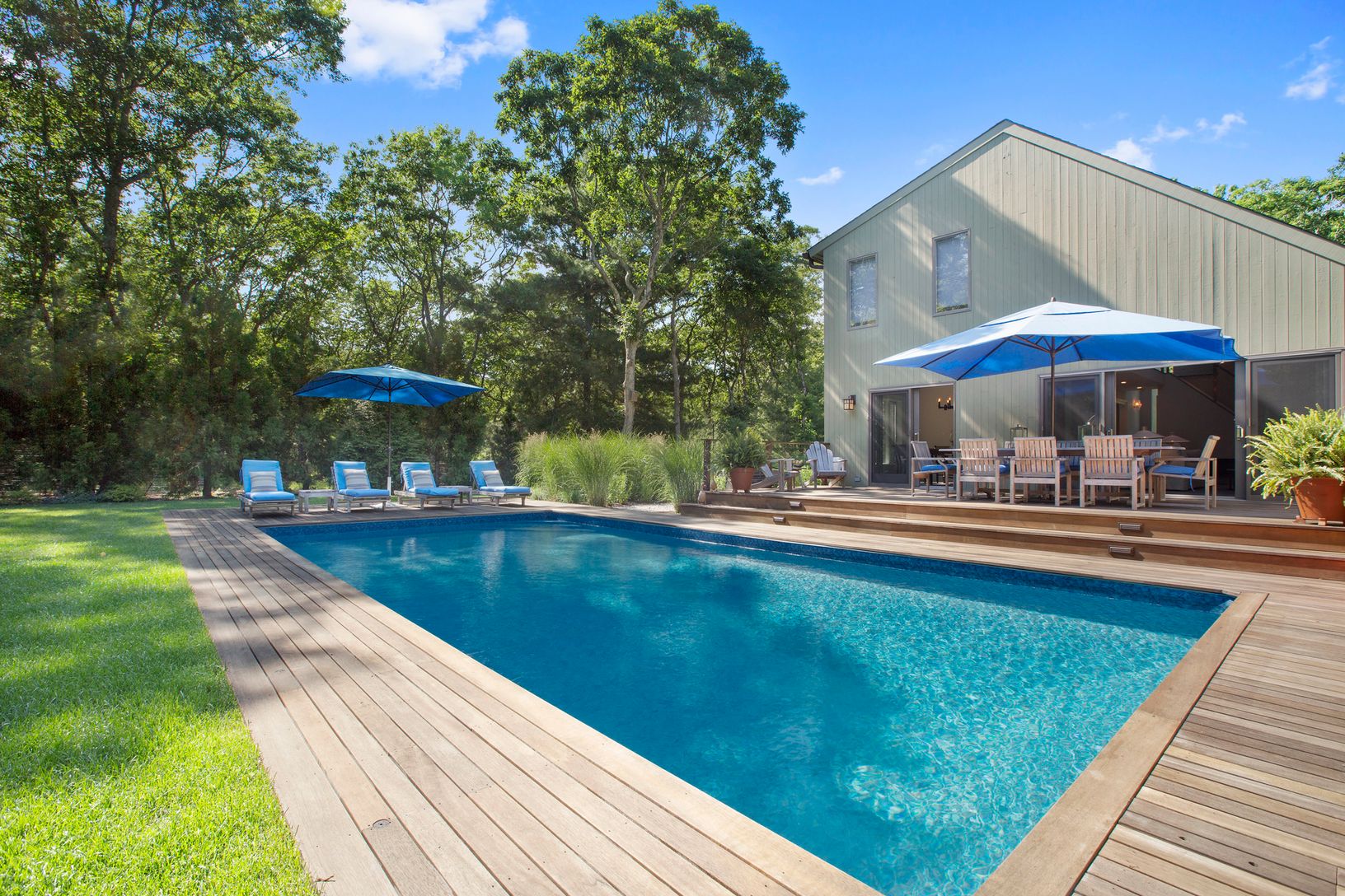 Rental Registration #: 18-1240 Newly renovated and chicly decorated East Hampton contemporary saltbox on 2.1 acres in the Northwest Woods is in pristine condition. Offering three bright and spacious bedrooms and three stylish bathrooms this home's set up is perfect for summer living. A Large living room with a custom fireplace opens onto expansive mahogany decking accented by the heated, sparkling, bright blue pool. The kitchen features and ar