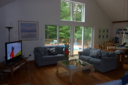 Rental Registration #: 18-1662. An attractive home situated on 5 full acres of property with heated pool and har-tru tennis court. 4 bedrooms and 3 bathrooms - including a large master, plus large living area combo, dining area and kitchen. Central air conditioning, fireplace, basement, gas heating system, outdoor shower, deck, porch, and new landscaping. Updated for 2020.